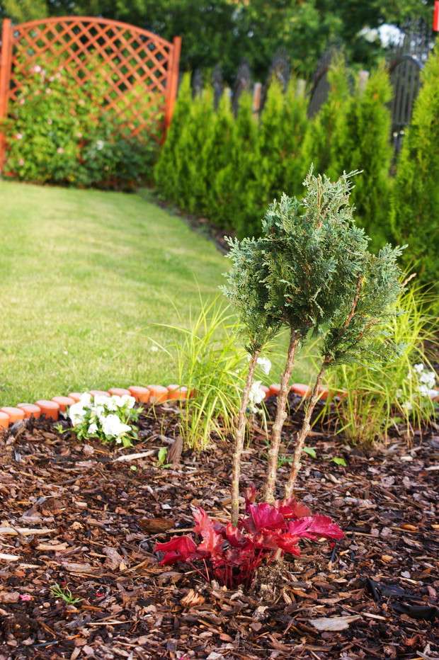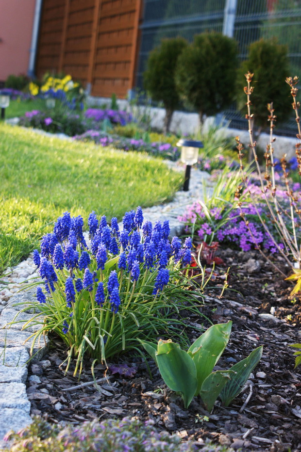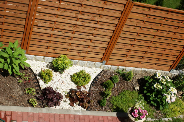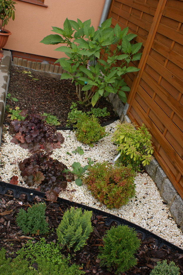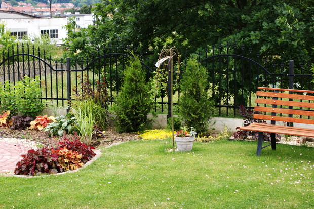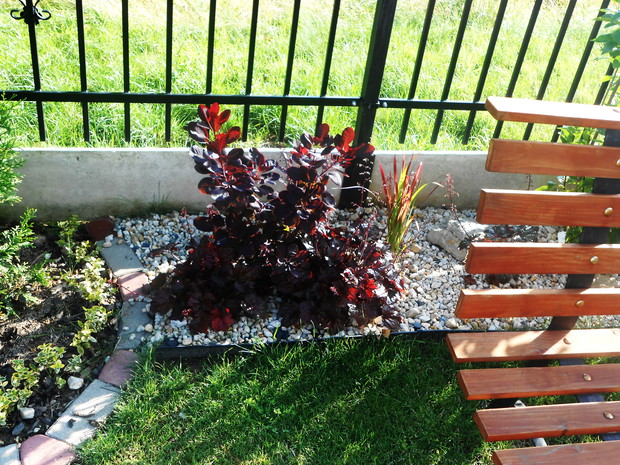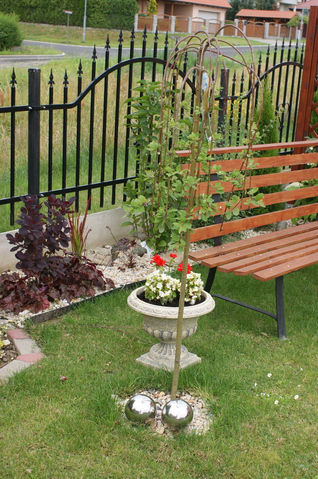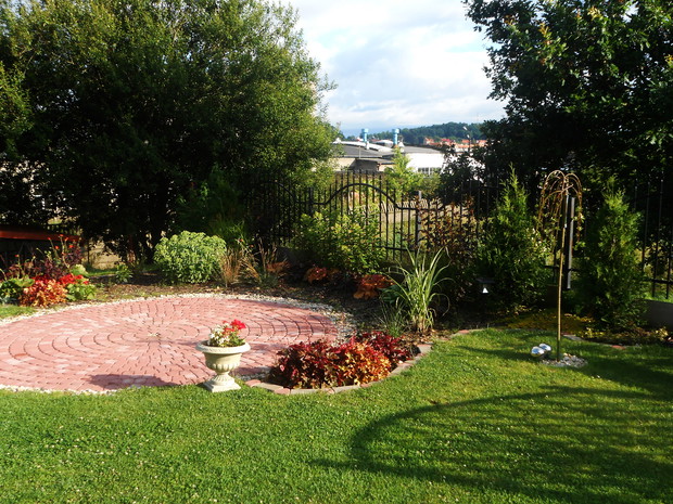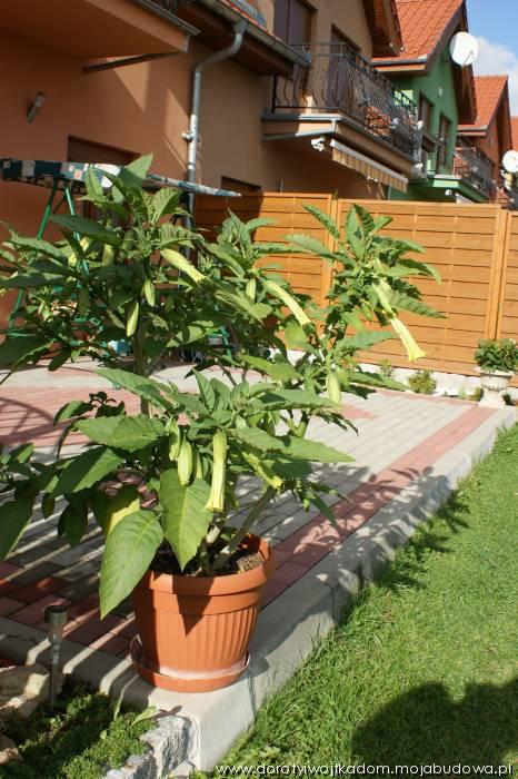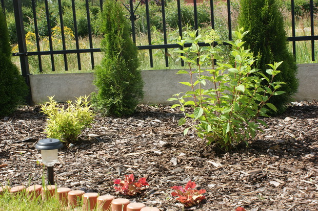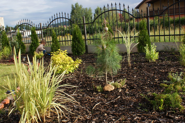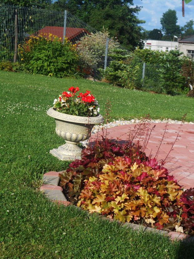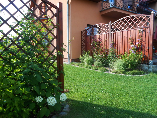 Do nowego domu wprowadziliśmy się w maju 2012 r. Dopiero wtedy na dobre zaczęliśmy urządzać nasz ogród i trwa to do dziś..... Pomysły są głównie moje, a męskiej części rodziny - wykonanie ;) Na początku nie było łatwo, bo ziemia miejsce w ogóle nie nadawało się do nasadzeń. Mieliśmy tutaj głównie glinę i gruz. Nawet nie wiem, ile worków ziemi, piachu i kompostu zużyliśmy, by rośliny mogły tutaj rosnąć!!! Niestety ogródkowi wiele jeszcze brakuje do doskonałości... Ciągle coś dosadzam i przesadzam. Uwielbiam hortensje, żurawki i trawy. Rosną u nas wzdłuż ogrodzenia tuje, które z czasem dadzą trochę cienia. Od rana do wieczora mamy słonko,więc wybór roślin był dość ograniczony. Hortensje Limelight to moja chluba w sezonie letnim, podobnie jak lilie i żurawki Marmelade. W jednej części wyłożyliśmy kostkę w kształcie okręgu, na obwodzie posadziłam rośliny, co dało trochę urozmaicenia i koloru. Obok stanęła ławeczka i pergola, po której pną się róże. Większą część stanowi trawnik z miejscem zabaw dla dzieci, trampoliną i basenem w sezonie letnim. Dolna część ogródka to część bardziej gospodarcza - stoi tutaj altanka, drewutnia i jest miejsce na kilka grządkę z truskawkami. Schody i zejście zrobiliśmy z podkładów kolejowych. W tym sezonie nastąpi jeszcze kilka zmian, bo mam zamiar założyć dwie nowe rabatki.