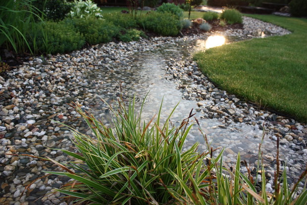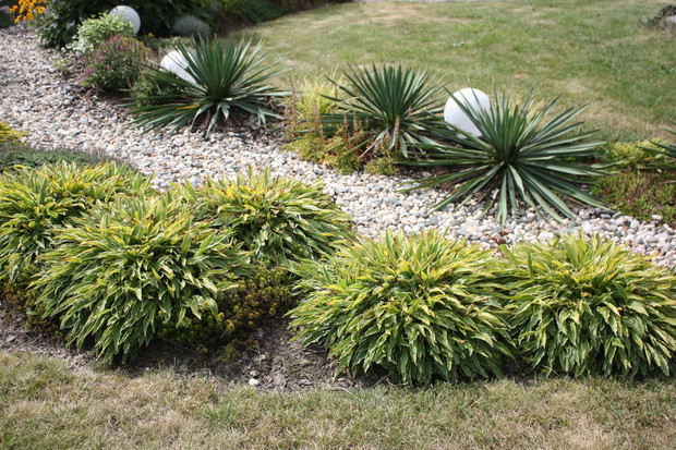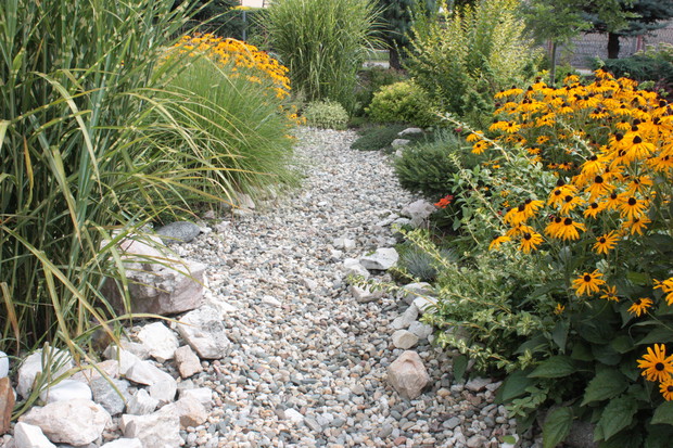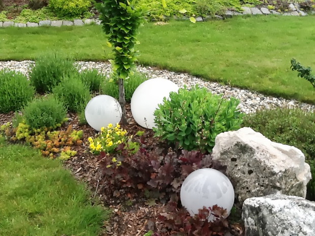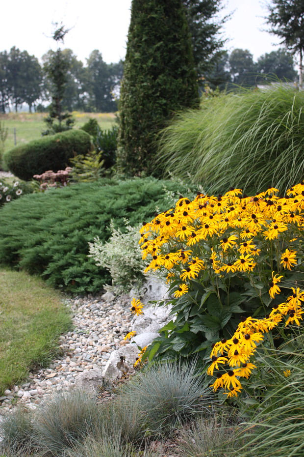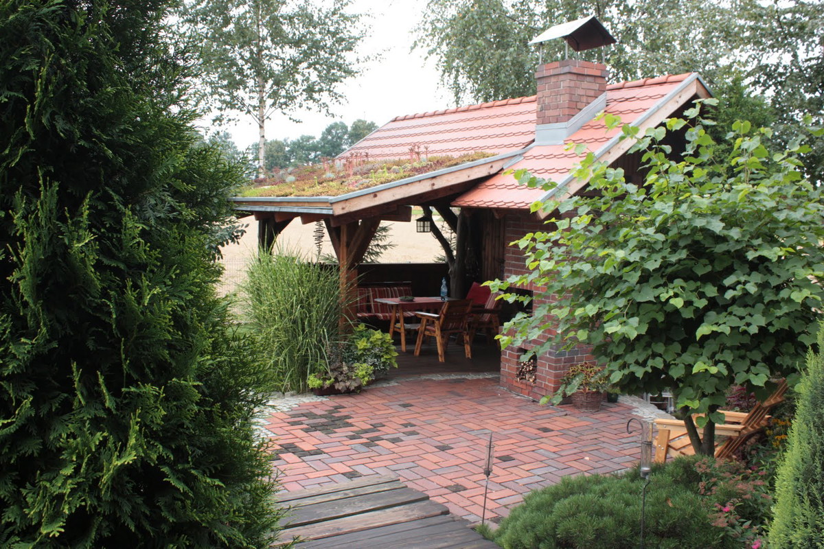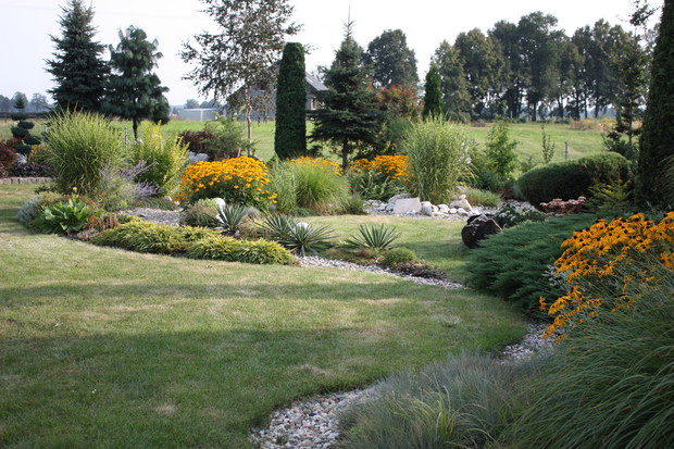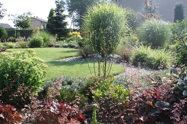 Nasz ogród ma już prawie 10 lat. Od podstaw tworzony jest samodzielnie przez całą rodzinę, bez pomocy "fachowców" z czego jesteśmy szczególnie dumni. Ulubionymi roślinami są ozdobne trawy i żurawki. Co roku wiele się w ogrodzie zmienia, stale przybywają nowe i ciekawe rośliny, ciągle też pojawiają się nowe pomysły. Jednym z nich jest tzw. sucha rzeka, która w deszczowe dni wypełnia się wodą. Oprócz kamieni pełno w niej muszelek. które przywozimy z wakacji a szukaniem i zbieraniem ich zajmują się dzieci. Trzy lata temu powstała bardzo funkcjonalna altana z grilem dodatkowo przyozdobiona zielonym dachem. Dzięki niej nawet w pochmurne, deszczowe dni lub wieczory możemy spędzać czas w ogrodzie. Ogród to nasz drugi DOM.