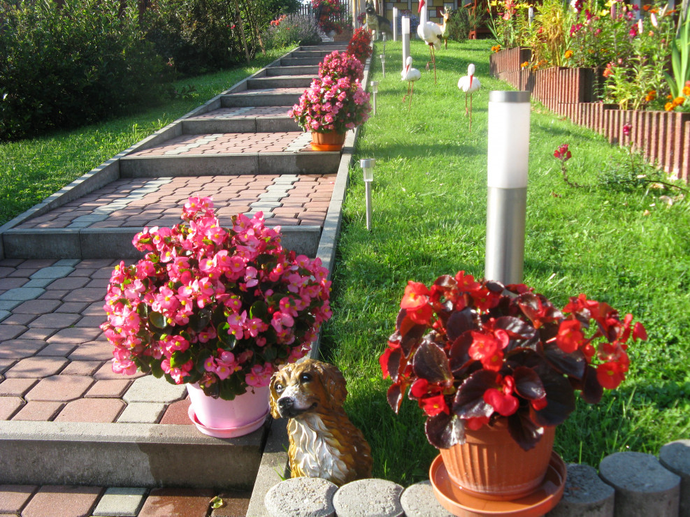 moj ogrod jest malutki ,ale bardzo jestem z niego dumna. jest w nim przedewszystkim duzo lilii ,surfini pelargoni ,niecierpki,i wiele innych kwiatow wieloletnich. Na wiosne bardzo sie staram posadzic w doniczkach jak najwiecej kwiatow aby cieszyc sie urokiem swojej pracy az do jesieni ,do pierwszych przymroskow..Kwiaty wymagaja duzo pracy i pielegnacji ale warto ,odwdzieczaja sie swoim pieknym ukwieceniem.Mam sarenke ,ktura jest urocza,bociana i 2 male .Oraz duzego wilczora ktory dumnie stoi na strazy i pilnuje swojego domu..Wspolnie z rodzina lubimy usiasc w ogrodzie i porozmawiac ,zapalic grila i cieszyc sie urokiem malego ale kolorowego i pieknego moim zdaniem ogrodu.Wspolnie omawiamy co w nastepnym roku zmienic aby bylo jeszcze bardziej przyjemnie