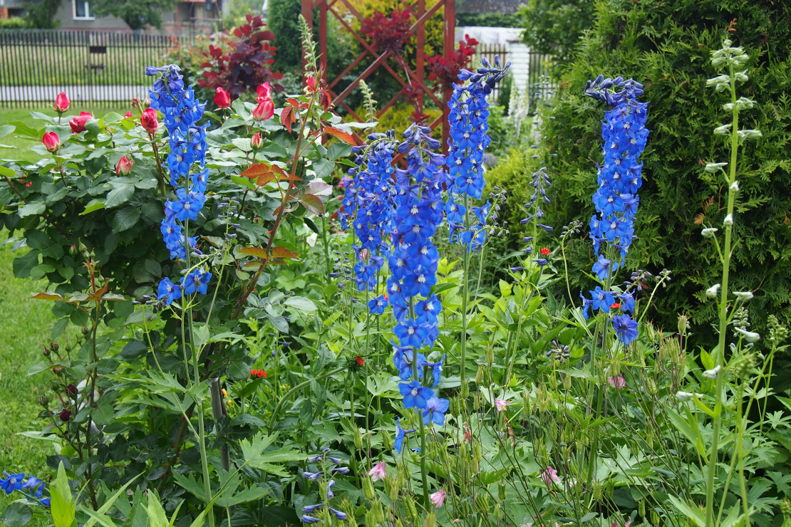 Powoli peonie i orliki ustępują miejsca kwiatom takim jak : naparstnice i ostróżki .