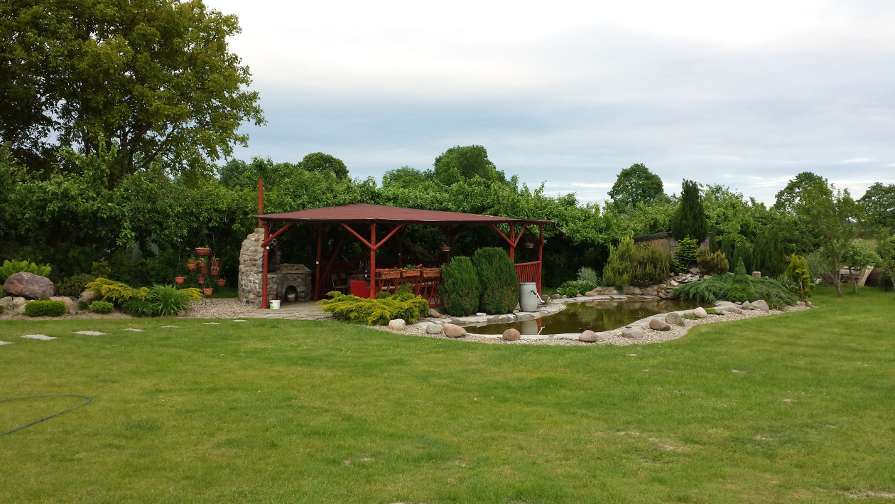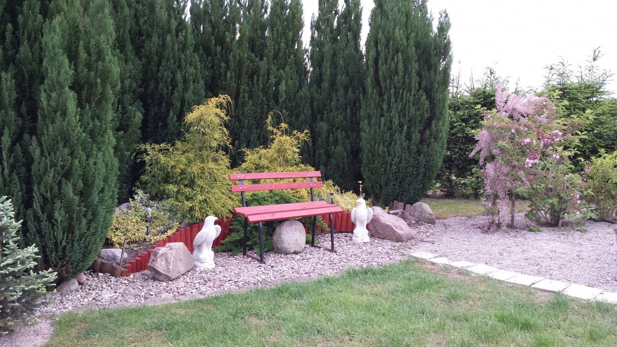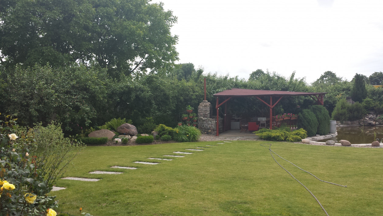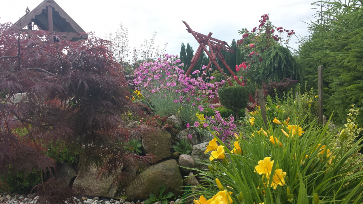 Ogród wraz z domem jednorodzinnym wybudowanym własnoręcznie powstał 9 lat temu. Na działce znajduje się wielki staw o powierzchni 0,8 ha .Na stawie wybudowaliśmy altanę oraz pomost na drugą stronę działki. Obok domu znajduje się wielki sad wieloowocowy, warzywniak wraz z namiotem z plexy oraz zamykana altana schowana przed słońcem wśród drzewek. Na środku działki wybudowaliśmy żelbetonowe oczko wodne, altanę drewnianą otwartą wraz z kamiennym grillem. Nie zabrakło również miejsc gdzie można usiąść i odpocząć- liczne ławeczki w sadzie, hamak czy też ławka bujana. W ogrodzie znajduje się kilka skalniaków na których rośnie wiele gatunków iglaków, kwiatów oraz róż. Większość roślin rozmnażam sama. Wszystkie prace w ogrodzie wykonujemy sami na tyle na ile pozwala na to czas, siły oraz pogoda. Jest jeszcze dużo powierzchni niezagospodarowanej obsianej trawą ale to z czasem zapewne się zmieni jeśli tylko będą nowe pomysły.
