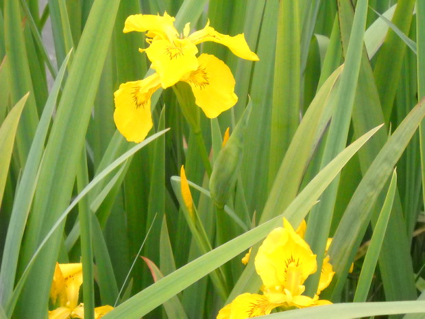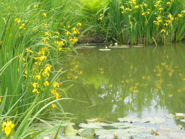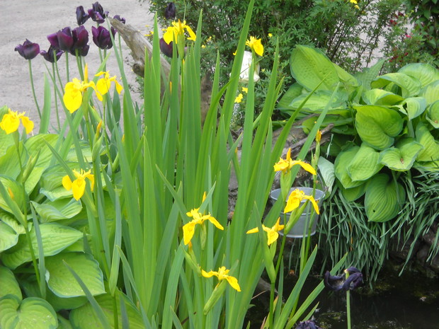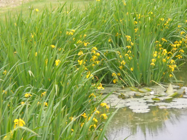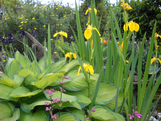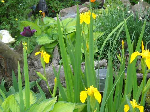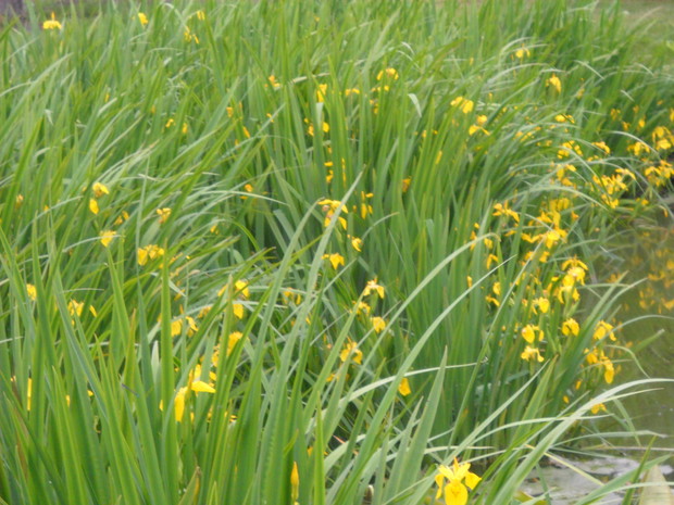 Irys wodny(Kosaniec żółty)obrasta brzegi naszego stawku te piękne i delikatne kwiatki dekorują nie tylko stawek ale również nasze oczka wodne.Bardzo ładnie się prezentują z osadzonymi funkiami.Bardzo szybko się rozrastają i są łatwe w uprawie,mogą również rosnąć na zwykłej rabacie ale nie rozrastają się tak szybko jak w mokrym podłożu.