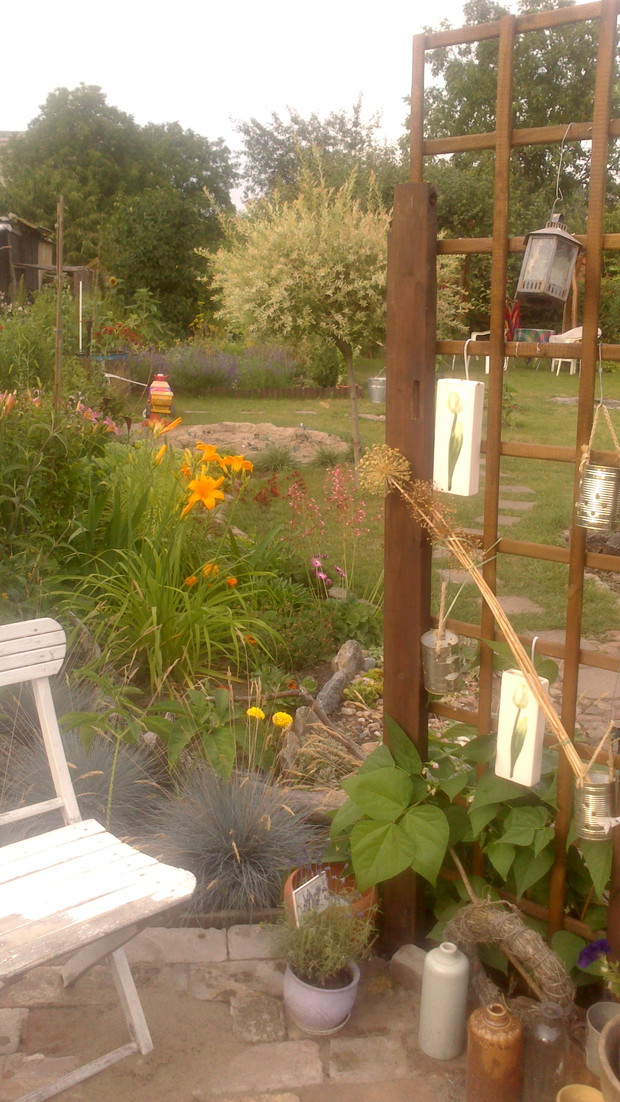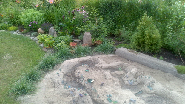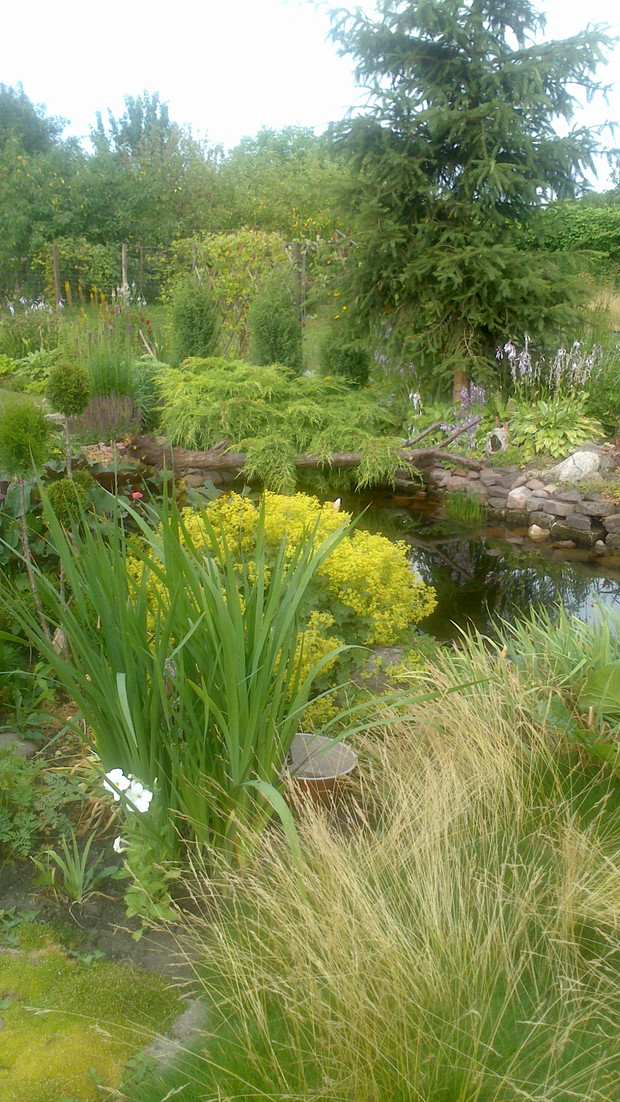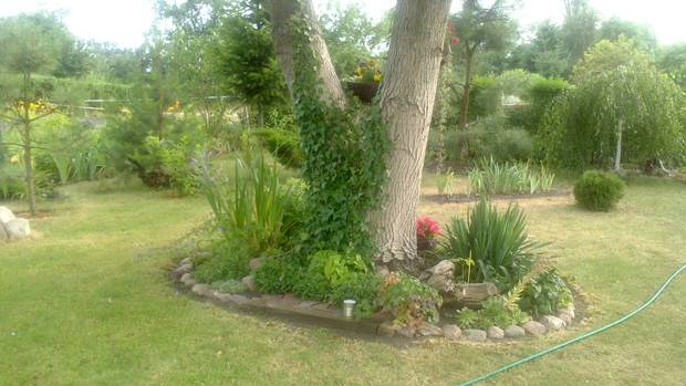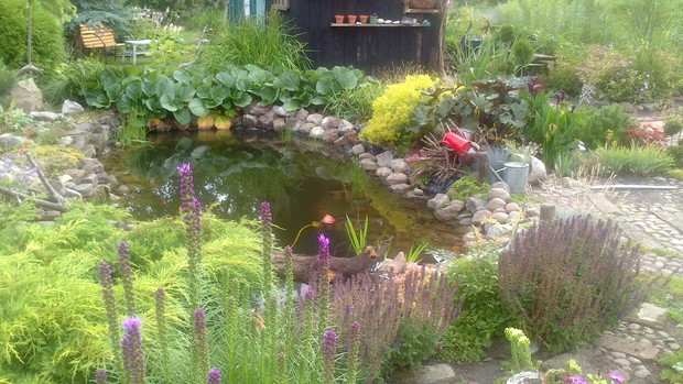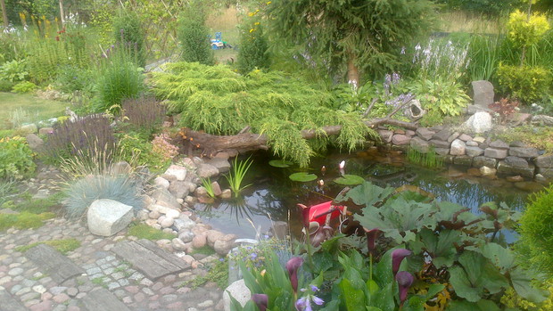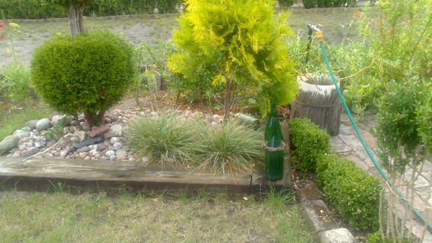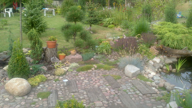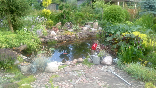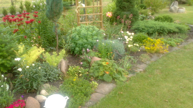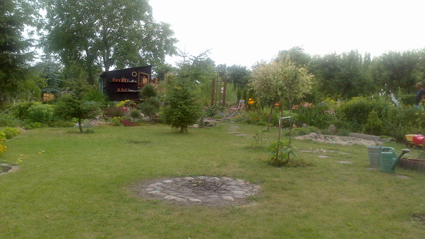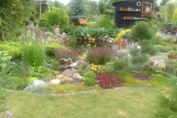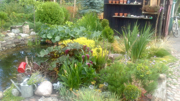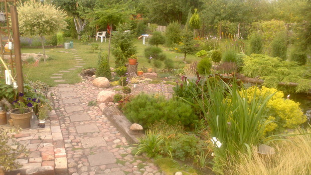 Jestem zachwycona naturalnym ogrodem mojej koleżanki! Kiedy oglądam w telewizji promowane ogrody snobów, gdzie w roli głównej występuje droga architektura i aranżacje - aż dziwię się, że pomysłowością i minimalnym nakładem środków można stworzyć taką bajkową enklawę, jaką udało stworzyć się mojej koleżance. Ogród znajduje się w Kruszwicy. Działka to prostokąt 10m/70m. Pośrodku stoi mała altanka i domek narzędziowy, które naturalnie dzielą ogród na dwa pokoje. Najbardziej lubię siedzieć w drugiej części ogrodu, skąd rozpościera się widok na całą powierzchnię działki oraz malownicze oczko wodne z rybkami, żabami i grążelami. Wokół oczka rośnie mnóstwo gatunków różnych roślin, które właścicielka dobiera posługując się absolutną intuicją ogrodniczą, zdobytą wieloletnimi doświadczeniami i zabawą roślinami. Aranżując zazielenianie w ogrodzie właścicielka często posługuje się ich nazwami "roboczymi", dopiero później zdobywa fachową wiedzę w literaturze. Najbardziej w ogrodzie zachwyca mnie to, że wiele ozdób jest zrobionych tak po prostu, "z niczego" - p. Joli się zawsze wszystko "przyda" i tam przedmioty odzyskują swoją drugą duszę. W swoim ogrodzie właścicielka pomyślała także o miejscu zabaw dla swojego wnuka - piaskownica jest niebanalna, wykopana w ziemi i otoczona również pięknymi roślinami. Wszystkie ozdoby wykonane są z naturalnych surowców - korzeni, kamieni, patyków. Wykorzystane są także stare cegły, butelki czy metalowe puszki, z których zrobiono nastrojowe lampiony. Przez całą działkę wije się kamienna ścieżka własnoręcznie zrobiona przez właścicielkę z polnych kamieni. Zastosowanie znalazły tu także podkłady kolejowe, gliniane naczynia i różne bibeloty, którym zwykle kończy się żywot w mieszkaniach. Ten ogród ma duszę... P. Jola urządza go minimalnymi nakładami finansowymi, za to widać tu wielką pasję i miłość do tego ogrodu. Piękny jest ten ogród. Magiczny ogród. Jej ogród... :)