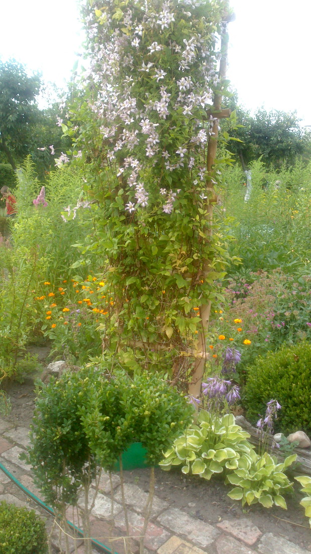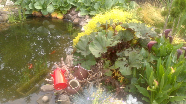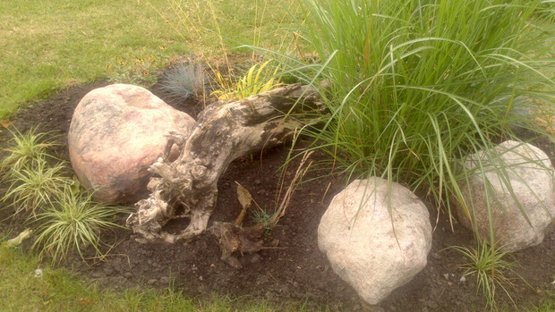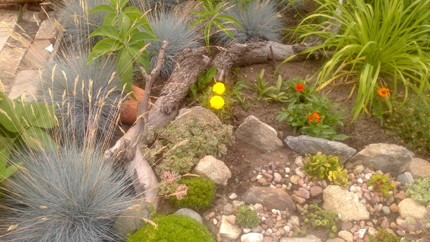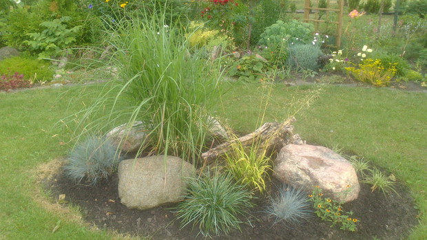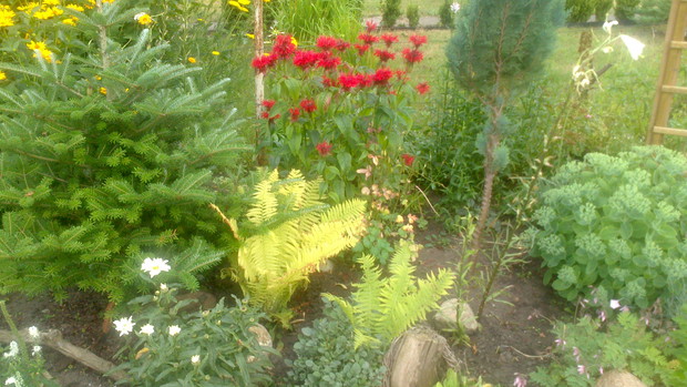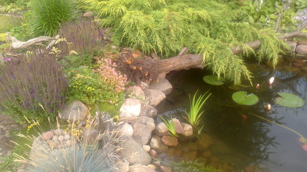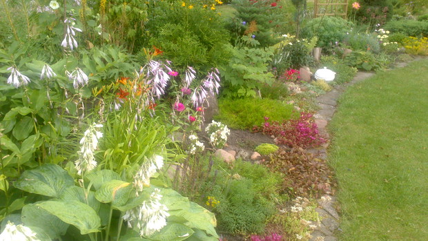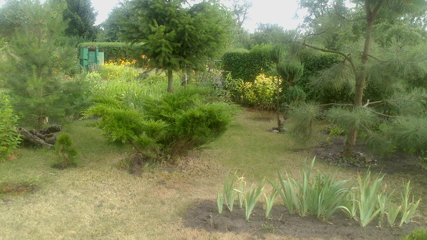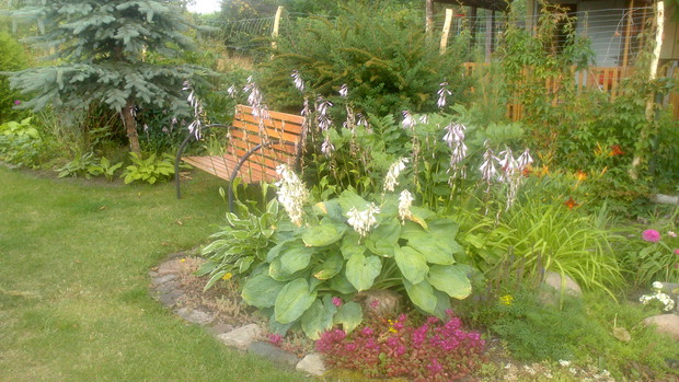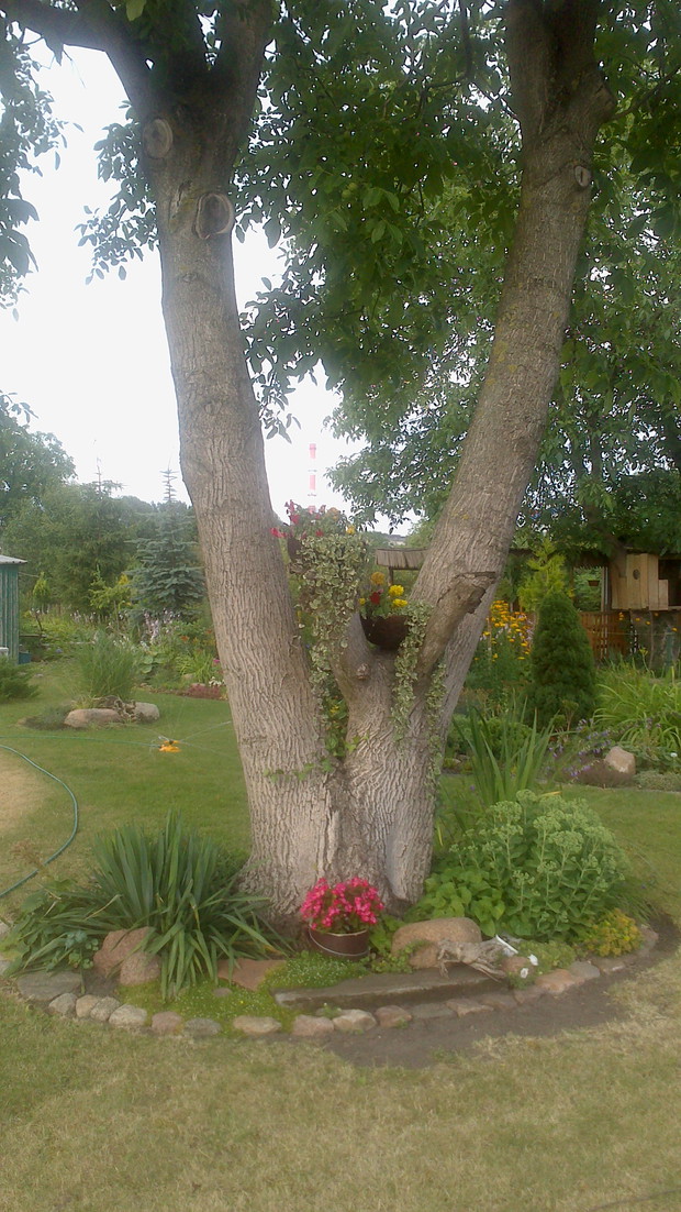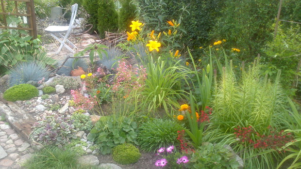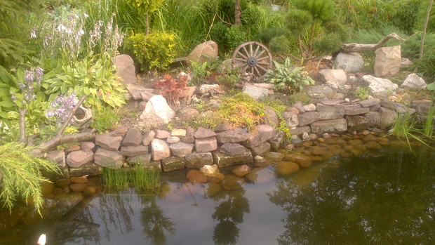 Jestem zachwycona naturalnym ogrodem mojej koleżanki! Kiedy oglądam w telewizji promowane ogrody snobów, gdzie w roli głównej występuje droga architektura i aranżacje - aż dziwię się, że pomysłowością i minimalnym nakładem środków można stworzyć taką bajkową enklawę, jaką udało stworzyć się mojej koleżance. Ogród znajduje się w Kruszwicy. Działka to prostokąt 10m/70m. Pośrodku stoi mała altanka i domek narzędziowy, które naturalnie dzielą ogród na dwa pokoje. Najbardziej lubię siedzieć w drugiej części ogrodu, skąd rozpościera się widok na całą powierzchnię działki oraz malownicze oczko wodne z rybkami, żabami i grążelami. Wokół oczka rośnie mnóstwo gatunków różnych roślin, które właścicielka dobiera posługując się absolutną intuicją ogrodniczą, zdobytą wieloletnimi doświadczeniami i zabawą roślinami. Aranżując zazielenianie w ogrodzie właścicielka często posługuje się ich nazwami "roboczymi", dopiero później zdobywa fachową wiedzę w literaturze. Najbardziej w ogrodzie zachwyca mnie to, że wiele ozdób jest zrobionych tak po prostu, "z niczego" - p. Joli się zawsze wszystko "przyda" i tam przedmioty odzyskują swoją drugą duszę. W swoim ogrodzie właścicielka pomyślała także o miejscu zabaw dla swojego wnuka - piaskownica jest niebanalna, wykopana w ziemi i otoczona również pięknymi roślinami. Wszystkie ozdoby wykonane są z naturalnych surowców - korzeni, kamieni, patyków. Wykorzystane są także stare cegły, butelki czy metalowe puszki, z których zrobiono nastrojowe lampiony. Przez całą działkę wije się kamienna ścieżka własnoręcznie zrobiona przez właścicielkę z polnych kamieni. Zastosowanie znalazły tu także podkłady kolejowe, gliniane naczynia i różne bibeloty, którym zwykle kończy się żywot w mieszkaniach. Ten ogród ma duszę... P. Jola urządza go minimalnymi nakładami finansowymi, za to widać tu wielką pasję i miłość do tego ogrodu. Piękny jest ten ogród. Magiczny ogród. Jej ogród... :)