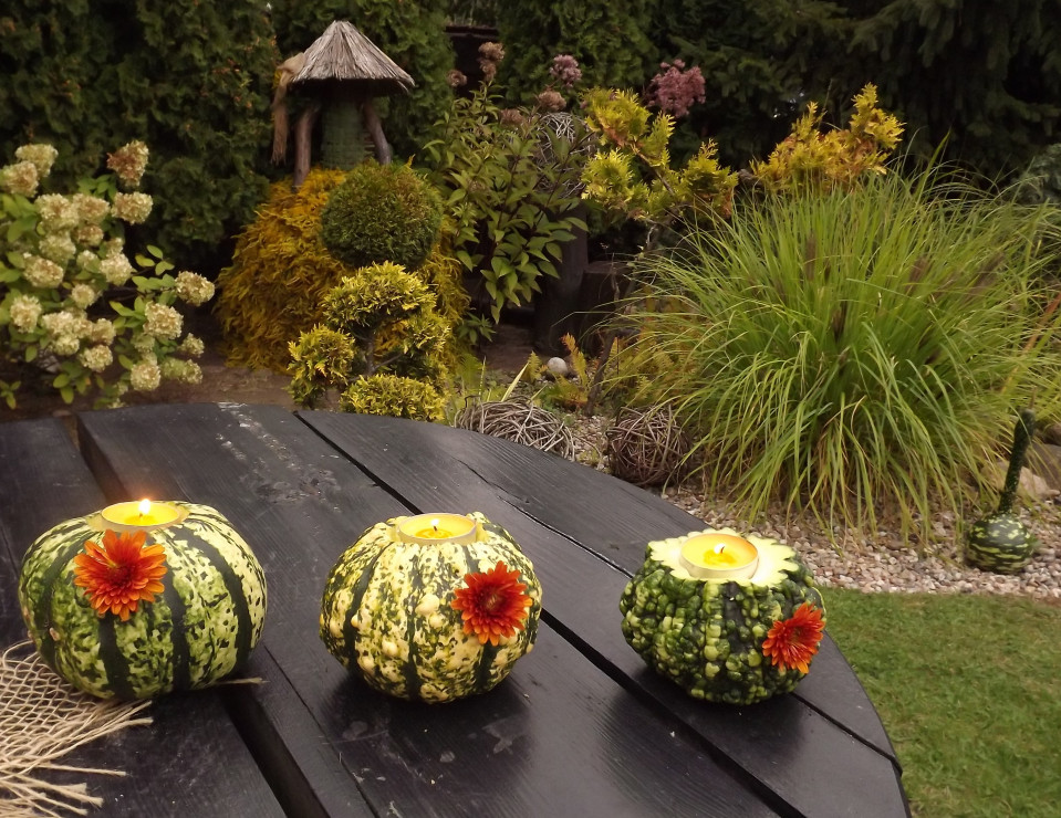 Każda, nawet najpiękniejsza kobieta lubi kosmetyki, biżuterię i piękne kreacje. W nich czuje się jeszcze piękniejsza i dowartościowana. Nie inaczej jest z ogrodem, który choćby najpiękniejszy, prawdziwego uroku nabiera dopiero po przystrojeniu. To moja dewiza, którą od lat stosuję we własnym ogrodzie. Zimą, wiosną, latem ogród zmienia stroje niczym piękna dama. Ale jesienią staje się naprawdę wyjątkowy. Bogactwo materiałów, roślin, z których mogę tworzyć ozdoby jest nie do przecenienia. Do tego jeszcze paleta jesiennych barw daje wielkie możliwości. Dekoracje ogrodowe to nie są dla mnie tylko zwykłe przedmioty. Każdy z nich ma swoją małą historię, z każdym związana jest jakieś krótkie wspomnienie. Chociażby o pięknych chwilach kiedy na łąkach czy w lesie zbieram materiały do ich wykonania. Widząc szyszki, ciekawie wygięte gałęzie, oczami wyobraźni już tworzę dekoracje, w których mogą być użyte. To niesamowite uczucie, które daje mi radość, pobudza zmysły i rozpala wyobraźnię. Praca nad dekoracjami, składanie w całość tego co nazbieram, to chwile równie wyjątkowe. Dają mi poczucie wolności i pozwalają urzeczywistnić wszystko to, co kryje się w mojej duszy. To co tworzę ozdabia ogród aż do późnej jesieni i pierwszych przymrozków. Całą jesień kiedy ogród tak pięknie się zmienia i przygotowuje do zimowego snu, dekoracje mu towarzyszą i ozdabiają praktycznie każdy jego zakątek. Staram się aby były w nim zatopione, wkomponowane w rośliny i dyskretnie podkreślały jego walory......