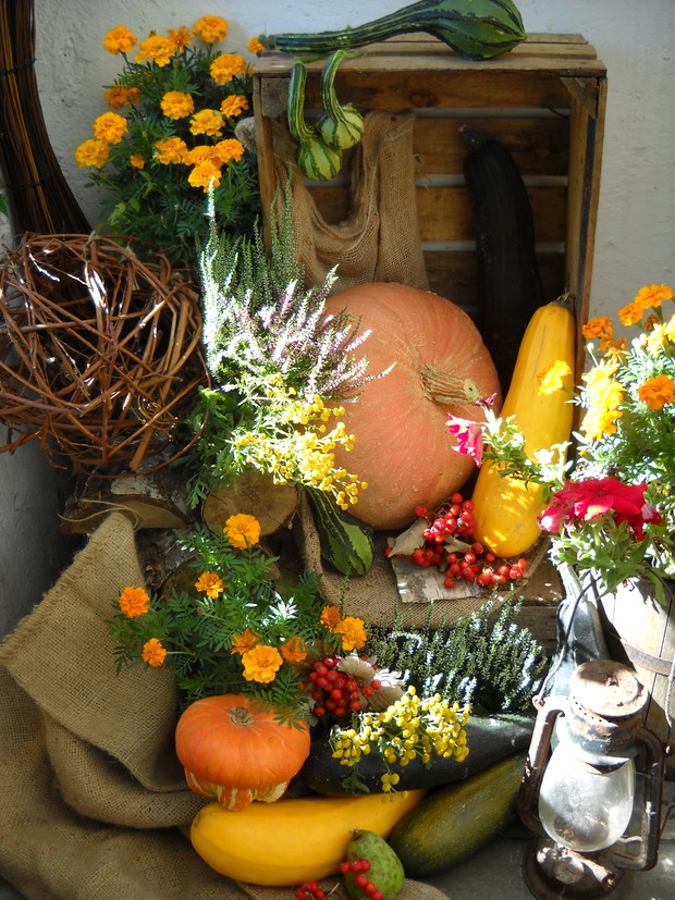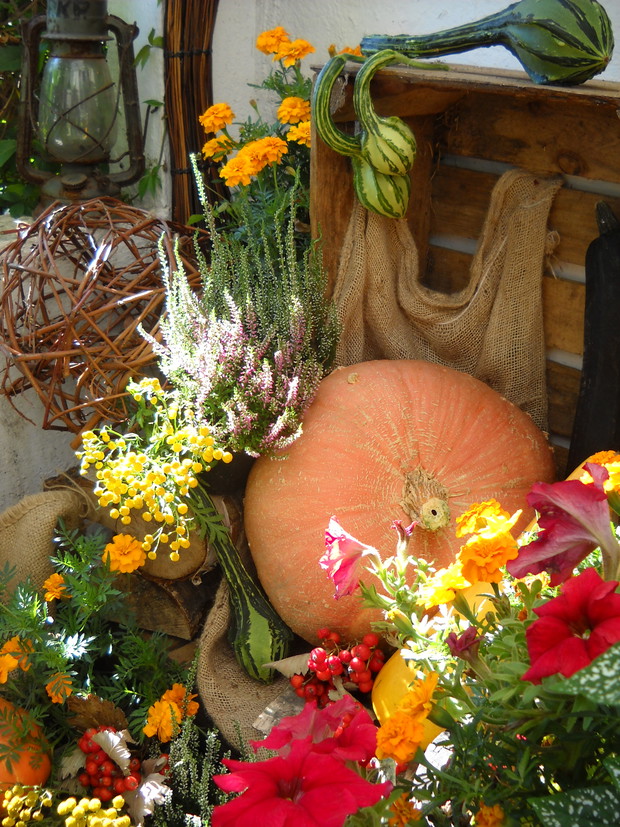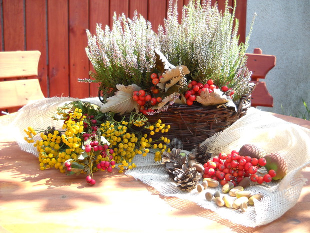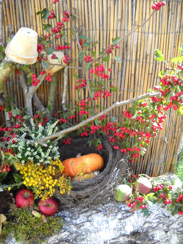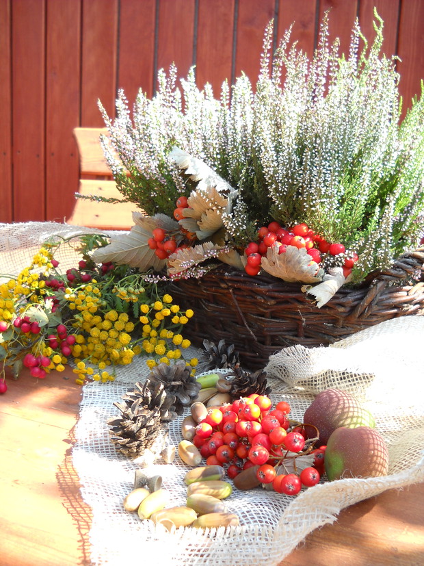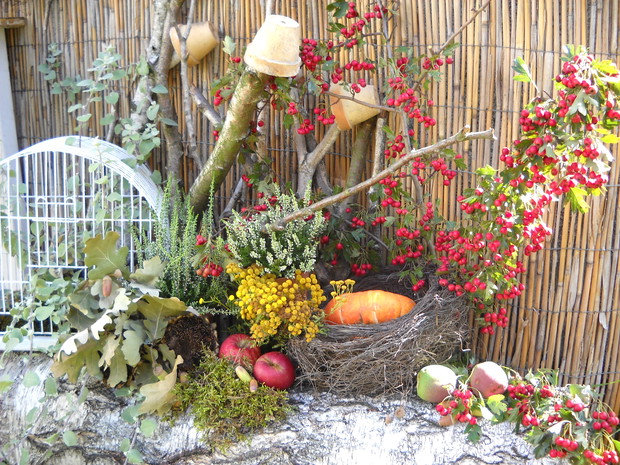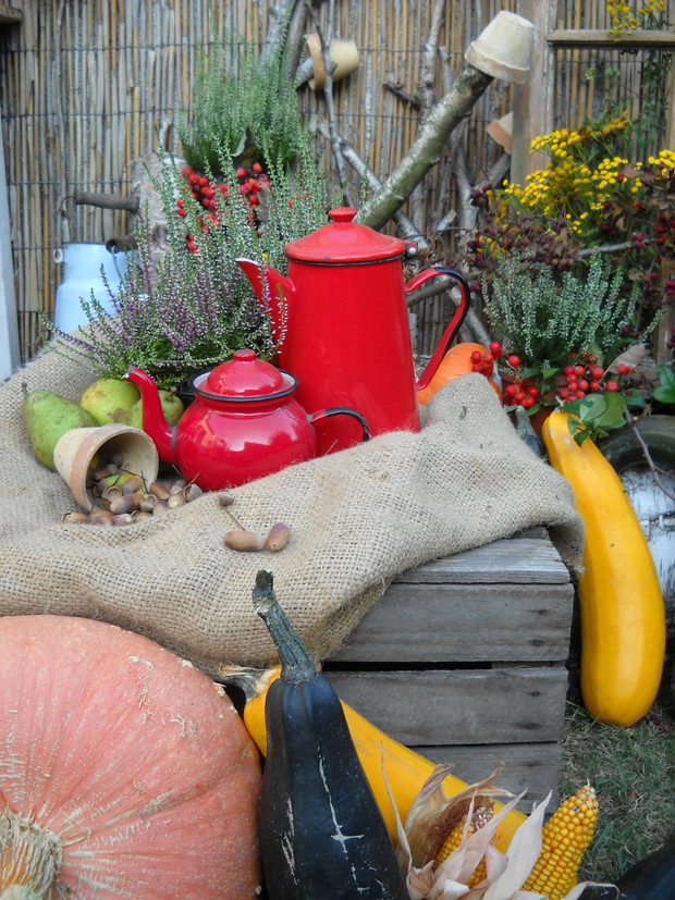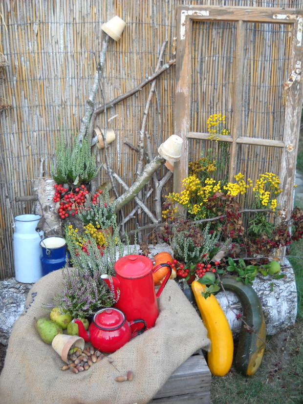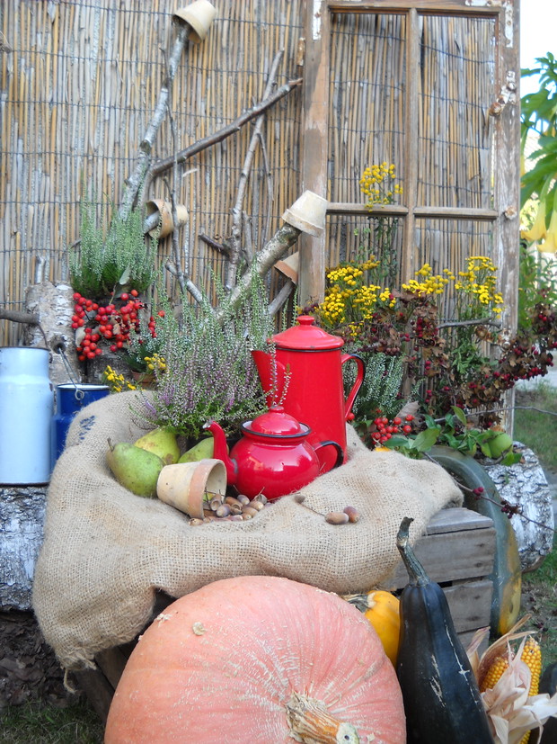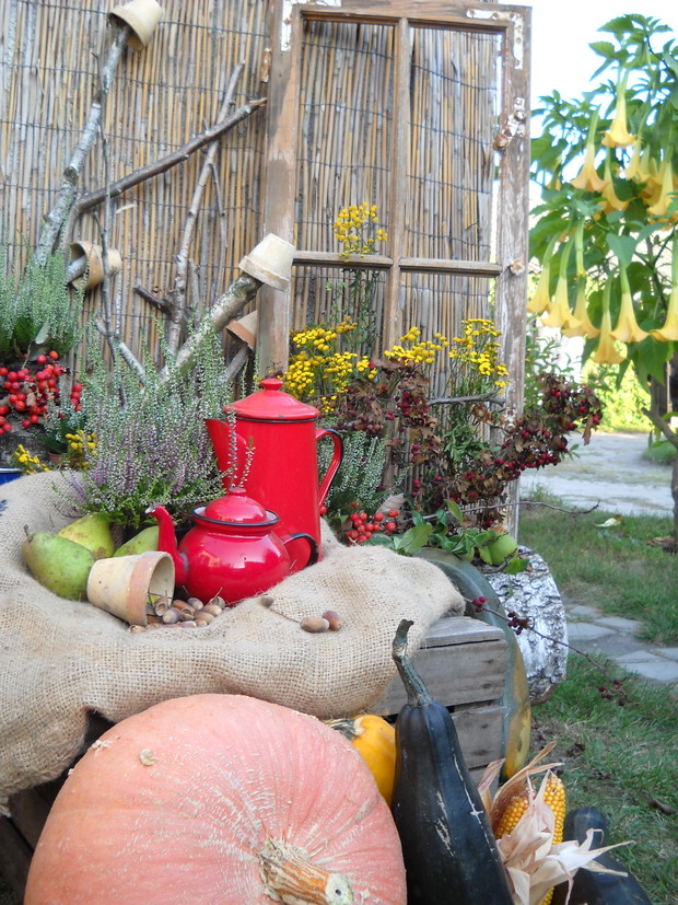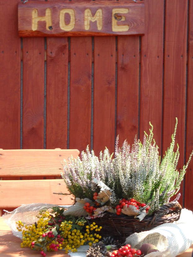 To jest to co lubię robić najbardziej komponować i dekorować.Tworzę dekoracje w naszym zakątku zgodnie z nadchodzącą porą roku.Wykorzystuje do dekoracji dary natury.Zbieram żołędzie szyszki oraz różne kawałki gałęzi jak i kory drzew.Jesień to szczególnie barwna pora roku.Rośliny same w sobie nadają kolorów.