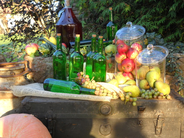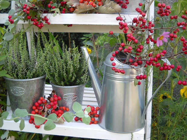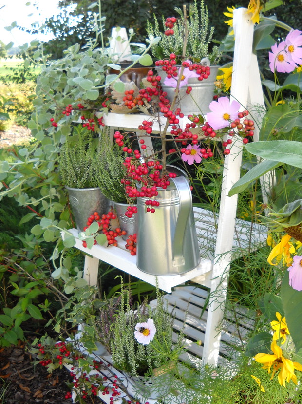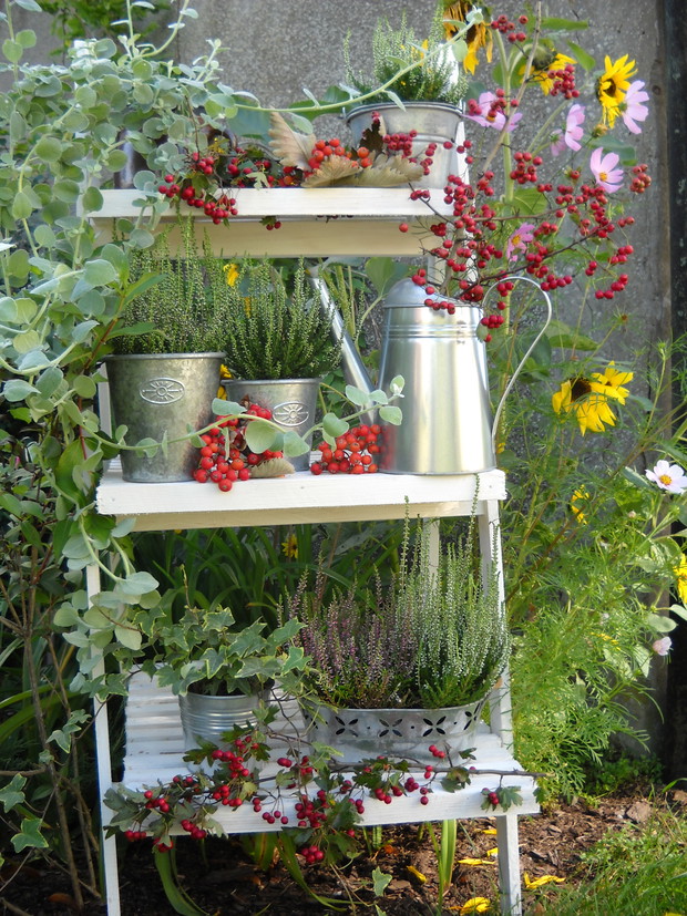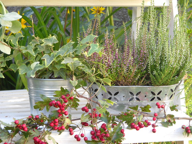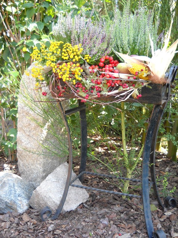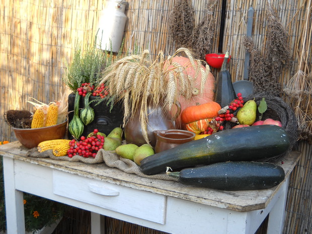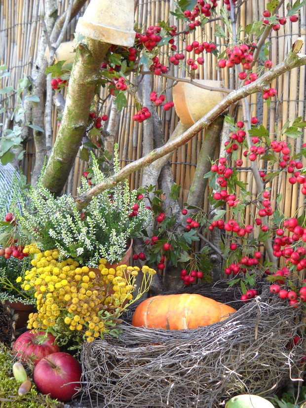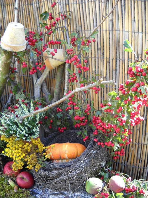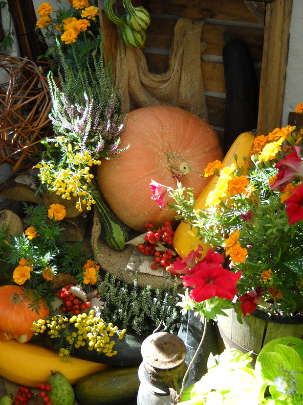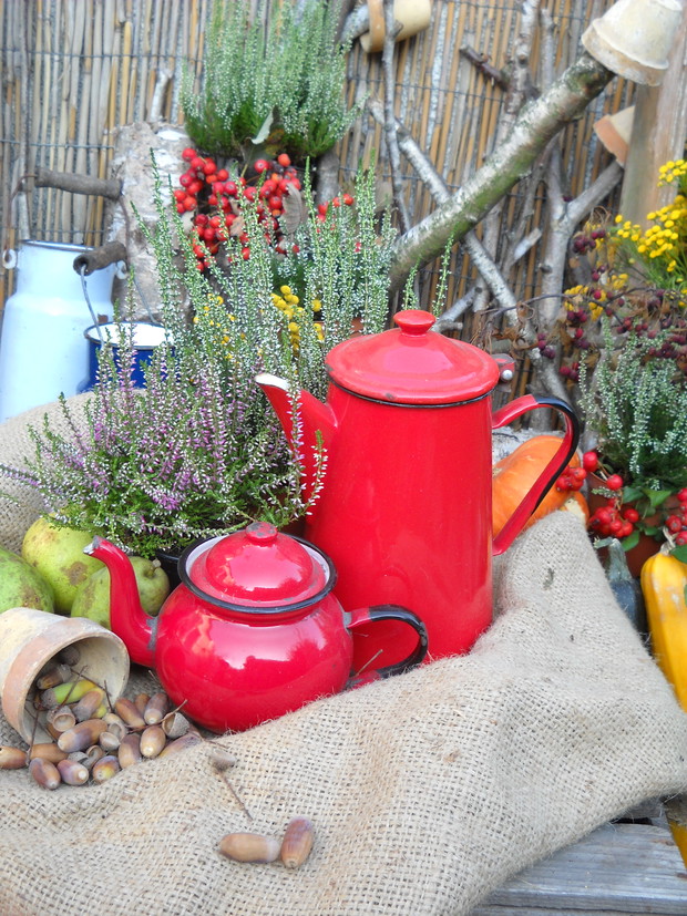 To jest to co lubię robić najbardziej komponować i dekorować.Tworzę dekoracje w naszym zakątku zgodnie z nadchodzącą porą roku.Wykorzystuje do dekoracji dary natury.Zbieram żołędzie szyszki oraz różne kawałki gałęzi jak i kory drzew.Jesień to szczególnie barwna pora roku.Rośliny same w sobie nadają kolorów.
