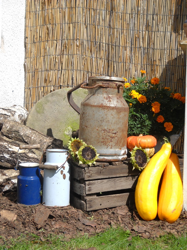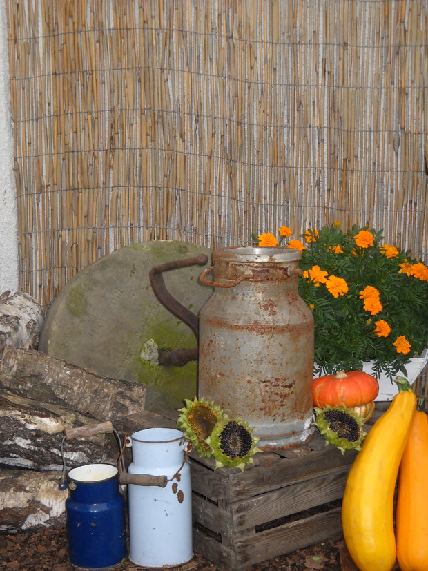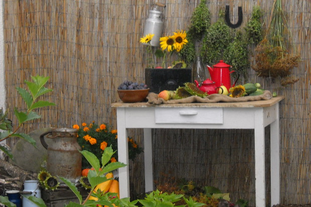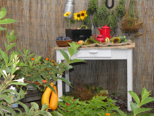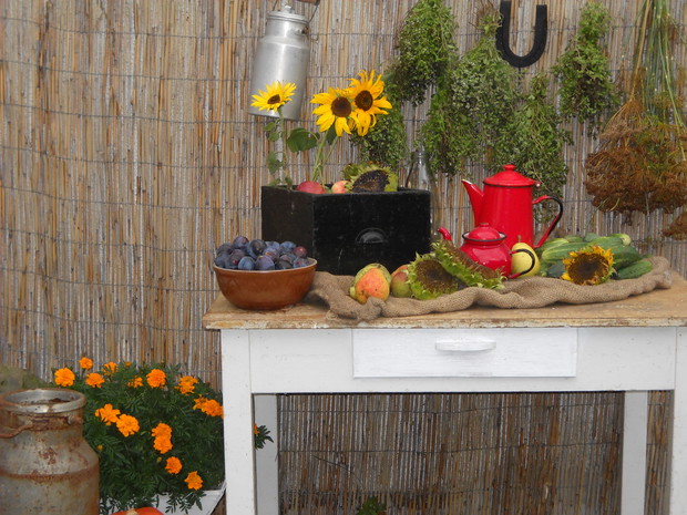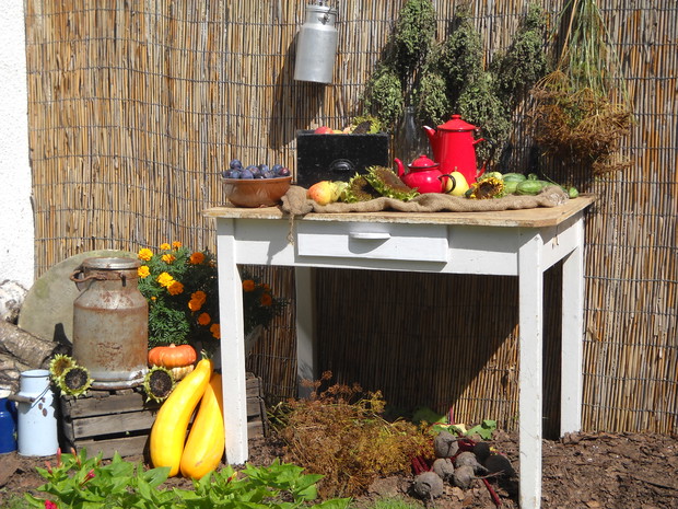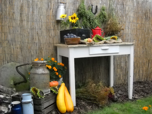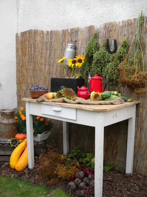 Nastająca jesień to czas w którym to zbieramy wszystkie dary z warzywniaka.Tuż przy altance znalazło się miejsce na warzywa i owoce z których staram się robić wystrój który to będzie nadawał jesiennego klimatu.Stary kuchenny stół mieści niektóre to zbiory ze sadu i warzywniaka.Reszta detali dodaje charakteru przypominając wiejską kuchnie.
