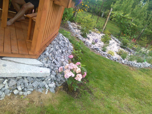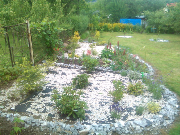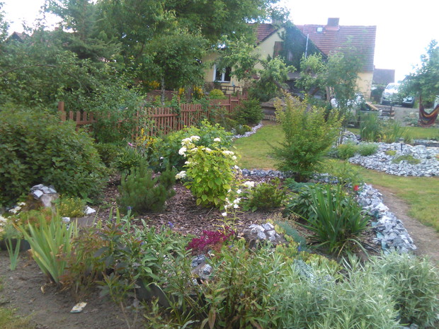 Mój mąż kupił dom wraz z działką o powierzchni 800 m2- 5 lat temu. Działka dzieli się na dwie części - mniejszą przed i większą za domem. Całość była bardzo zaniedbana. Praktycznie wszędzie rosły pokrzywy, osty, mniszki i podagryczniki. Bardzo dużo pracy włożyliśmy w to by uporządkować teren. Zaczynaliśmy od prac porządkowych. Pozbywania się roślinności ruderalnej. Do tej pory mamy problem z mchem w trawniku. Zanim zaczęliśmy nasadzenia, stworzyłam roboczy projekt tego co chciałam mieć w swoim ogrodzie. Na obrzeżach posadziliśmy tuje, jałowce, świerki. Przed nimi byliny jak, np., goździki, bergenie,dąbrówkę, gipsówkę, rojniki. Wraz z mężem w tym roku wykopaliśmy oczko wodne. Nasze rabaty otoczone są granitem, który wspaniale rozjaśnia ogród. Posadziliśmy również różaneczniki, magnolie, perukowca, szałwie, liliowce i wiele innych gatunków. Każdą wolną chwile spędzamy razem w ogrodzie. Nie mamy zbyt dużo czasu na pielęgnacje i wszelkie inne prace w ogrodzie (gdyż pracujemy z mężem za granicą). Mamy do dyspozycji tylko weekend :(. Przed domem przy tarasie rosną róże, piwonie, irysy, trzmielina. Bardzo kocham rośliny, przyrodę. Z wykształcenia jestem biologiem i myślę, że to prawdziwa moja pasja. Najważniejsze jest by robić to, co się kocha. Ogród jest dla mnie i mojego męża oazą spokoju. Czerpiemy z niego dużo radości. Sama świadomość, tego iż jest naszym dziełem napawa nas dumą.