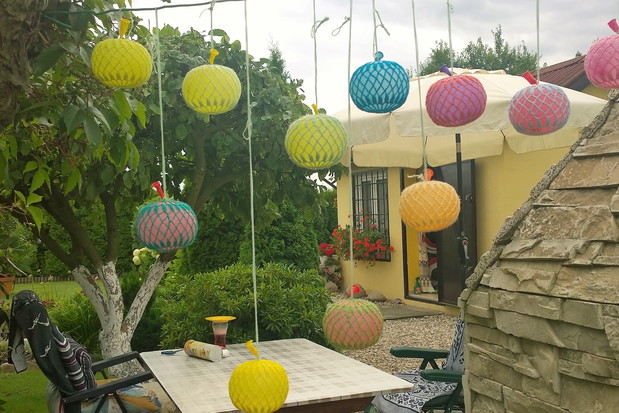 Na działce nie tylko dbamy o rośliny ,ale też przyjmujemy znajomych ,którzy bardzo chętnie nas odwiedzają żeby posiedzieć wśród zieleni ,dużo wypoczywam najczęściej z szydełkiem w ręku realizuję swoje pasje ,robię różne rzeczy ,największe zdumienie ogarneło znajomych gdy suszyły się bombki w słońcu na kolorowych balonach