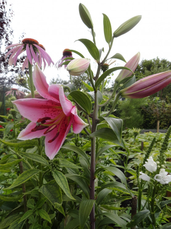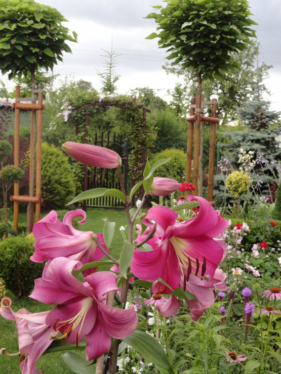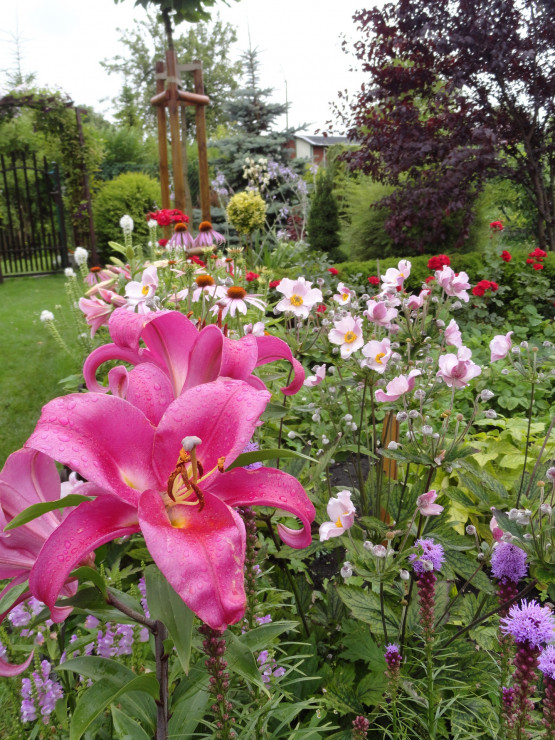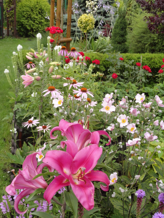 Kolorowy zawrót głowy - to chyba najlepsze określenie lipcowego widoku w ogródkach i na działkach. Wszystko cieszy oczy kolorami... Cudne dumne lilie kwitną na tle jeżówek, liatry, odętek... Rudbekia pęka w szwach od ilości słonecznych kwiatów. Łubiny i ostróżki - powoli - rozpoczynają drugie kwitnienie... Cynie prześcigają się w kolorowych kwiatach. Floksy roztaczają cudowny zapach wokół siebie... Dalie prężą się dumnie obok hibiskusa... Na sąsiedniej rabacie obok cudnych koleusów i trawy hakonechloa zakwitł guzikowiec,,, Nie sposób wymienić wszystkiego. Zostaje nam tylko usiąść i cieszyć oczy tym niepowtarzalnym widokiem...