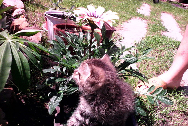 Maly koteczek siedzi w doniczce z gazania,rozglada sie za czyms ciekawym.......................................................................................................................................................................................................................................