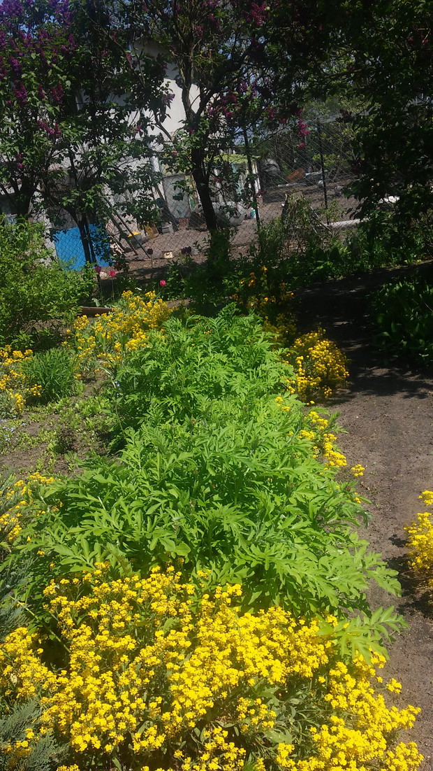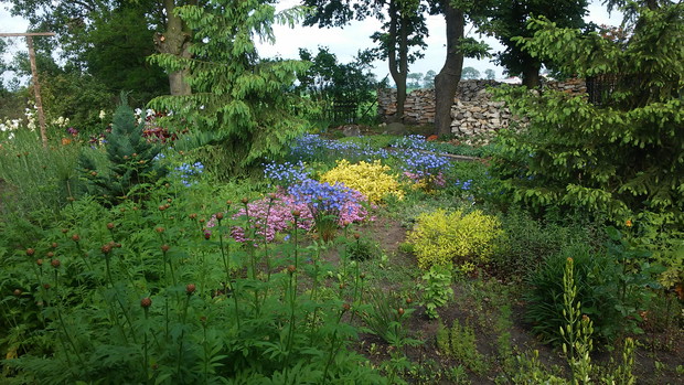 Ogród znajduję się 0,5 km od sławnego jeziora Gopło na Kujawach, ale ziemia jest raczej piaszczysta i sucha. Jest tu kilka przedwojennych egzemplarzy przedwojennych jak aleja lipowa lipowa i akacjowa, stara grusza i papierówka. Wiosną mamy natomiast tonę liści do sprzątania. Jeszcze do przedwojennych okazów należy fioletowy lilak, poletko żółtych i niebieskich irysów pod lipami, którym niestraszna susza i mrozy. Ze względu na panujące w naszym rejonie susze część ogrodu obsadziliśmy iglakami i teraz mamy prywatny lasek - zimują tam jeże. Ogród jest właściwie jest odskocznią od pracy w gospodarstwie rolnym, cieszy nas każdy kwitnący kwiat czy warzywo. Ten rok jest sprzyjający w deszcz, więc nie musimy nosić konewkami hektolitrów wody. Ale za to chory grzybowe i zarazy nie ominęły i nas. Naprzeciwko ogrodu stoi na wysokim słupie gniazdo bocianie. Wiosną bociany odwiedzają nasz ogród, gdzie zbierają suche gałęzie do naprawy gniazda. Serdecznie pozdrawiamy wszystkich czytelników magazynu ogrodniczego :) Ewa i Małgorzata Witkowskie