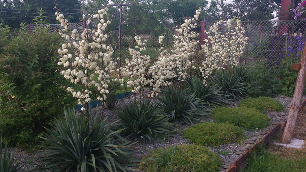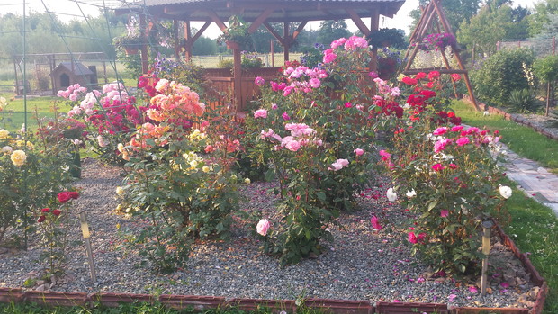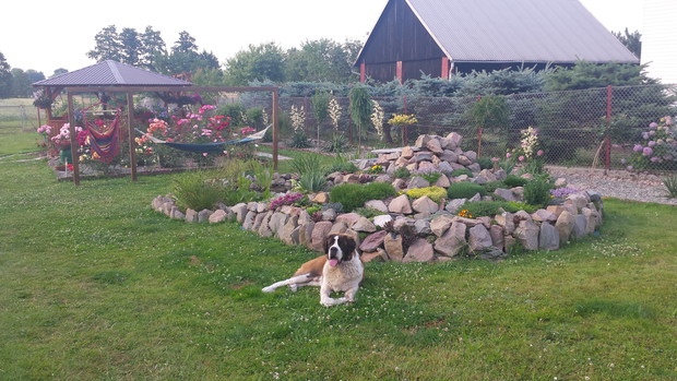 Moja przygoda z ogrodem zaczęła sie 3 lata temu,pierwszą budowlą jaka powstała w ogrodzie była duża altanka w której w miłym rodzinnym gronie grilujemy ale także przyjemnie jest usiąść w upalny dzień,rano pięknie pachną różę dla których zostało specjalnie wygospodarowane miejsce,pomiędzy rabatą z różami a oczkiem został powieszony hamak na którym przyjemnie się odpoczywa przy zapachu róż i delikatnym szumie wody z kaskady.W oczku wraz z rybami zaprzyjaźniły sie dwie piękne żabki które wieczorami rechoczą.W ciepły letni dzień pięknie zakwitają w oczku lilie wodne.W ogrodzie cały czas coś się zmienia,powstają nowe rabaty z kwiatami,dosadzamy nowe okazy zakupione w szkółkach lub po prostu w centrach ogrodniczych,najnowszym nabytkiem jest róża odmiany "Fryderyk Chopin" o pięknych dużych kwiatach w kolorze białym z kremowym środkiem.W planach jest też utworzenie małej ławeczki do odpoczynku obok oczka wodnego i choć działka nie jest jeszcze cała zagospodarowana to mam nadzieje że przez najbliższe lata będą powstawać nowe rabaty.Ogród wymaga ciągłego nakładu pracy ale kwitnące kwiaty są wynagrodzeniem wszystkich prac włożonych w nie.