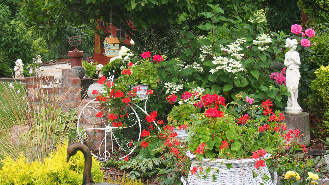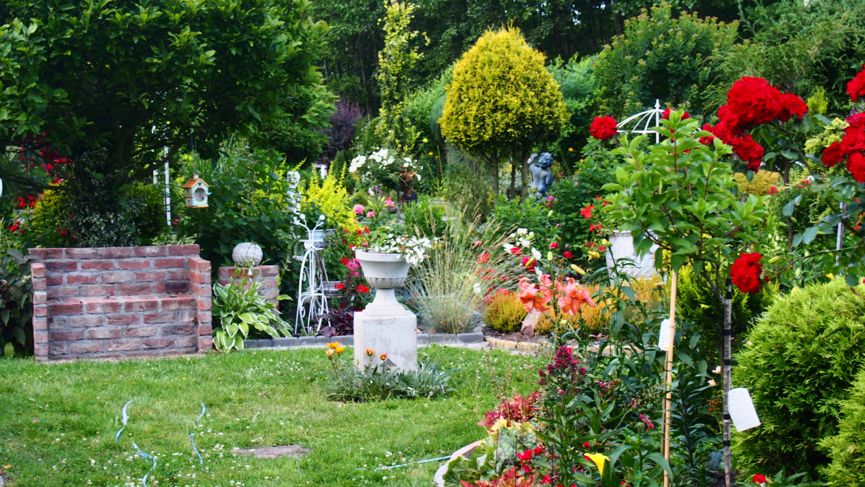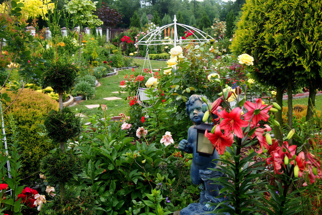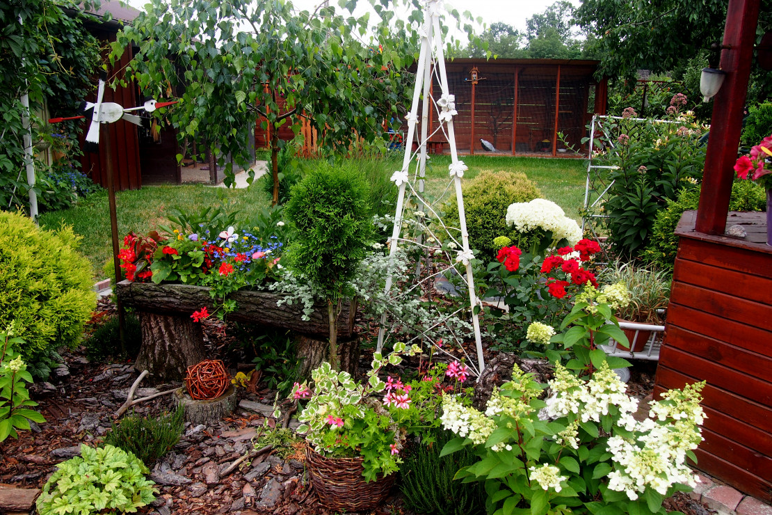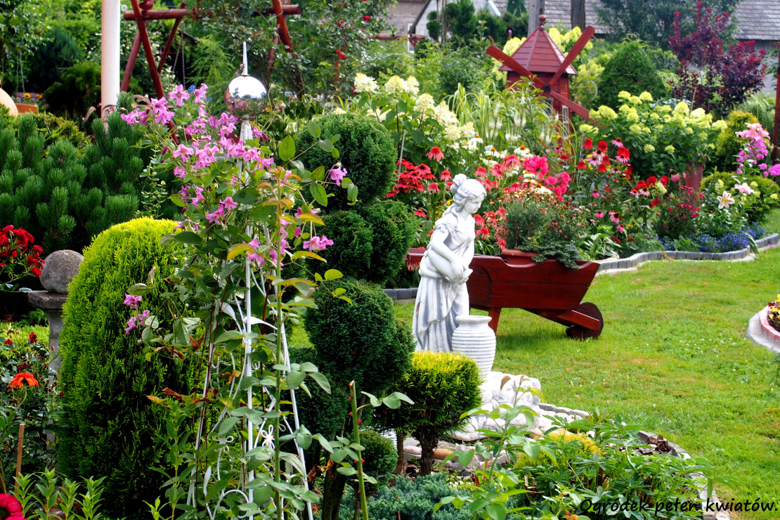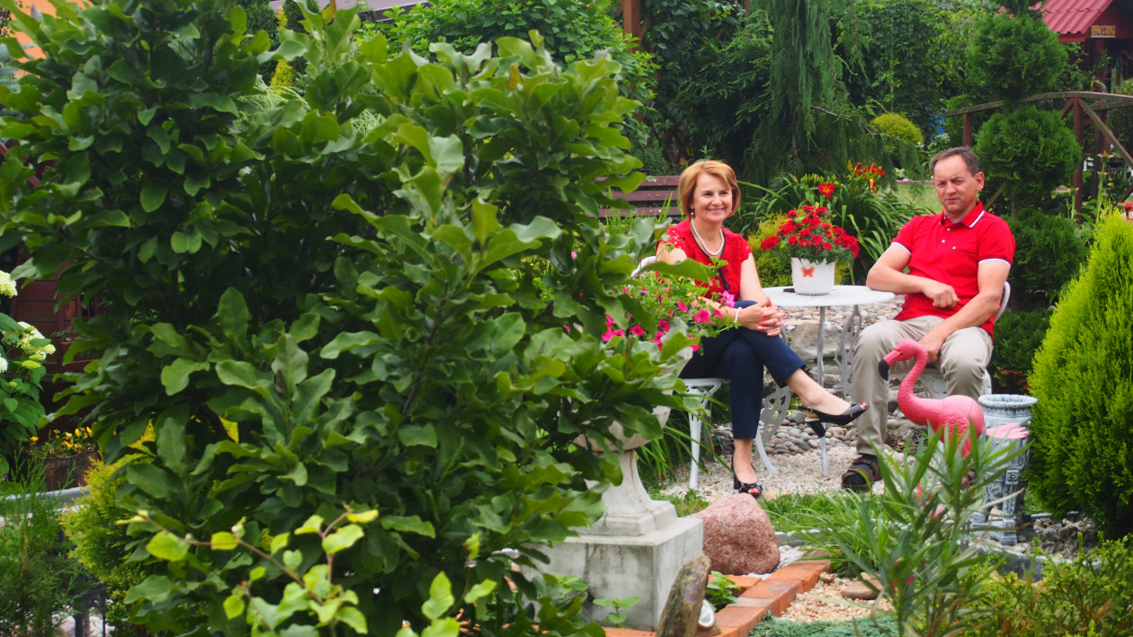 Moja przygoda z ogrodem zaczęła się około 10 lat temu. Wtedy powstała najstarsza rabata, która jest niezmieniana do dziś. Lecz dopiero przez ostatnie 3 lata zajęłam się porządkowaniem rabat, przesadzaniem i dokładnym rozplanowaniem gdzie co powinno rosnąć. Każda z nich jest kolorowa cały rok. Kompozycje tworzą kwiaty, krzewy i drzewa, które kwitną o różnych porach roku. Znajdują się tam m.in. rośliny cebulowe pięknie kwitnące wiosną: narcyzy, szafirki, krokusy, hiacynty oraz mnóstwo odmian tulipanów, które zachwycają różnorodnym kształtem płatków koron, barwą i zapachem. Nie brakuje także innych wiosennych kwiatów jak: smagliszki, sasanki czy pszylaszczki. Żeby ogród rzucał się z daleka w oczy na grządkach rosną również większe krzewy: lilaki, magnolie, złotokap, migdałek, azalie i wiele innych. Z nadejściem lata kwitną królowe mojego ogrodu – róże, jestem dumna ze swojej kolekcji, mam ponad 150 krzewów tych pięknie pachnących kwiatów. Za to jesienią najbardziej lubię duże kwiaty hortensji, które z czasem przebarwiają się na różowo. Zbyt dużo by wymieniać, żeby uwzględnić wszystko, co rośnie w moim raju. Oprócz wielu roślin jest także mnóstwo zakątków z ławeczkami do których prowadzą wymyślane ścieżki. Można sobie tam przysiąść w cieniu, zrelaksować się i odpocząć. Jednak takim azylem jest niewątpliwe oczko wodne, obrośnięte wokół wysokimi trawami sprawia, że mogę oderwać się od problemów życia codzięnnego .