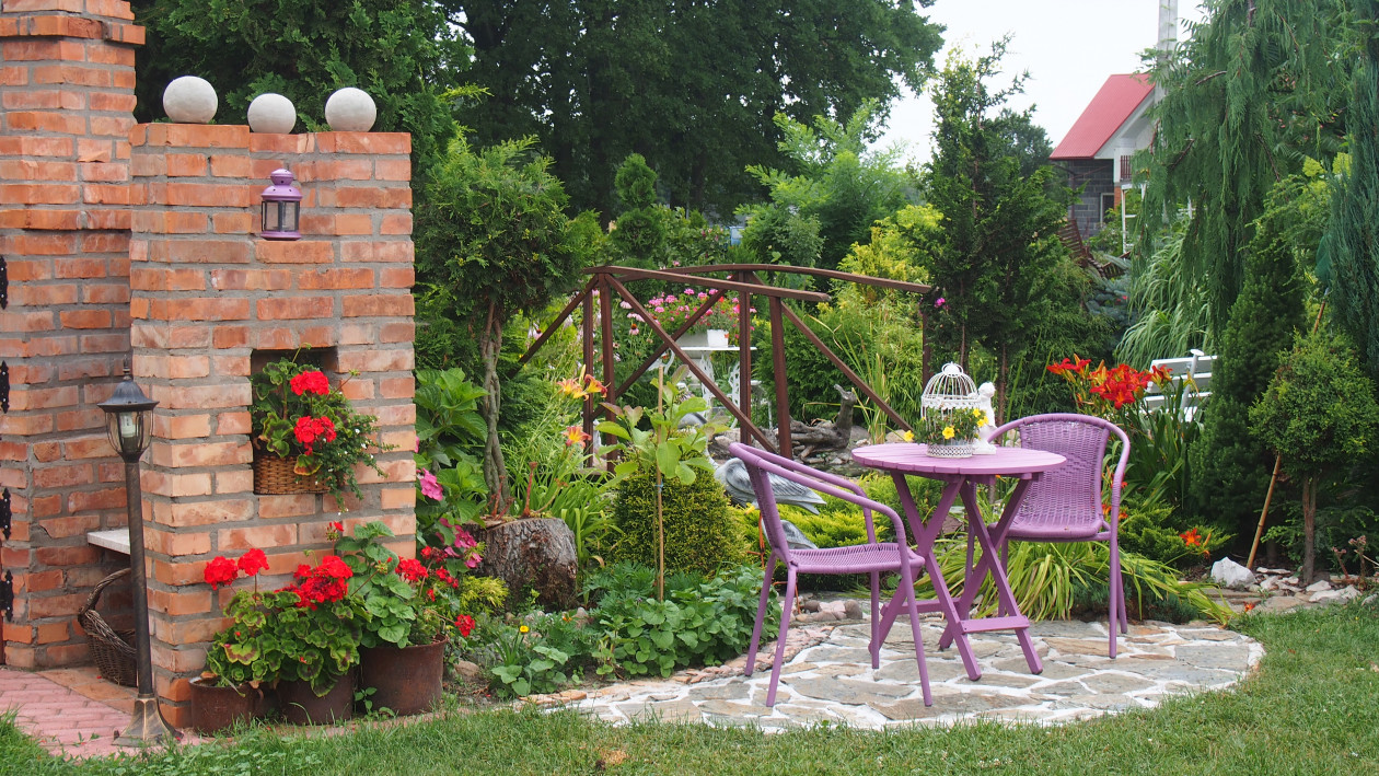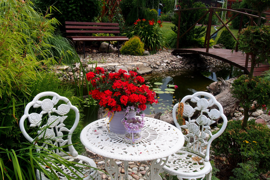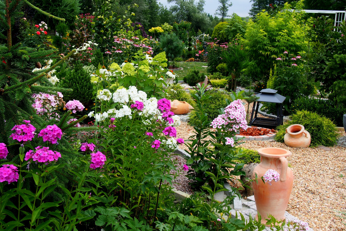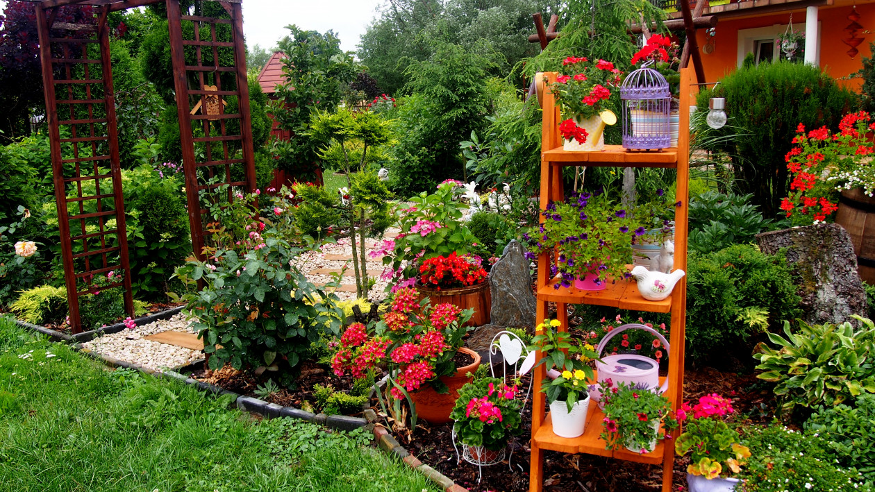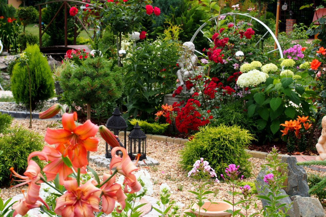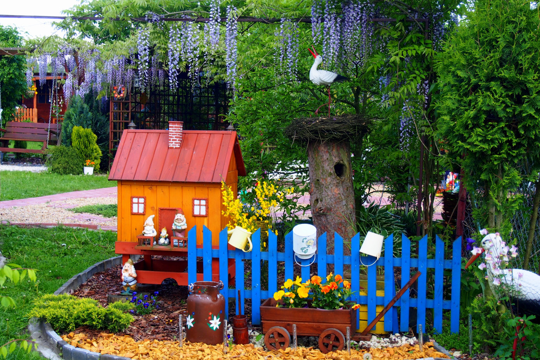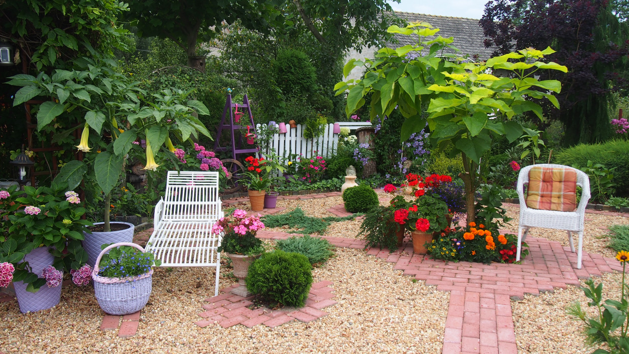 Moja przygoda z ogrodem zaczęła się około 10 lat temu. Wtedy powstała najstarsza rabata, która jest niezmieniana do dziś. Lecz dopiero przez ostatnie 3 lata zajęłam się porządkowaniem rabat, przesadzaniem i dokładnym rozplanowaniem gdzie co powinno rosnąć. Każda z nich jest kolorowa cały rok. Kompozycje tworzą kwiaty, krzewy i drzewa, które kwitną o różnych porach roku. Znajdują się tam m.in. rośliny cebulowe pięknie kwitnące wiosną: narcyzy, szafirki, krokusy, hiacynty oraz mnóstwo odmian tulipanów, które zachwycają różnorodnym kształtem płatków koron, barwą i zapachem. Nie brakuje także innych wiosennych kwiatów jak: smagliszki, sasanki czy pszylaszczki. Żeby ogród rzucał się z daleka w oczy na grządkach rosną również większe krzewy: lilaki, magnolie, złotokap, migdałek, azalie i wiele innych. Z nadejściem lata kwitną królowe mojego ogrodu – róże, jestem dumna ze swojej kolekcji, mam ponad 150 krzewów tych pięknie pachnących kwiatów. Za to jesienią najbardziej lubię duże kwiaty hortensji, które z czasem przebarwiają się na różowo. Zbyt dużo by wymieniać, żeby uwzględnić wszystko, co rośnie w moim raju. Oprócz wielu roślin jest także mnóstwo zakątków z ławeczkami do których prowadzą wymyślane ścieżki. Można sobie tam przysiąść w cieniu, zrelaksować się i odpocząć. Jednak takim azylem jest niewątpliwe oczko wodne, obrośnięte wokół wysokimi trawami sprawia, że mogę oderwać się od problemów życia codzięnnego .