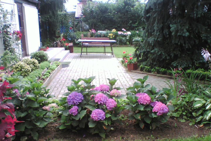 Kwitnące na różowo hortensje można podbarwić w kolorze fioletu wkładając pod kwitnące krzewy suche kromki chleba.Ale w naszym ogrodzie to nie tylko kwiaty.Są tu ciekawe zakątki otulone cisami , bukszpanami i ozdobnymi krzewami których można tu dużo odszukać.Ten ogród jest ciągle modernizowany o czym świadczą te zdjęcia pochodzące z przed 10 lat i obecne.Dziś drzewa i krzewy porosły tak że wymagają mocnego cięcia.Ponadto w ogrodzie tym mamy również warzywniak gdzie uprawiamy pomidory (w namiocie) ogórki i wszystkie warzywa i zioła niezbędne w kuchni.Kochamy swój ogród w którym wypoczywa się superowo.