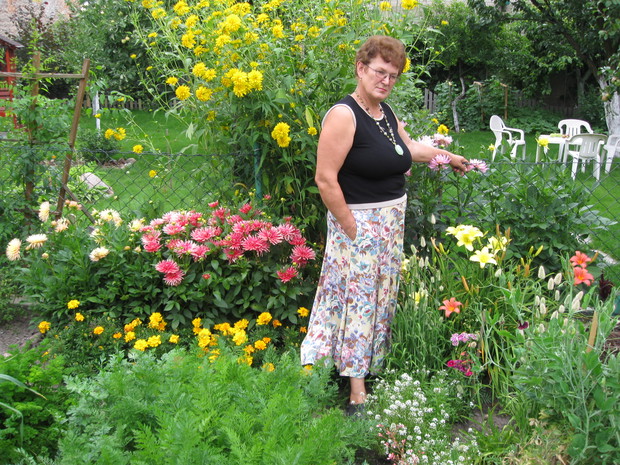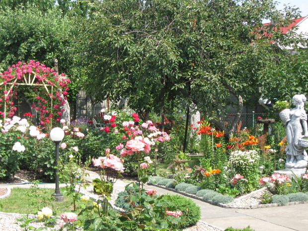 Mój ogród od wiosny do jesieni zadziwia różnorodnością kwiatów i krzewów ozdobnych. Rosną w nim tulipany i narcyzy o różnej barwie. Później zakwitają piwonie i róże. Mam też dużo innych kwiatów jak np: naparstnice liatry, dalie, liliowce itd.. Ogród zdobią nie tylko kwiaty ale również mała architektura, którą z drewna własnoręcznie wykonał mój mąż - jest to ławka z pergolą widoczna na zdjęciu z różami, pergola po której pnie się pnąca róża i wiele innych ozdób. Oprócz elementów drewnianych na mojej działce znajdują się również elementy wykonane własnoręcznie z betonu między innymi biedronka. Inspirację do wykonania tych nietypowych figurek czerpałam z pism o tematyce ogrodniczej i z internetu.