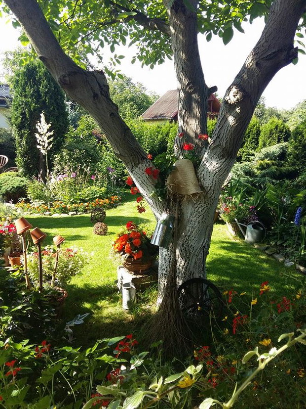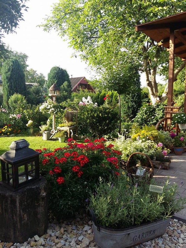 Trudno w kilku słowach opisać,czym jest dla nas,nasz nasz ogródek działkowy.Jest więcej niż zwykłym kawałkiem ziemi,którą trzeba uprawiać.Może zacznę od początku.Mija dziesiąty rok,jak jesteśmy użytkownikami działki ROD Szarotka w Tychach.Im dłużej o nią dbamy i pielęgnujemy,tym więcej jesteśmy zakochani w tym miejscu.Działka ma 435 metr.kw.i położona jest na obrzeżach Tychów.Postanowiliśmy już na samym początku,że ta działka będzie naszą zaciszną oazą,ucieczką od betonowych blokowisk,miejscem do spotkania na świeżym powietrzu dla całej rodziny.Było to bardzo ciężkie wyzwanie,działka wymagała od nas niesamowitej pracy fizycznej i systematyczności.Mimo trudów,myślę,że nam to się udało.Rok w rok.po skończonej zimie,oglądać wschodzące rośliny to wyjątkowa przyjemność.Nasadzenia zostały tak przemyślane,że od wczesnej wiosny do późnej jesieni ,ogródek mieni się kolorami przeróżnych kwiatów,roślin i krzewów.Z początkiem cudne krokusy,pierwiosnki,miodunki,potem narcyzy,setki tulipanów rosnących w łące z niezapominajek i szafirków tworzą piękny spektakl.Do nich dołącza żółta,miododajna mahonia,migdałek i forsycje.I zaraz po nich zaczyna czas kwitnienia azalii i różaneczników,które uwielbiam.Co roku nie umiem się napatrzeć i nadziwić temu spektaklu. Późną wiosną zakwitają piwonie,irysy,liliowce.Kocham powojniki,które zmieszczą się nawet na małym kawałku ziemi i pną się w górę.Tak samo jest z wiciokrzewami.Jesienią mienią się czerwienią berberysy,rozchodniki,kwitną marcinki i hortensje.Działka prowadzona jest w sposób ekologiczny,nie stosujemy chemii.Mnóstwo pożytecznych owadów i ptaków odwiedza naszą oazę.Podstawą są u nas karmniki i budki lęgowe dla ptaków.Mamy ogródek ziołowy w donicach,w starej wiklinowej witrynie,wiele roślin jednorocznych,bo bez nich nie wyobrażam sobie ogrodu.Aksamitki,lobelie,pelargonie,begonie,kocanki,plektrantusy. Wystarczy trochę wyobraźni i nasz ogród co roku może przyjmować inne barwy.Bo roślin na rynku co roku przybywa,jest w czym wybierać.Bardzo pomaga mi mąż,cięższe prace to właśnie Jego zajęcie.Ponadto ciągle coś powstaje nowego.Nowe dróżki i taras to też Jego dzieło.Wzajemnie się wspieramy i pomagamy,by nasza działka była z roku na rok coraz piękniejsza.Ja natomiast uwielbiam starocie,jeżdżę na giełdy staroci,wynajduję różne cudeńka,które zdobią ogród np.kanki,konewki,stare misy,wagi w których można posadzić np.zióła czy kwiaty.Robię wianki i bukiety.Nowością jest odnowiony kołowrotek a na nim w donicy kwitnące marcinki.Czujemy się doskonale w naszym małym królestwie,odpoczywamy,nabieramy sił i ładujemy akumulatory.Praca w ogródku nie jest lekka,ale zmęczenie też jest inne,daje nam niesamowitą radość i poczucie,że wkładamy małą cząstkę w ubarwienie i ratowanie środowiska.Muszę jeszcze dodać,że pasjonuję się fotografią a nasza działka jest doskonałym miejscem do robienia zdjęć kwiatom,roślinom,ptakom i owadom.To jest nasz wspaniały,świat w którym my i przyroda żyjemy w symbiozie.I jest nam tam bardzo dobrze.Kochamy Go :)
