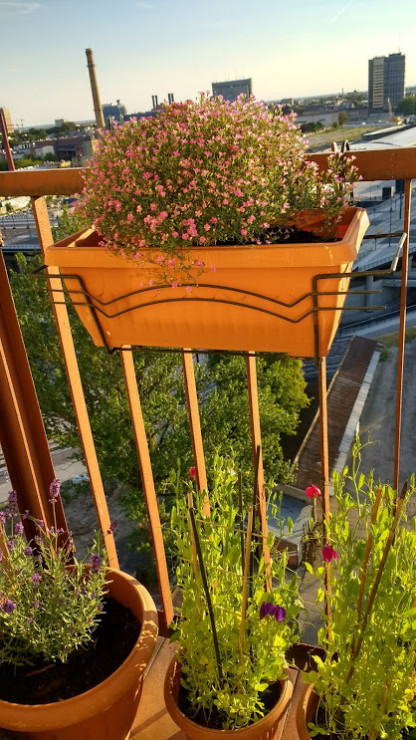 Mieszkam w okolicy, którą niedawno zabetonowano, powstała ruchliwa ulica, zakłócono mój spokój. Wycięto piękne, stare drzewa, więc postanowiłam ukwiecić swój krajobraz, zmienić go w bardziej przyjazny dla duszy i oka. Teraz lubię wychodzić na balkon i podziwiać widoki, a zapewniam, że jest na co popatrzeć. Przedstawiam mój kwiecisty balon na 11 piętrze, w centrum betonowej pustyni.