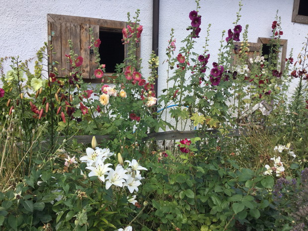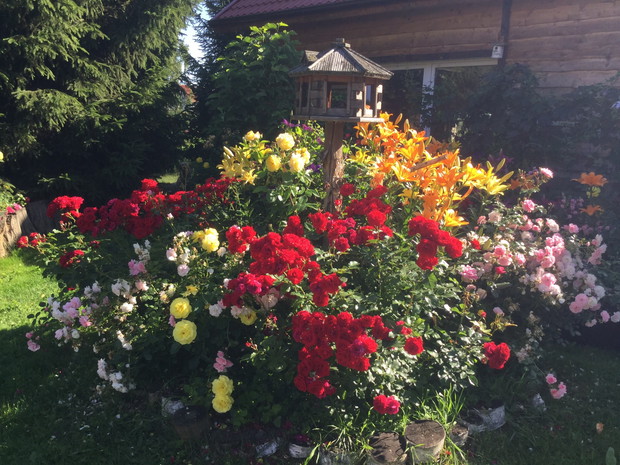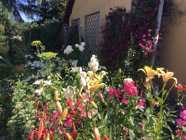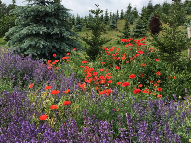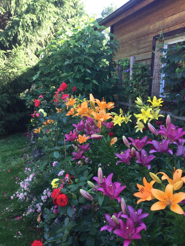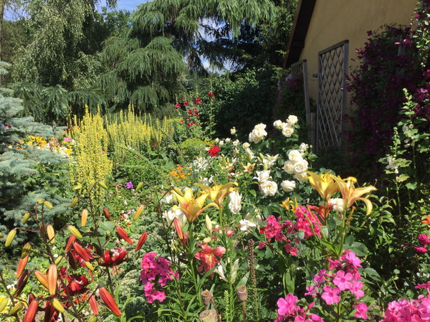 "mój piękny ogród"-chcę aby był jak najbardziej naturalistyczny.Moje rośliny mają dużo swobody a Matka Natura sama tworzy kompozycje nie do powtórzenia.Zostaje tylko zachwycać się.Niesamowity efekt dają czerwone maki z kocimiętką lub dziewanny jako tło dla lilii.Zarówno maki jak i dziewanny rozsiewają się same a ja pozwalam im na zasiedlanie coraz to nowych stanowisk.Pozornie wydaje się ,że rośliny same się sieją i nikt na tym nie panuje,ale jak zaczynają kwitnąć nie można oderwać wzroku.