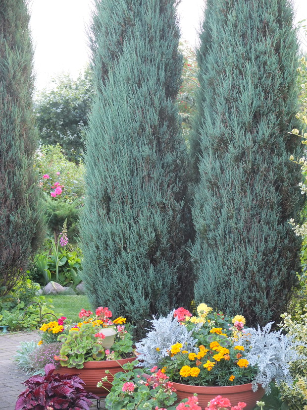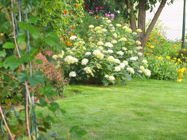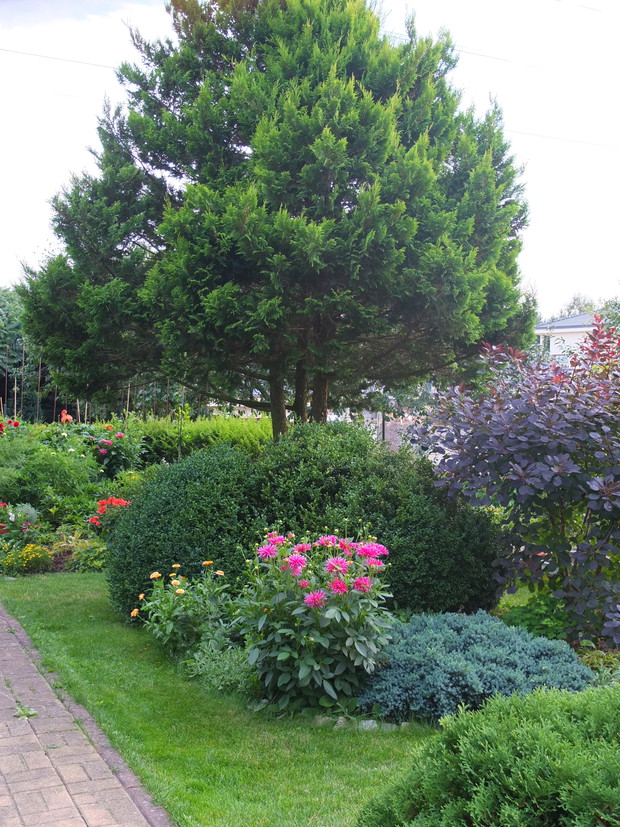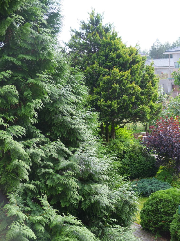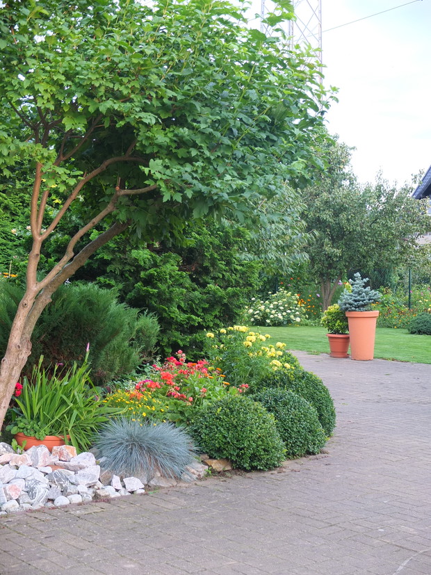 Nasz ogród znajduje się na obrzeżach Gdańska. Trudno nam w to uwierzyć, ale został założony 18 lat temu . Naszym marzeniem było żeby w ogrodzie obok części rekreacyjnej koniecznie znalazło się miejsce na drzewa owocowe, warzywnik i szklarnię. Wiosnę witają tulipany, pierwiosnki, kalina i lilak - prowadzony w formie drzewka, i oczywiście rododendrony. Niemal przez cały sezon kwitną krzewuszki, wiciokrzewy i powojnik odmiany Summer Snow .Nigdy nie zawodzą nas naparstnice – raz zasadzone w ogrodzie co roku wydają nowe pokolenie roślin, podobnie jak onętki i tytoń ozdobny. Co roku okazalej wyglądają rośliny wolno rosnące: bukszpany formowane w kule , cisy i cyprysy – rosnąc potrzebują niestety coraz więcej przestrzeni i trzeba szukać nowych miejsc dla kwiatów jednorocznych. W warzywniku nie stosujemy żadnych nawozów sztucznych : glebę wzbogacamy kompostem i przekopanym poplonem. Pomidory w szklarni podlewamy gnojówką z pokrzywy ,skrzypu i wrotycza. Daje to rewelacyjny rezultat – krzaków nie atakują choroby grzybowe. Chociaż dzięki licznym nasadzeniom klimat w ogrodzie złagodniał to i tak wiele roślin wytrzymujących zimę na południu Polski u nas musimy przenosić do kwater : azalie, kloniki palmowe, rozmaryn, niektóre odmiany trzmieliny zimujemy w widnej piwnicy. Ogród jest dla nas najlepszym miejscem do wypoczynku – „letnim salonem”, do którego wprowadzamy się w połowie maja , wyganiają nas z niego dopiero październikowe chłody