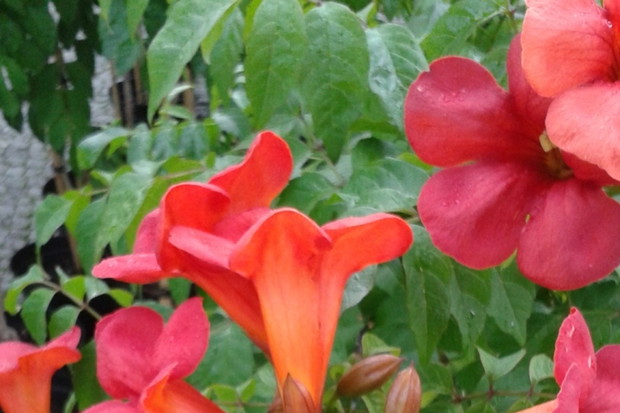 Wolno rosnące, kompaktowe pnącze o czerwonych kwiatach. ocznie przyrasta o 1 m. Liście są złożone z 7-10 ostro zakończonych listków. Trąbkowate, intensywnie czerwone kwiaty rozwijają się z w lipcu i sierpniu. Płatki korony są zrośnięte w rozszerzającą się rurkę zakończoną pięcioma wywiniętymi na zewnątrz, okrągłymi łatkami. Kwiaty są zebrane w kwiatostany na wierzchołkach jednorocznych pędów. Roślina znosi mróz do -26°C, strefa 5. Może być prowadzona w formie piennej w postaci niewielkiego drzewka.