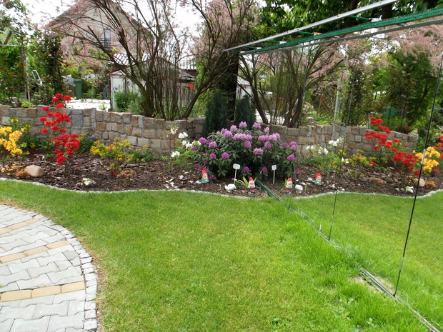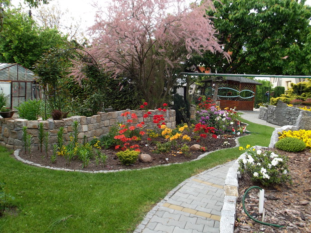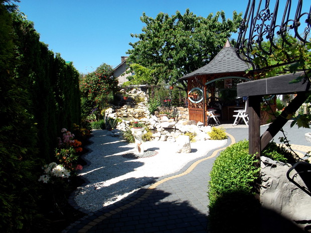 W niewielkim przydomowym ogródku stworzyłem zakątek do wypoczynku i relaksu na bardzo małej przestrzeni staram się wytworzyć klimat w którym dominującą rolę będzie odgrywał zapach kwiatów, szum wody oraz obecność ptaków i owadów na kaskadzie w upalne dni gromadzą się duże ilości pszczół które swoim ,,bzykaniem" w połączeniu z szemrzącą wodą sprawiają że pod altanką po chwili można sobie uciąć błogą drzemkę.Z Żoną uwielbiamy Azalie dlatego na tak małej powierzchni mamy ich 42 szt. kolekcja w większości składa się z odmian pachnących po ich przekwitnięciu dominują silnie pachnące odmiany bylin.Ogród w obecnym kształcie ma nie całe 3 lata więc nowo nasadzone rośliny (np: azalie) są jeszcze nie wielkie swój pełny urok uzyskają po kilku latach ale teraz już są piękne i warto czekać.Murki ,podwyższenia, schody wykonałem z kamienia granitowego oraz starej kostki brukowej zaś oczko wodne z odpadu jaki powstaje przy pozyskiwaniu marmuru w kopalni.Dla wizualnego powiększenia ogrodu w kilku miejscach umieściłem lustra które dają dość ciekawe efekty. Ogród jest ciągle zmieniany. Wszystkie aranżacje oraz prace wykonujemy sami co daje nam bardzo dużo radości i satysfakcji. Pozdrawiamy wszystkich kochających ogrody.