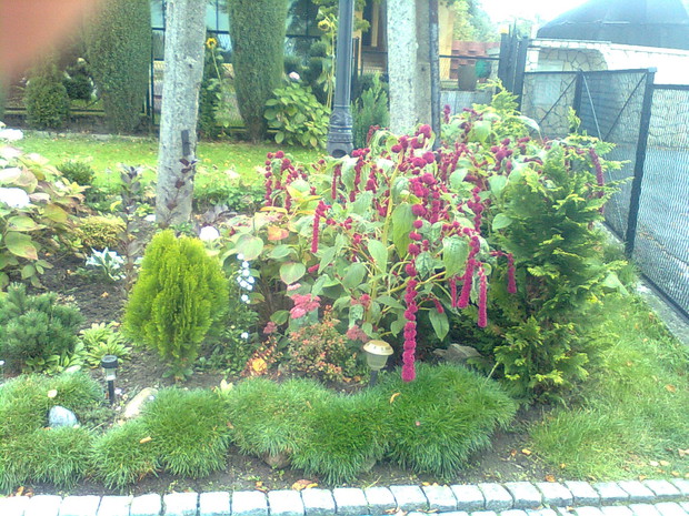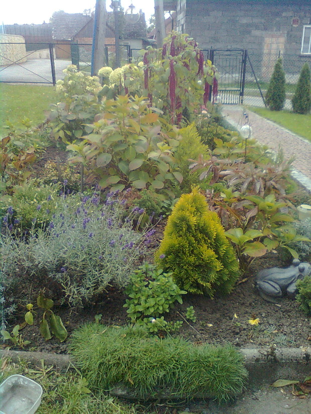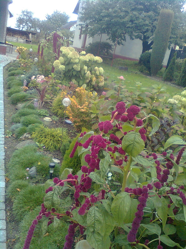 Rabata jesienna. Moja jesienna rabata,umieszczona jest wzdłuż chodnika,na której posadziłam kępy ozdobnej trawy ,kępy lawendy,mięty,oraz iglaki które teraz przebarwiają się na złoty kolor,są również posadzone kępy rozchodnika,goździków skalnych, kwitnie hortensja,na początku i z końca rabaty kwitną ozdobne bordowe krzewy moja rabata o tej porze roku wygląda uroczo.
