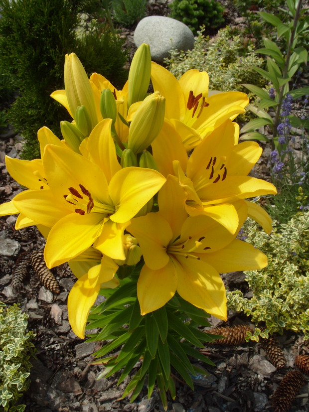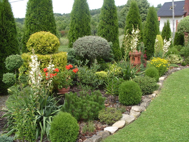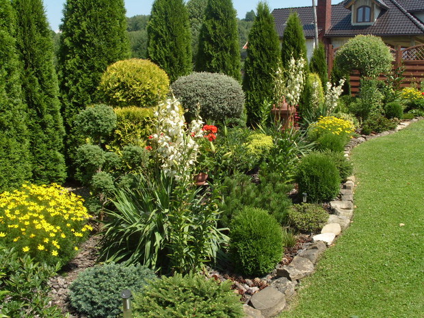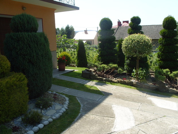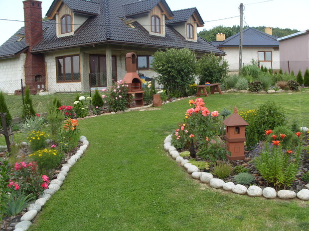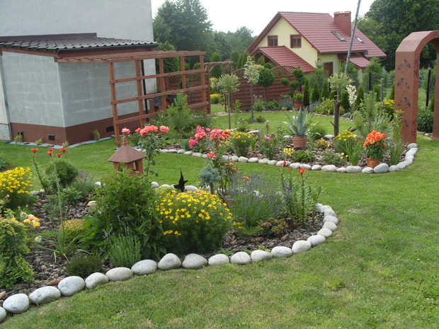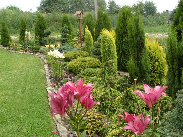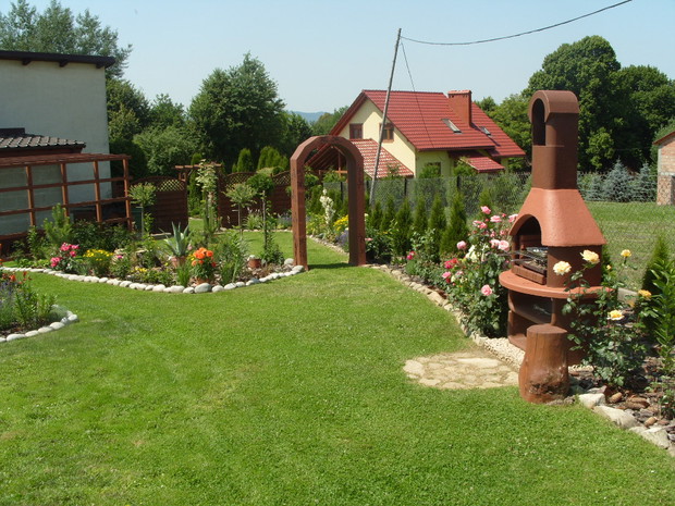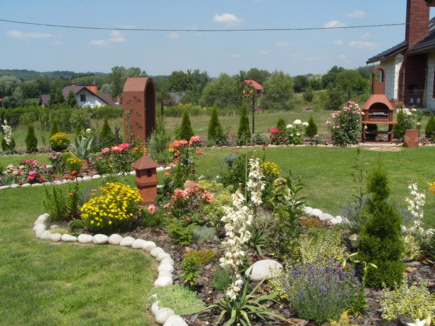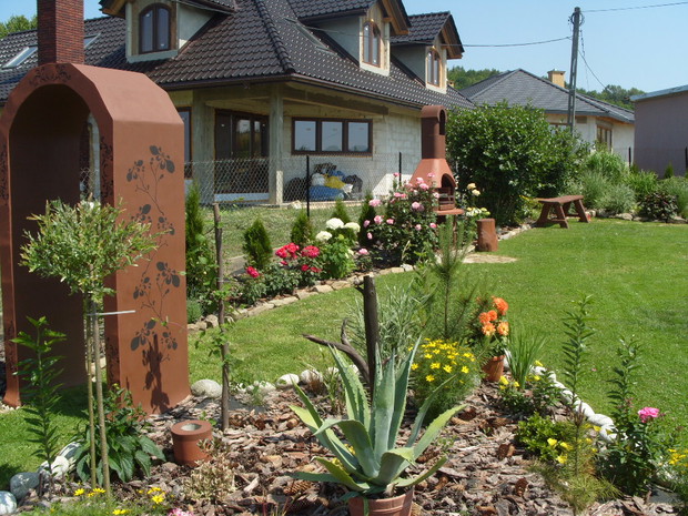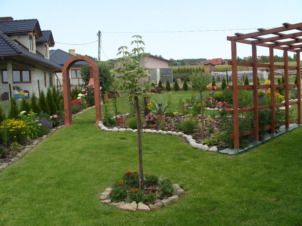 Mój ogród powstaje już od kilku lat,co roku wzbogacam go o nowe rośliny a te które się zbyt rozrosły czy zagęściły nadajemy im nowy kształt.Staram się żeby w ogrodzie było kolorowo i ciekawie ,dlatego wśród iglaków sadzę różne gatunki kwiatów,które kwitną od wczesnej wiosny do jesieni a także dodaje rożne elementy ozdobne takie jak przejścia z betonu i drewna ,donice betonowe , lampiony które zostały wykonane przez mojego męża.Na terenie ogrodu znajduje się oczko wodne, zbudowane przeze mnie,w którym mieszkają rybki . W pracach pomaga mi cala rodzina ,każdy ma przydzielone jakieś zadanie ale za wygląd ogrodu odpowiadam Ja.Każdego roku wkładamy wiele wysiłku i pracy aby nasz ogród był coraz piękniejszy. Gdy przychodzi zima ,planujemy prace już na następny sezon.Praca w ogrodzie daje mi ogromną satysfakcje ,ponieważ co roku podziwiam jej piękne efekty,które z roku na rok są coraz bardziej widoczne.