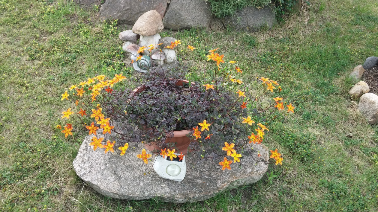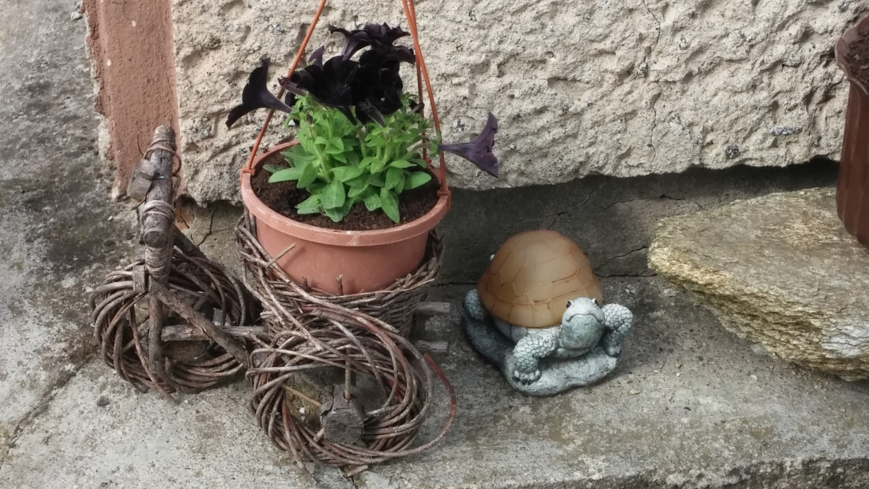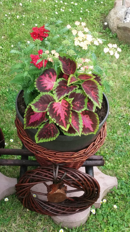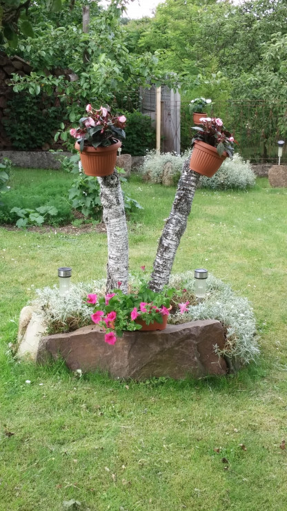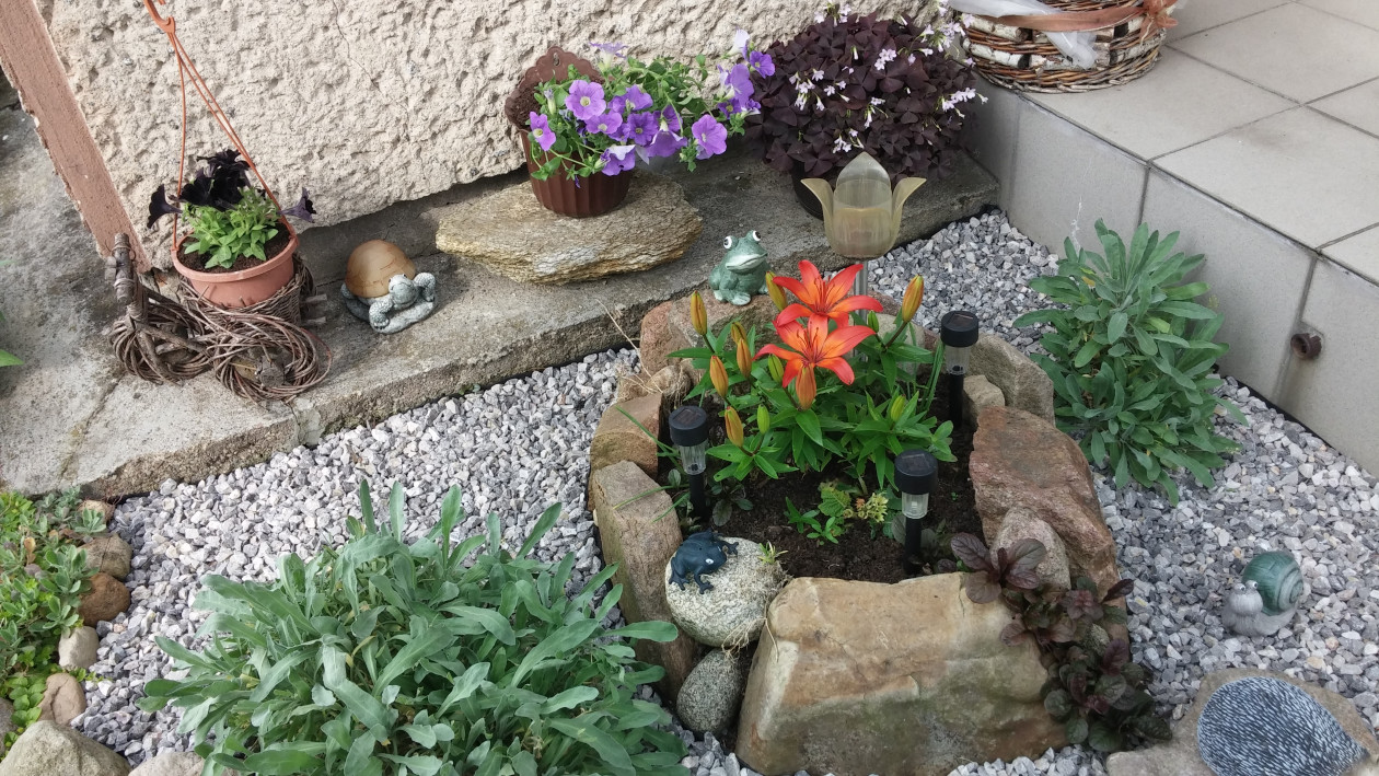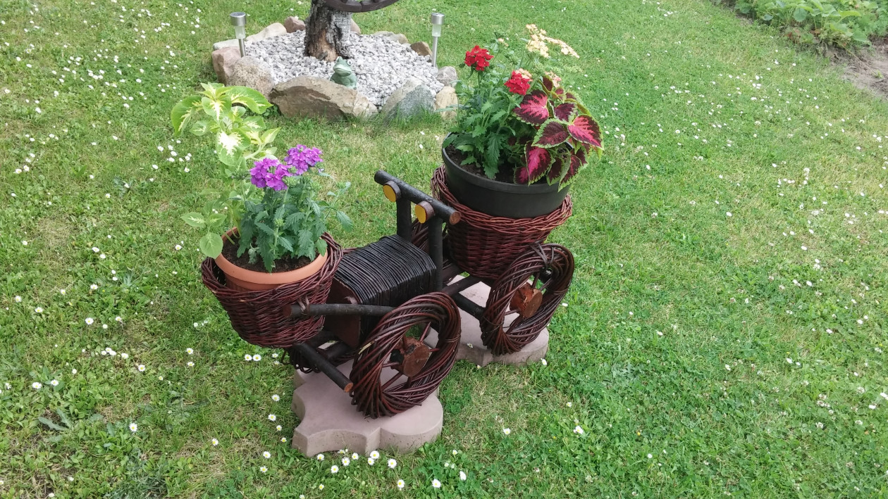 Mój ogród- tutaj nigdy nie można się nudzić.Zawsze mam coś do zrobienia, ciągle coś zmieniam, wymyślam. Mam mnóstwo pomysłów. W pracach ogrodowych pomaga mi mąż .W zależności od pory roku kwitną tu tulipany, goździki, hiacynty ,wiesiołki. Ponadto, co roku wysadzam w doniczkach kwiaty sezonowe jak pelargonie, koleusy, dalie, begonie, nemezje, niecierpki czy też moje ulubione surfinie.To niektóre z nich w tym roku.