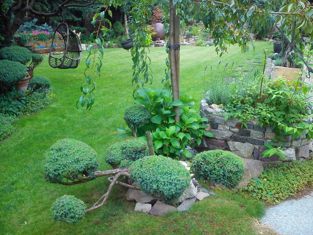 Przez 45 lat mieszkałam w bloku na 1 piętrze, moja Mama miała maleńki ogródek działkowy ale szłam tam pomagać „ za karę”. Jak 15 lat temu wybudowaliśmy dom i mam swój ogród to nie mogę się doczekać soboty, kiedy będę mogła w nim popracować. Wolę zajrzeć do sklepu ogrodniczego niż do galerii handlowej. W naszym ogrodzie jest pewien nieład, taki klimat ogrodu wiejskiego. Wszystko co kupujemy to z myślą o stylu wiejskim, bliskim nam i pasujący do domu i ogrodu. . Mamy „starocie”, które wprowadzają romantyczny nastrój. Materiały używamy tylko naturalne i najlepiej stare jak drewno i kamień. Mamy kamienną studnię a podwórko i ścieżki są z podkładów kolejowych. Leżaki postarzałe, z widocznymi śladami użytkowania, gliniane garnki, płotki i ogromna donica przy źródełku. Nasz ogród „ wiejski” to mieszanka wielu stylów – można w nim znaleźć wszystkiego po trochu. Rabaty zakładamy wg swoich upodobań, ważna jest nie tylko kolorystyka ale i różnorodność. Jest przyjazny dla motyli ( mamy budleje , lawendę i latrię) a obecnie zakwitł milin amerykański, który zachwyca niezwykłymi kwiatami nie tylko nas ale i osy. Kocham hortensje, które teraz cudownie zakwitły i pokazują się w pełnej okazałości. Wokół działki są posadzone iglaki, które osłaniają wnętrze ogrodu i pomagają stworzyć atmosferę spokoju i odosobnienia. I choć praca w ogrodzie wymaga wiele trudu, to wiem, że się to opłaca. Jestem tu szczęśliwa.