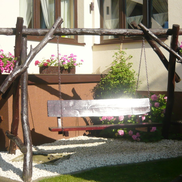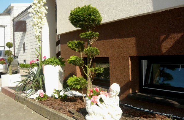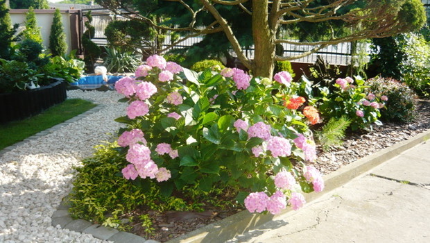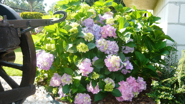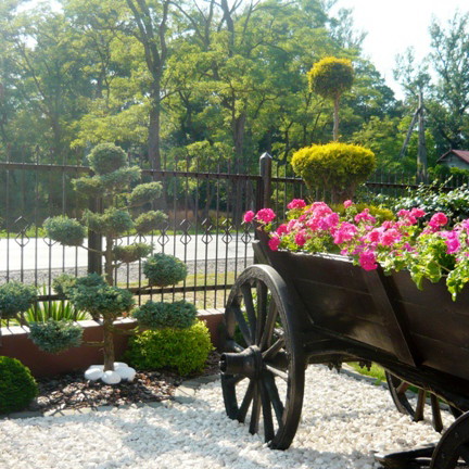 Mój przydomowy piękny ogródek... W moim ogródku choć jest bardzo mały zawsze jest dużo kwiatów. Uwielbiam prace w ogrodzie. Kocham kwiaty szczególnie hortensje, które w tym roku przepięknie kwitną. Sama rzeźbie swoje krzewy, których efekt widać na zdjęciach. Oprócz kwiatów uwielbiam małe figurki i stare elementy. Wóz to dzieło mojego taty, który pomaga mi realizować moje pomysły min. altankę czy sieczkarnie. Uroku mojemu małemu choć efektownemu ogródkowi dodaje oczko wodne usytuowane w małym rogu ogrodu, w którym mieszkają czerwone rybki.Każdego roku i o każdej porze wkładam wiele wysiłku żeby ogród był coraz piękniejszy i kolorowszy . Kocham prace w ogrodzie choć wymagają dużo czasu ale efekt jest oszałamiający zarówno dla mnie jak i osób, które go podziwiają. Niestety nie da się opisać słowami uroku mojego małego ogródka to trzeba zobaczyć