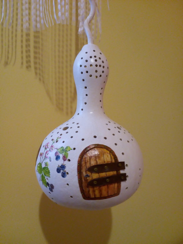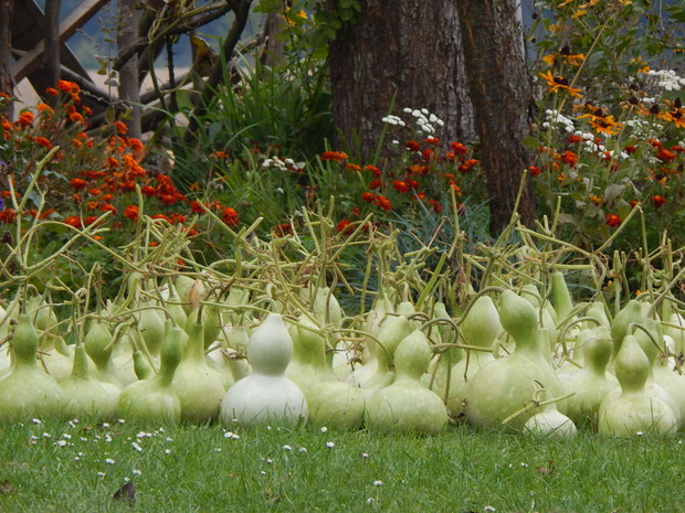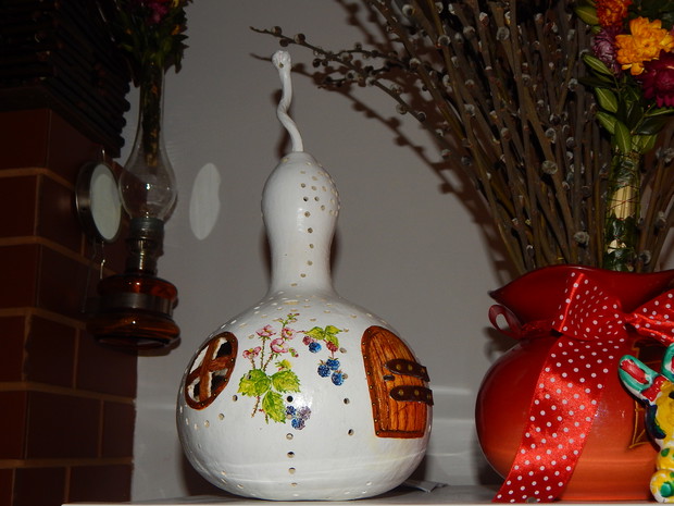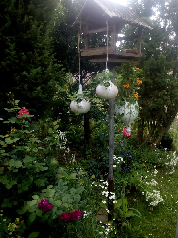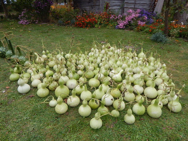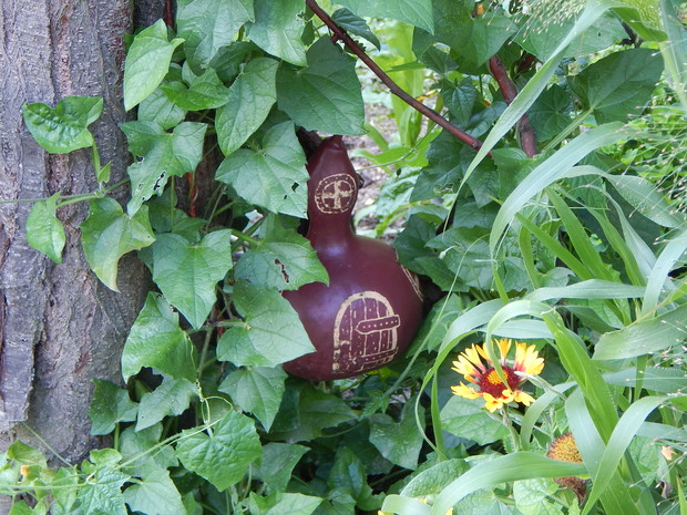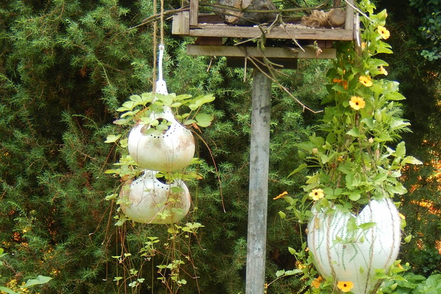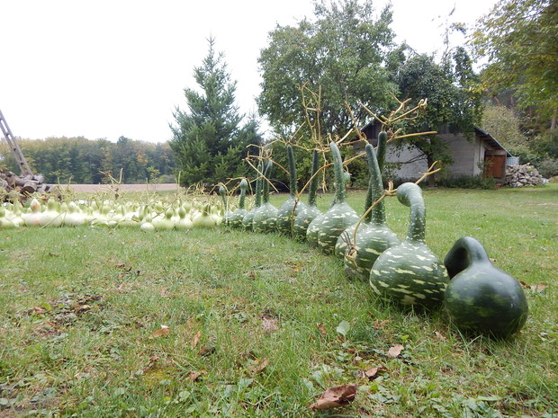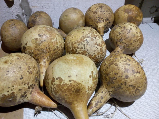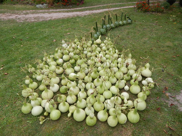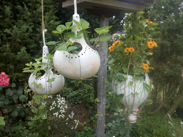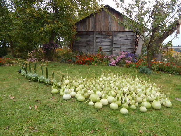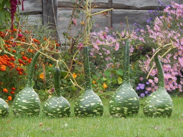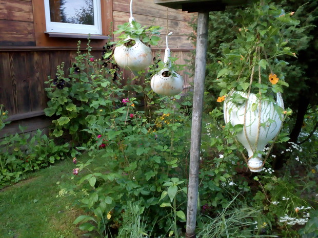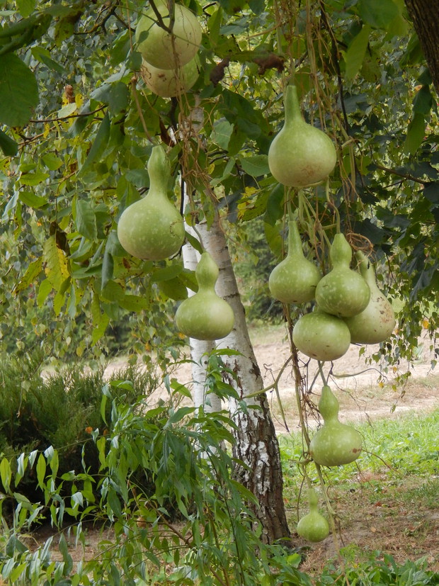 Tykwa z rodziny dyniowatych zaskakuje swoją egzotycznością. Ta nietypowa dynia urzekła mnie swoim wyglądem przed dwoma laty, kiedy zupełnie przypadkiem trafiłam na jej nasiona w ogrodniczym sklepie. Wówczas z 10 ziarenek uchowało mi się zaledwie 2 krzaczki, bo jak się okazało jest dość wybredną rośliną jeśli chodzi o stanowisko... No i ta "żarłoczność" tykwy - śmiało można ją wysadzić w pryzmie kompostowej bo tam poczuje się najlepiej...a przynajmniej u mnie tak było :) Ciepłe, żyzne i wilgotne stanowisko sprawia, że roślina jest w stanie wydać nawet kilkanaście dorodnych beczułek na jednej roślinie...Co potem? Można wykorzystać je do dekoracji jesiennych, bądź uzbroić się w cierpliwość i poddać je procesowi suszenia...Najlepiej w suchym, ciepłym pomieszczeniu, ale nie bezpośrednio przy źródle ciepła, np na kaloryferze, bo zbyt szybkie suszenie może spowodować pomarszczenie dyni. U mnie najlepiej sprawdza się pomieszczenie kotłowni, gdzie tykwy swobodnie zwisają z umocowanych nad piecem drążków. Kiedy wiadomo że tykwa jest sucha? Otóż jak jest lekka i grzechocze przy potrząsaniu :) Wystarczy zrobić niewielki otwór w dyni by dojrzeć , że wewnątrz jest pusta i ma tylko same nasiona, które nadają się do wysiewu na kolejny sezon...Natomiast pusta skorupa jest idealnym materiałem do tworzenia lampionów, abażurów, naczyń...no właśnie co komu w duszy gra... Ps. Zapomniałam dodać - można też jeść tykwę, ale tylko młode, miękkie egzemplarze ;)