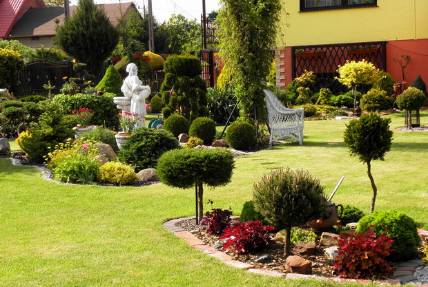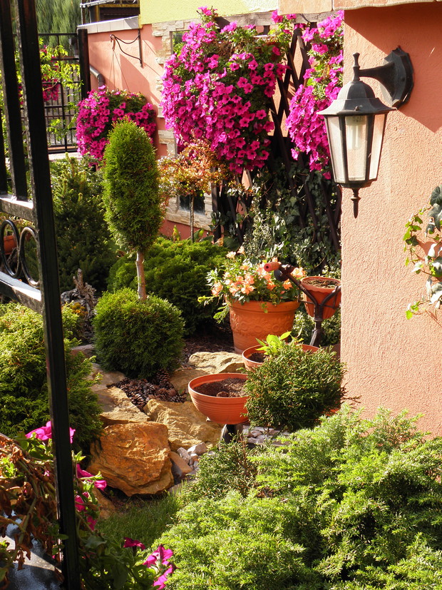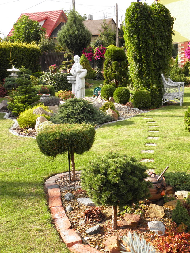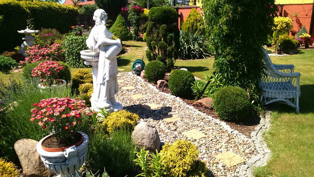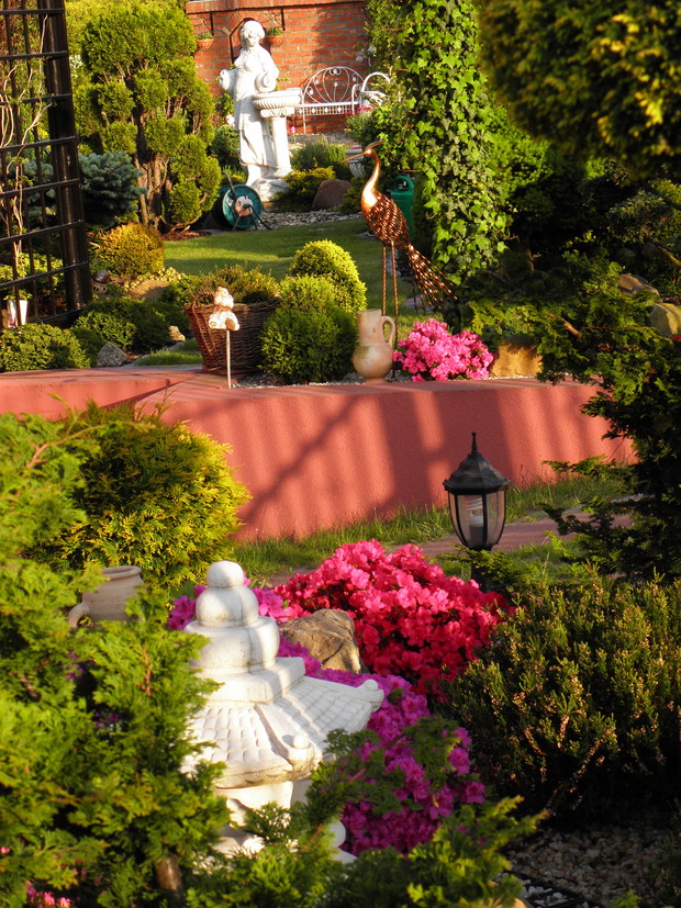 Mój ogród powstawał przez kilka lat. Od samego początku nie wiedziałam jak ma wyglądać. Każdego dnia, miesiąca, roku tworzyłam coś nowego, przerabiałam, dosadzałam nowe iglaki, rośliny, byliny. Praca ta sprawiała mi wielka przyjemność , przy tworzeniu ogrodu odpoczywałam psychicznie. Z zawodu jestem pracownikiem socjalnym a to bardzo obciążająca psychicznie praca zwłaszcza w dzisiejszych czasach. Mój ogród daje mi ukojenie, w nim nie tylko pracuję ale też odpoczywam. Wszystkie prace ogrodowe wykonuję sama, przycinam, wycina, docinam, pielę, robię opryski. jedynie wokół surfinii chodzi moja mama i sa co roku cudne. W ogrodzie mam bardzo dużo roślin, ozdób, które kupowałam na giełdach staroci i nie tylko. Mam nadzieję, że spodoba Wam się mój RAJ .....