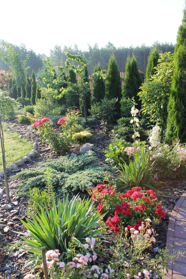 Jestem Kasia, mam 31 lat.Mój ogród jest stosunkowo młody bo ma dopiero 4 lata. Otacza go las i pola uprawne.Sadząc pierwsze rośliny byłam załamana,gdyż okazało się ,że jest to praktycznie sam piach,a pod nim glina.Mimo,że jest tu nieurodzajna gleba i muszę każdej roślinie dać do życia lepsze podłoże one odwdzięczają mi się i pięknie rosną.Najstarsze są tuje i dzikie wino,które porasta całe ogrodzenie,a jesienią tworzy niesamowity pokaz barw.Od czerwonego,pomarańczowego poprzez żółty. Rosną też wrzosy. Zimą zielenią się iglaki,posadzone przemiennie z jałowcami w odmianie gold . Wiosną dominują kwiaty cebulowe:krokusy,żonkile,tulipany i hiacynty .Póżniej kwitną rododendrony.No i ukochane lato.Teraz swoje piękno i cudowny zapach pokazują róże,które rozkochały mnie w sobie i zdominowały cały ogród.Mam w swojej kolekcji okrywowe,pnące,wielokwiatowe,pienne,omszone,krzaczaste historyczne i angielskie,.Posadzone na przemian z jukami tworzą niesamowicie barwny obraz i współgrając ze sobą cieszą oko nie tylko moje.W moim ogrodzie postawiłam na naturalność.Mąż zbudował kamienną piwniczkę w której przechowujemy warzywa i przetwory z własnego ogrodu,a porośnięta jest roślinami skalnymi.Prowadzi do niej chodnik z kamienia polnego,również wykonany przez mojego ukochanego.Kamień polny również stanowi granicę między trawnikiem,a roślinami,które rosną w korze.zadbałam również o teren przed ogrodzeniem,sadząc tam piwonie,juki i irgę płożącą.Kocham kwiaty,kolor a mój ogród stał sie dla mnie taką odskocznią od problemów życia codziennego.Sadzenie ,plewienie ,podlewanie uspokaja mnie i wycisza,ogród to taki mój prywatny i naturalny lek na wszelkie nerwy i stresy:)