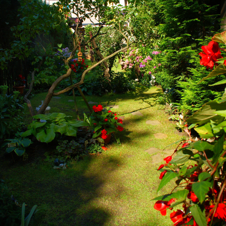 Ogród który opisuję jest typowym miejskim ogródkiem - malutkim skrawkiem ziemi.Staram się aby każdy jego fragment był dobrze zagospodarowany , tak aby siedząc w fotelu o każdej porze roku mieć za qknem inny obraz. Tło ogrodu stanowi zielona ściana bluszczu i ponad 100 letni kasztan który w lecie daje przyjemny cień.Ta zacieniona część ogrodu jest trochę tajemnicza i stanowi jakby odrębny pokoik.Dominują tu funkie (ponad 20 odmian) , żurawki a także begonie ale sezon mocnym akcentem rozpoczynają krokusy.Miło jest przysiąść tu na ławce w upalny dzień.Tych którzy lubią słońce , zapraszam do drugiej części ogrodu, gdzie jest większa różnorodność kwiatów ale znajdzie się tu też krzaczek porzeczki czy agrestu a także poziomki dla łasuchów.Zeby nie było nudno i co roku tak samo , tak jak każdy , dosadzam rośliny jednoroczne . Wszystko to zapewnia ciągłość pracy i tym sposobem jak każdy ogrodnik nigdy się nie nudzę ...