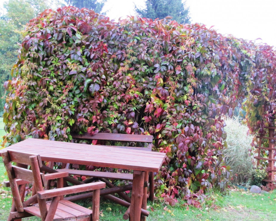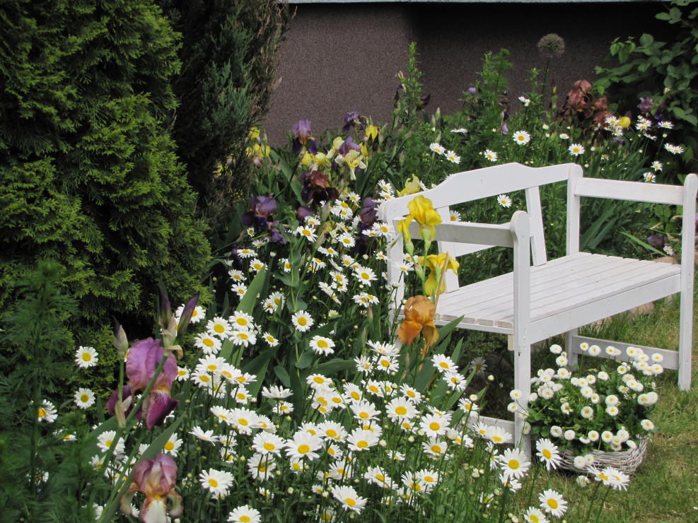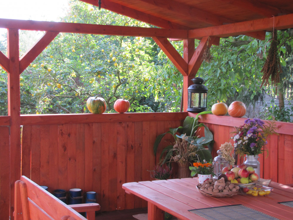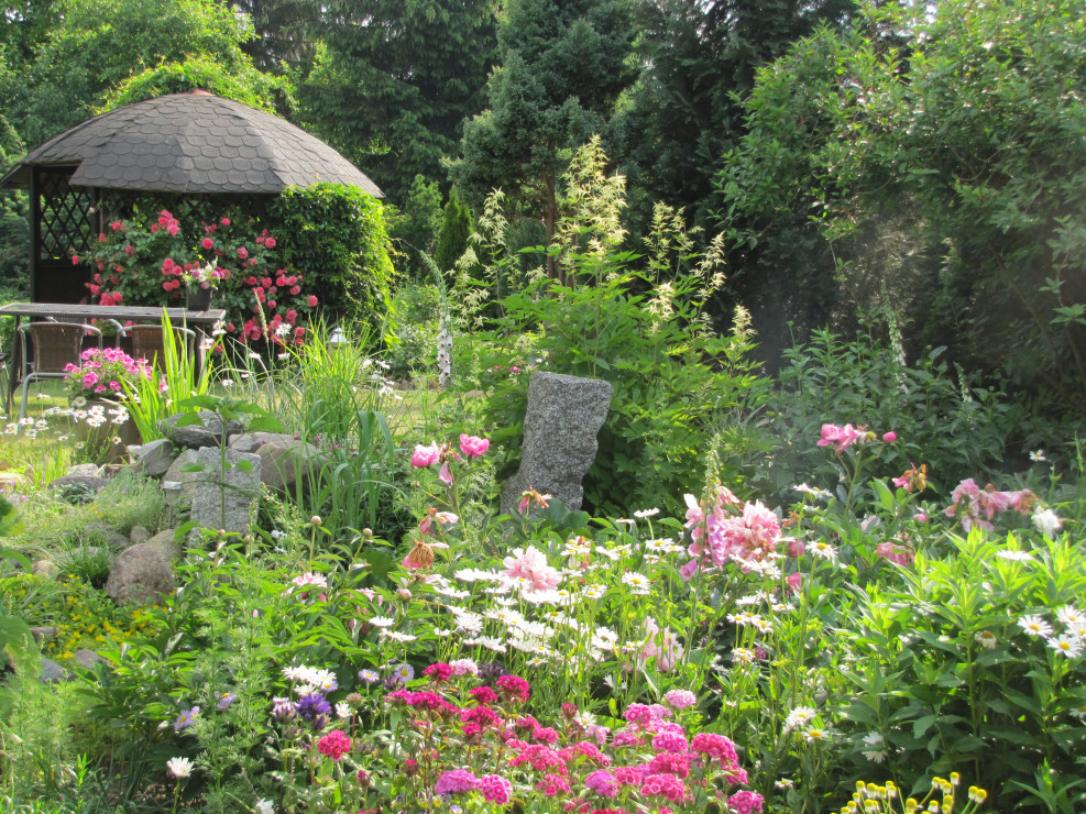 Nasz ogród to nasz drugi dom, dlatego nie może w nim zabraknąć letnich pokoi, wygodnych kącików wypoczynkowych. Jest ich w naszym ogrodzie kilka. W zależności od miesiąca, aury, temperatury, pory dnia, a nawet godziny wybieramy miejsca gdzie czujemy się najlepiej. W marcu gdy jest jeszcze chłodno i dżdżysto, pierwszą kawę na świeżym powietrzu wypijamy na zadaszonym tarasie w otoczeniu ziół i iglaków. Pierwsze promienie wiosennego słońca łapiemy w najbardziej nasłonecznionym miejscu w ogrodzie, w otoczeniu tulipanów, niezapominajek, margaretek, maków, orlików, irysów , serduszek, konwalii, kokoryczki, bergeni, firletek i bzów. Do tego służą też przenośne ławeczki, które lubię ustawić wśród kwiatów w zależności od pory ich kwitnienia. Wszystkie najważniejsze uroczystości rodzinne, przyjęcia urodzinowe, imieninowe itp. odbywają się w naszym „letnim domu”. Dlatego też nie mogło zabraknąć miejsca , w którym przeszkodziłby nam deszcz. Solidna drewniana altanka, obrośnięta winobluszczem, kokornakiem wielkolistnym i różą pnącą nie raz już stała się niezawodna, gdy kapryśna aura nie dopisała. Ale z czasem okazała się niewystarczająca, dlatego od tego roku centralne miejsce wypoczynku stanowi duża, przestronna altana z drewnianą podłogą i solidnymi drewnianymi meblami. W altance znajduje się też aneks kuchenny i wszystkie potrzebne naczynia i przybory, więc bez ograniczeń można w niej wypoczywać przez większą część dnia.