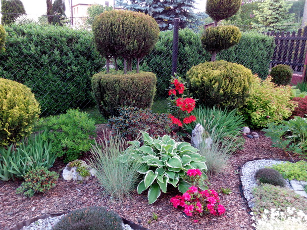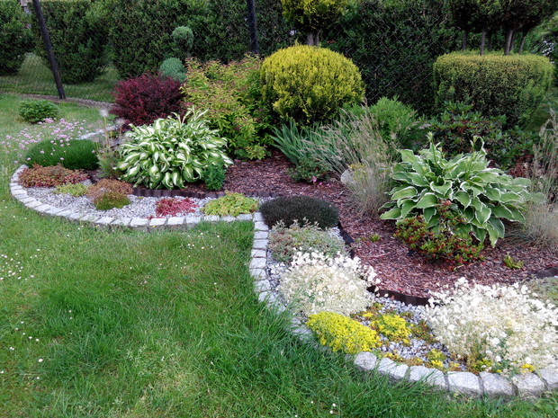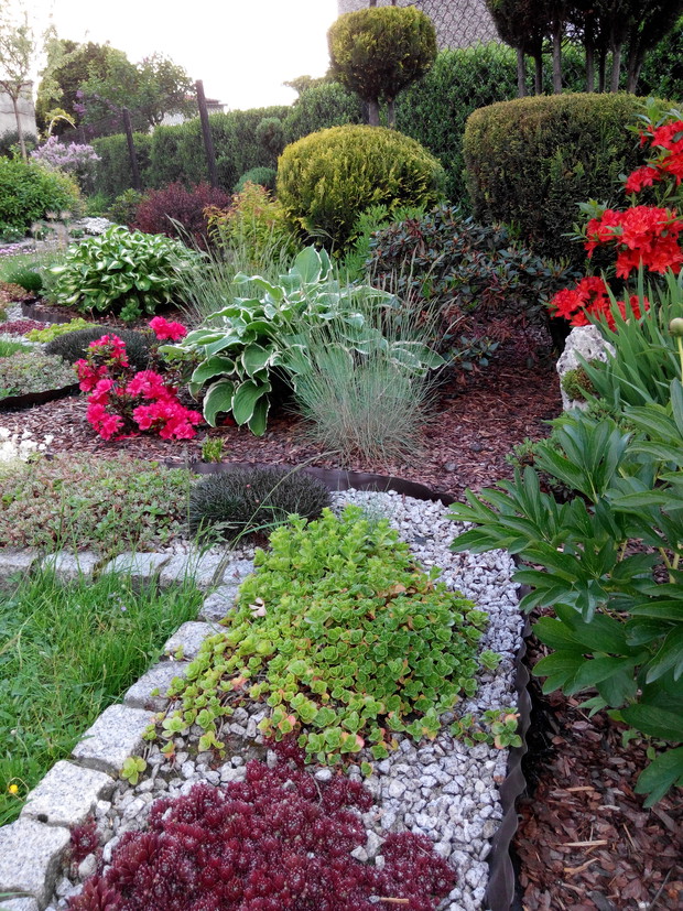 Mój ogród to moje natchnienie! Uwielbiam obserwować jak dojrzewa. Powstawał małymi kroczkami. Metodą prób i błędów. Mimo ogromu prac jakie trzeba było włożyć w to by dobrze wyglądał i by rośliny czuły się w nim dobrze. Ogród zaczęłam zakładać w czasie kiedy prace nad domem nie były jeszcze skończone. Zaczęłam od doniczek stawianych na schodach. Od maleńkich rabatek wśród chaosu, który panował wtedy na budowie. Od tamtej chwili minęło sporo czasu. Każdego roku powstawały nowe nasadzenia. Nigdy nie zatrudniłam żadnego fachowca. Wspólnie z mężem ciężko pracowaliśmy nad tym ,żeby nasz ogród cieszył nasze oczy. Oboje kochamy kamień. Wszystkie rabaty mają obwódki właśnie z tego surowca.. W naszym ogrodzie ciągle coś się dzieje. Każdego roku zostaje wprowadzony jakiś nowy element. Lubię obserwować ogród , który wraz ze zmianą pór roku jest inny. Wiosną kwitnące tulipany, krokusy, żonkile, forsycje, azalie i rododendrony. Floksy oraz mnóstwo innych roślin cieszą oczy swoim urokiem. Istna eksplozja barw!!! Lato - czas pachnącej lawendy, hortensji, róż i innych krzewów ozdobnych. Jesień z kolorowymi liśćmi , wrzosami i cudownymi aksamitkami, które wprost ubóstwiam za ich długie i obfite kwitnienie. Praca w ogrodzie choć ciężka sprawia mi wiele radości. Kocham wieczory na tarasie, kiedy jest czas na odpoczynek przy kominku i kolację z rodziną. Nie jestem ogrodnikiem doskonałym. Popełniam mnóstwo błędów, na których się uczę, ale kocham mój ogród!!!
