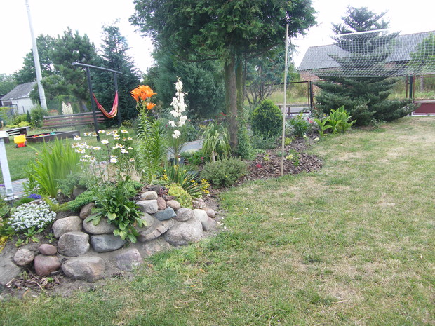 Chciałabym przedstawić swój niespełna pięcioletni ogród, ciągle zmieniany i upiększany:) Ogród pełni funkcje wypoczynkową, zabawową dla dzieci i rekreacyjną. Dzieci mają swój kącik zabaw w postaci piaskownicy i trampoliny , dorośli siatkę do gry w babingtona, kącik z hamakiem, jak i taras służący często spotkaniom towarzyskim. Poza tymi dodatkami w ogrodzie królują rośliny namiętnie kupowane i przesadzane przeze mnie. posiadam wiele pnączy jednorocznych i wieloletnich, traw, jak również mnóstwo niskich bylin kolorowo kwitnących. Uwielbiam szałwie omszone, których mam kilka kolorów, a które kwitną bardzo długo, dokupuję różne przetaczniki. Hortensje, krzewuszki, hosty, żurawki, rośliny skalniakowate, jak tylko spotkam dokupuję nowe gatunki. Jest to ogród stosunkowo młody, więc wszystko jeszcze małe i niepozorne, ale w wyobraźni już widzę ich pełnie rozwoju i docelowe miejsce na rabacie. W tym roku w ogrodzie do roślin dołącza architektura ogrodowa. Dokupiona została donica, zrobiony trejaż i w planie kilka następnych. Z podkładów kolejowych tworzone są przeróżne rabaty jak i ścieżki.