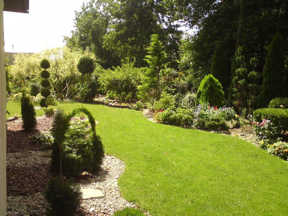 Ogród to moja pasja, spędzam w nim każda wolną chwile. Projektowałam go sama a przy pracy pomagał mi maż. Zaraz gdy kupiliśmy działkę zaczęły powstawać pierwsze rabaty. Minęło 12 lat a ogród ciągle się zmienia. Na zdjęciach widać naturalny stawek i rośliny w najpiękniejszym dla nich okresie kwitnienia. Widać również formowane drzewka które sama przycinałam. W moim ogrodzie jest dużo naturalnych kamieni co również widać na zdjęciach.