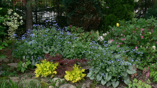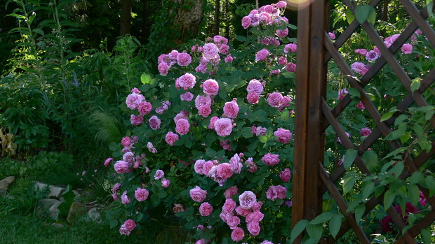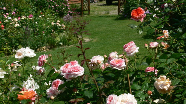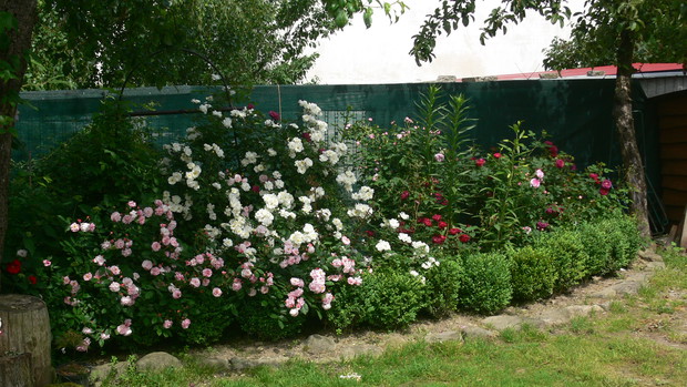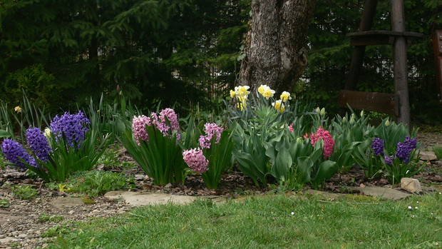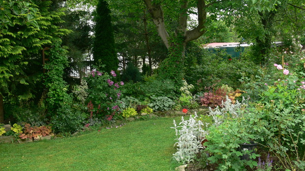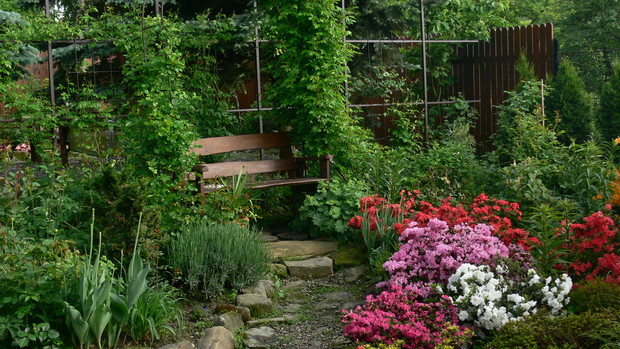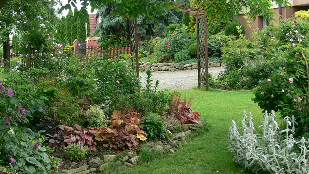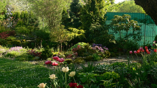 Osiemnaście lat temu wprowadziłam się do domu z ogrodem, a właściwie z namiastką ogrodu. Kilka owocowych drzewek, grządki, zagon ziemniaków. JA dziewczyna z bloków, nie bardzo miałam ochotę na grzebanie w ziemi. Dopiero po kilku latach 'trafiło mnie'. Zaczęłam coś tam sadzić, porządkować otoczenie. Pierwszą inwestycją w kierunku ogrodu ozdobnego było założenie oczka wodnego. Potem już poszło. Rabaty powstawały jedna za drugą. Ostatnia duża ogrodowa zmiana to zakątek z drewnianym tarasem. Wszystko wykonane rekami mojego męża. Dzięki temu mamy dodatkowy pokój. Latem rozkładamy przy nim basen i mamy prywatną plażę, wspaniałe miejsce do spędzania upalnych dni. Ogród urządzony jest z naturalnych materiałów: kamień, drewno. Murki, ścieżki, kaskady powstały przy użyciu okolicznego kamienia. Dzięki temu ogród nie jest obcym tworem, wtopił się w okolicę. Wiosna należy do cebulowych. Najpierw krokusy,hiacynty, potem tulipany rozświetlają pozimową szarzyznę feerią kolorów. W maju rozkwita 'cygańska spódnica' – grupa kolorowych azalii. Ogniste barwy, morze kwiatów i zapachów, widok jest wspaniały. Później nadchodzi pora róż. Od kilku lat to one królują w moim ogrodzie. Aktualnie rośnie w nim ok 100 krzewów. Moje ukochane odmiany to angielki hodowli D.Austina. Piękny kształt kwiatów, urok, zdrowie, zapach wszystko czego oczekujemy od idealnej rośliny, Wraz ze schyłkiem lata pierwsze skrzypce przejmują hortensje bukietowe, trawy, przebarwiające się liście krzewów i drzew. Cały rok w ogrodzie coś zachwyca, przyciąga uwagę. Ogród to dla mnie odskocznia od codziennych problemów, miejsce na wyciszenie się, poleniuchowanie, ale i ciężka pracę dającą niesamowita satysfakcję. To po porostu moje miejsce na ziemi.