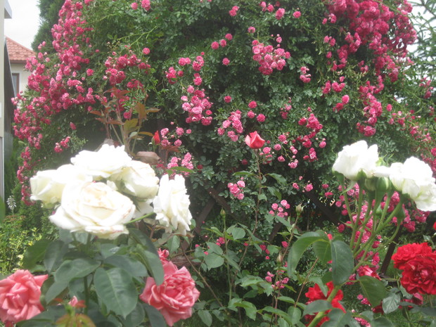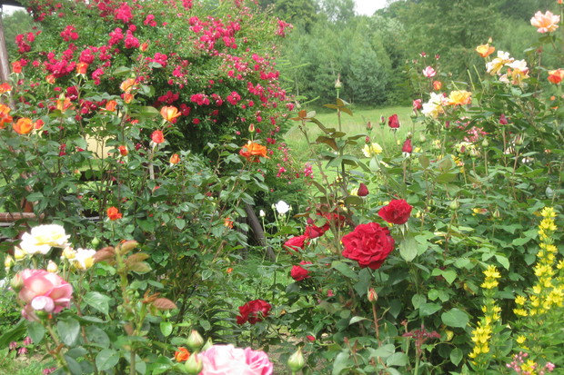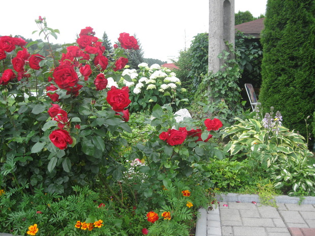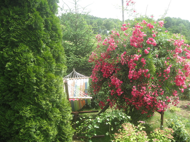 Mój ogród ma 10 ar.to tylko parę róz ,mam ich 40 szt.wszystkie mają duszę.Po pracy cała rodzina,odpoczywa. Kwiaty w moim ogrodzie kwitną już od marca do póżnej jesieni.W naszym górskim klimacie wszystkie różę,hortensje,różaneczniki ,hibiskusy,budleje,muszą być zabezpieczone na zimę,każdy kwiat owijamy workami jutowymi każdy kwiat indywidualnie.W tym pomaga mi mąż i syn.Mamy też problem w wodą,nawodnić tyle kwiatów potrzeba hektolitry wody,podczas upałów kwiaty podlewamy na raty,kwiaty,to wiedzą:) ten rok jest szczególnie bezdeszczowy,mimo tego tak kwitną .róże,które dodałam to róze wielkokwiatowe,lilie trąbiaste,rożowa,żółta bordowa,pomarańczowa.Mój ogród jest jeszcze nie ogrodzony,z pobliskiego lasku przychodzą sarenki,bardzo im smakują pączki róż,niekiedy biedulki padają ofiara,co opóznia kwitnienie.