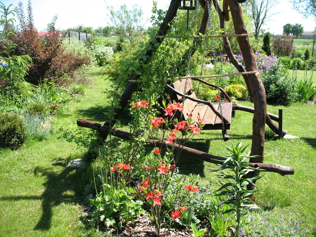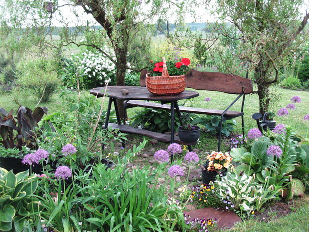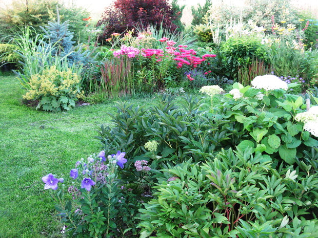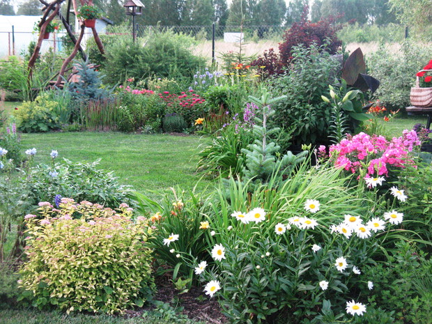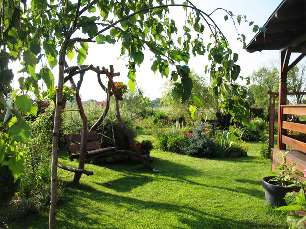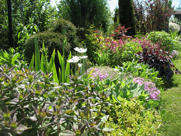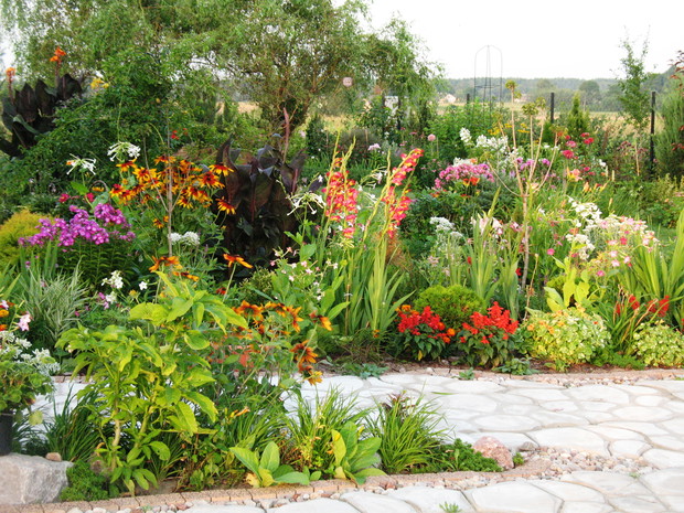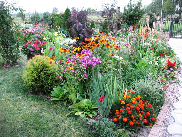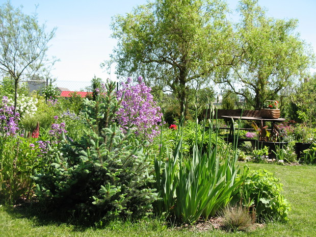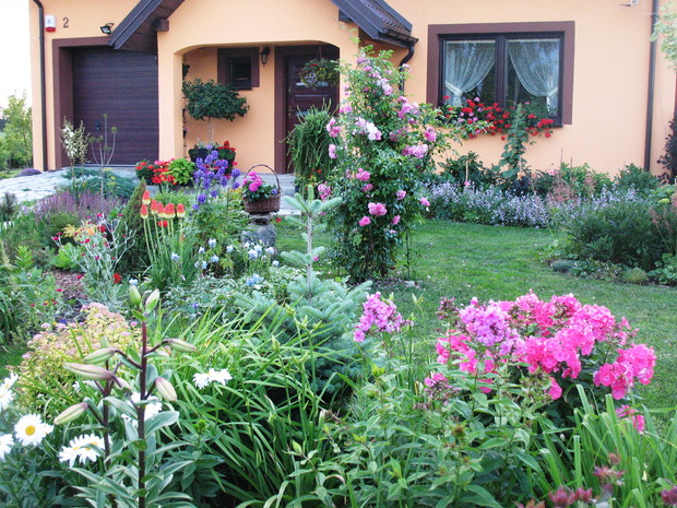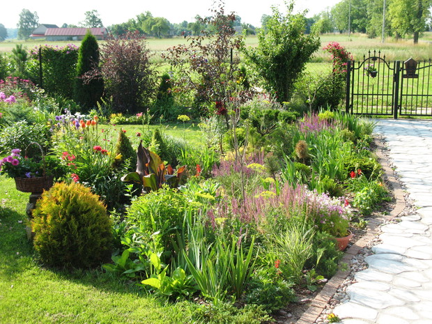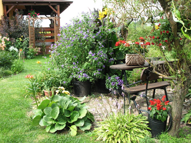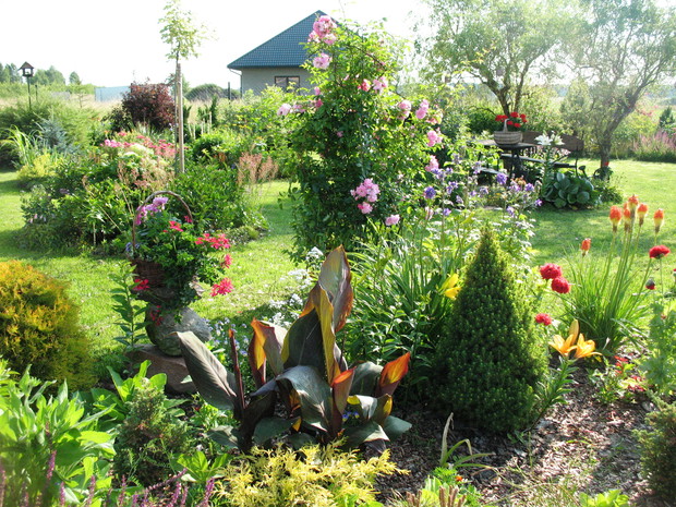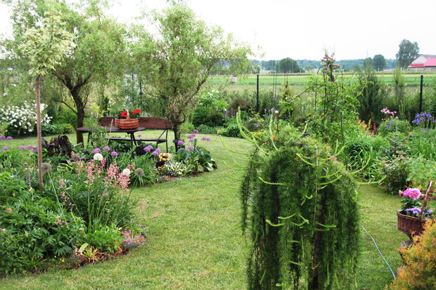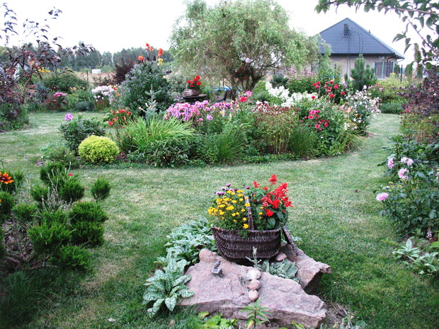 Mój ogród nie jest dojrzały. Jeszcze nie tworzy go gęstwina gałęzi i liści. Jeszcze. Na razie to królestwo bylin, które pysznią się barwami tęczy od wiosny do późnej jesieni. I te nasadzenia równie mocno przyciągają wzrok, podobnie jak dojrzałe 'uroczyska'. Kocham zmienność w ogrodach i wiejski klimat. Dlatego osnową ogrodu są głównie drzewa i krzewy liściaste:brzozy, wierzby, lilaki, derenie. Oczywiście świerki, jodły, modrzewie i tuje też wychylają się z gęstwiny kwiatów. Niemniej nie grają tu pierwszych skrzypiec. Na razie to kwiaty są dominantą. Te pospolite znane z ogrodu babci: floksy, irysy, rudbekie, tulipany, róże i oczywiście moje ukochane dalie oraz te mniej popularne: eukomisy, agapanty, tytonie, odmianowe szałwie i wiele innych. Podobnie jak na bylinach wzrok zatrzymują rośliny pojemnikowe. Są one moim oczkiem w głowie, równie ważnym jak kwiaty zimujące. Datury, kanny, psianka Ranottiego, lantany czy pelargonie rosną doskonale odwdzięczając się za ziemię z dodatkiem kompostu lub obornika wspaniałymi rozmiarami i kwitnieniem. Zresztą własny kompost to niesamowite 'czarne złoto' także dla warzywnika, jagodnika i sadu, które od lipca zaopatrują nas we własne warzywa i owoce. Sam ogród powstał z potrzeby serca. To dla ogrodu wyprowadziliśmy się z miasta. To tu się relaksujemy i tu jest nasza enklawa-moja, mojego męża i małego Jakuba, który już ma zadatki na ogrodnika. I chociaż dojeżdżam do pracy 2 godziny to nie zamieniłabym się by znów mieszkać w bloku w mieście.