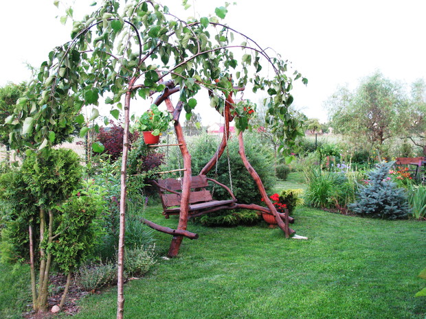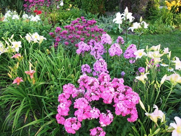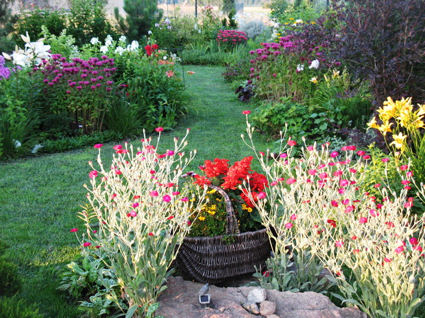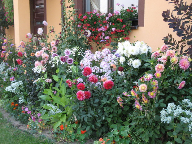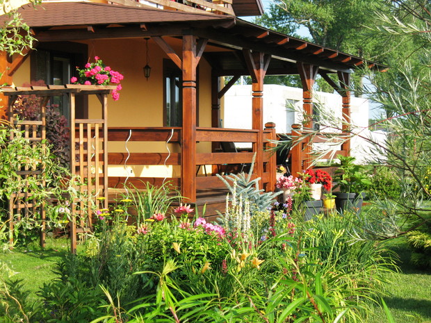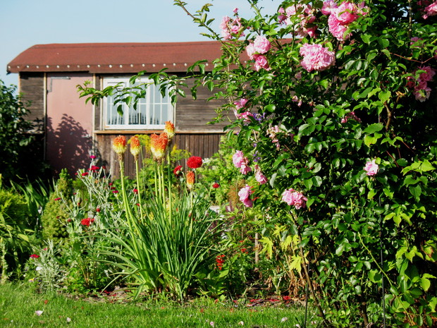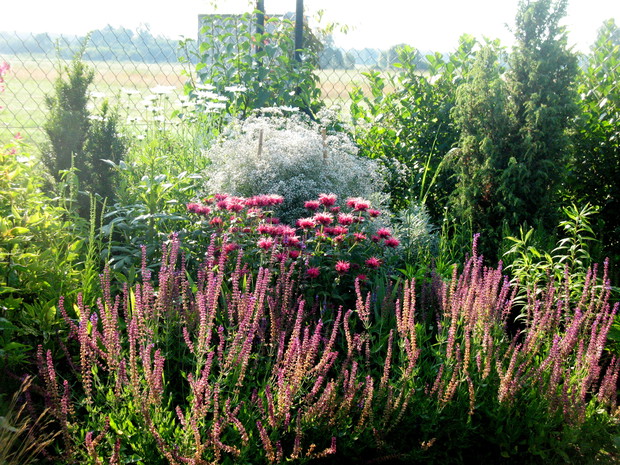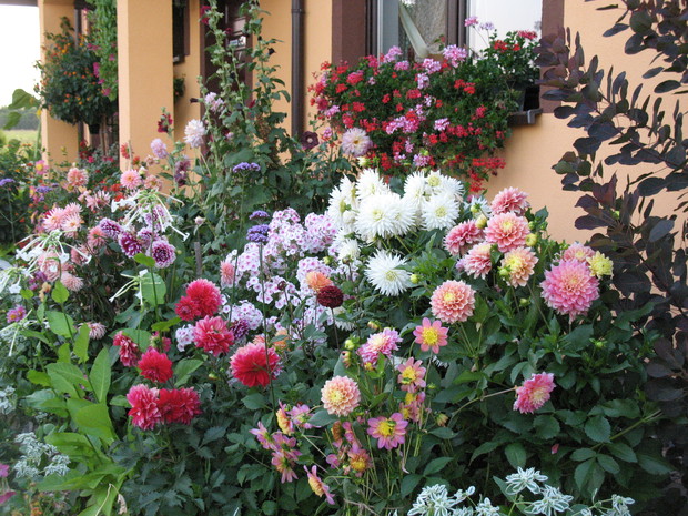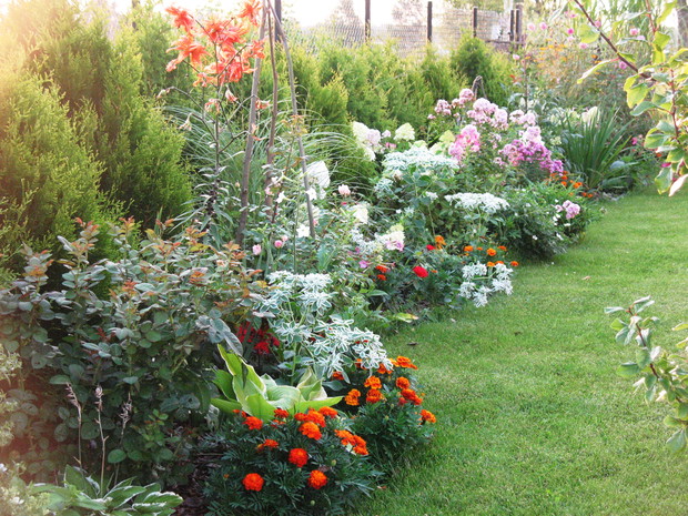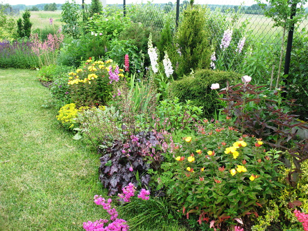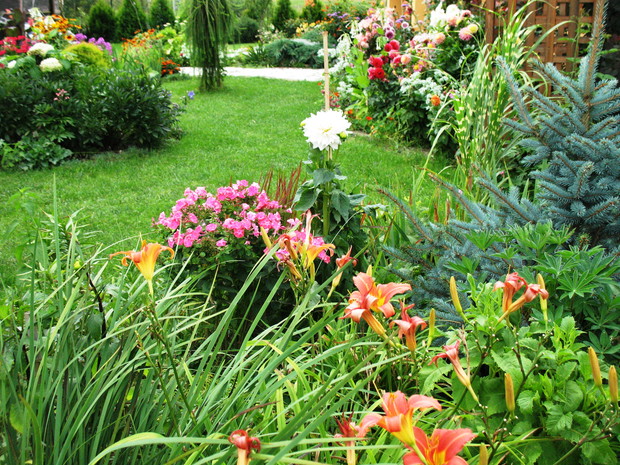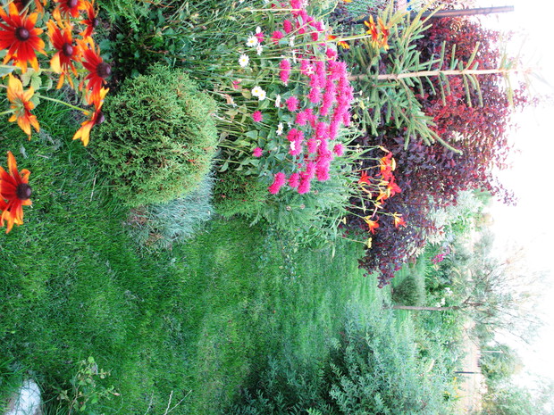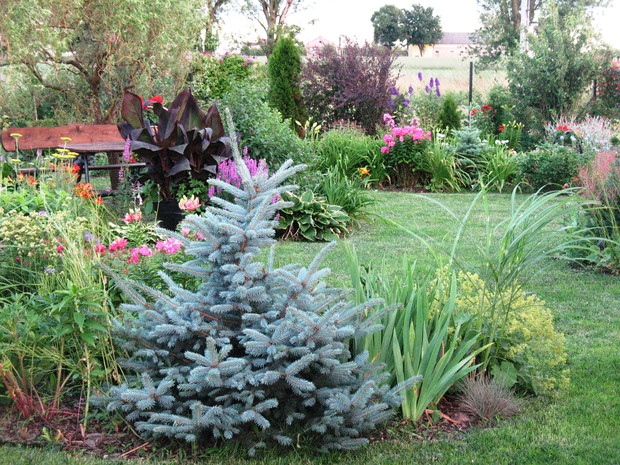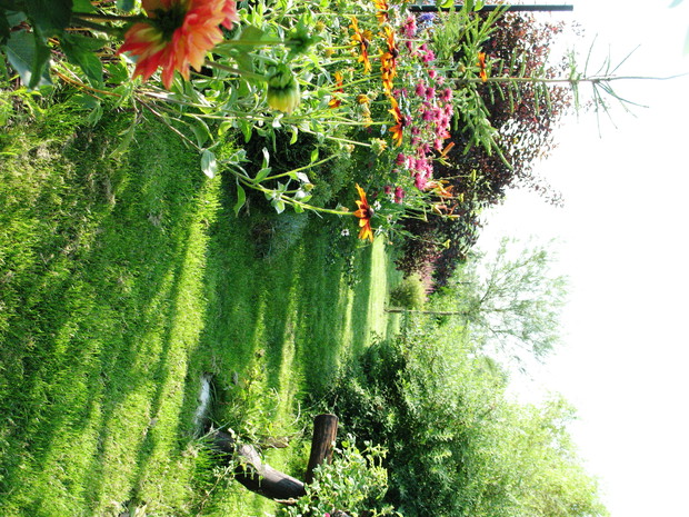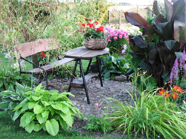 Mój ogród nie jest dojrzały. Jeszcze nie tworzy go gęstwina gałęzi i liści. Jeszcze. Na razie to królestwo bylin, które pysznią się barwami tęczy od wiosny do późnej jesieni. I te nasadzenia równie mocno przyciągają wzrok, podobnie jak dojrzałe 'uroczyska'. Kocham zmienność w ogrodach i wiejski klimat. Dlatego osnową ogrodu są głównie drzewa i krzewy liściaste:brzozy, wierzby, lilaki, derenie. Oczywiście świerki, jodły, modrzewie i tuje też wychylają się z gęstwiny kwiatów. Niemniej nie grają tu pierwszych skrzypiec. Na razie to kwiaty są dominantą. Te pospolite znane z ogrodu babci: floksy, irysy, rudbekie, tulipany, róże i oczywiście moje ukochane dalie oraz te mniej popularne: eukomisy, agapanty, tytonie, odmianowe szałwie i wiele innych. Podobnie jak na bylinach wzrok zatrzymują rośliny pojemnikowe. Są one moim oczkiem w głowie, równie ważnym jak kwiaty zimujące. Datury, kanny, psianka Ranottiego, lantany czy pelargonie rosną doskonale odwdzięczając się za ziemię z dodatkiem kompostu lub obornika wspaniałymi rozmiarami i kwitnieniem. Zresztą własny kompost to niesamowite 'czarne złoto' także dla warzywnika, jagodnika i sadu, które od lipca zaopatrują nas we własne warzywa i owoce. Sam ogród powstał z potrzeby serca. To dla ogrodu wyprowadziliśmy się z miasta. To tu się relaksujemy i tu jest nasza enklawa-moja, mojego męża i małego Jakuba, który już ma zadatki na ogrodnika. I chociaż dojeżdżam do pracy 2 godziny to nie zamieniłabym się by znów mieszkać w bloku w mieście.