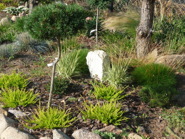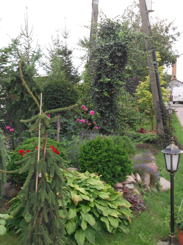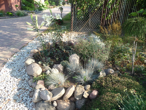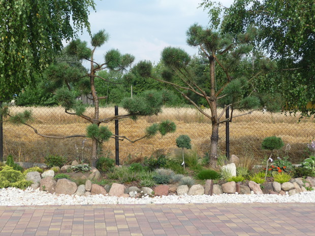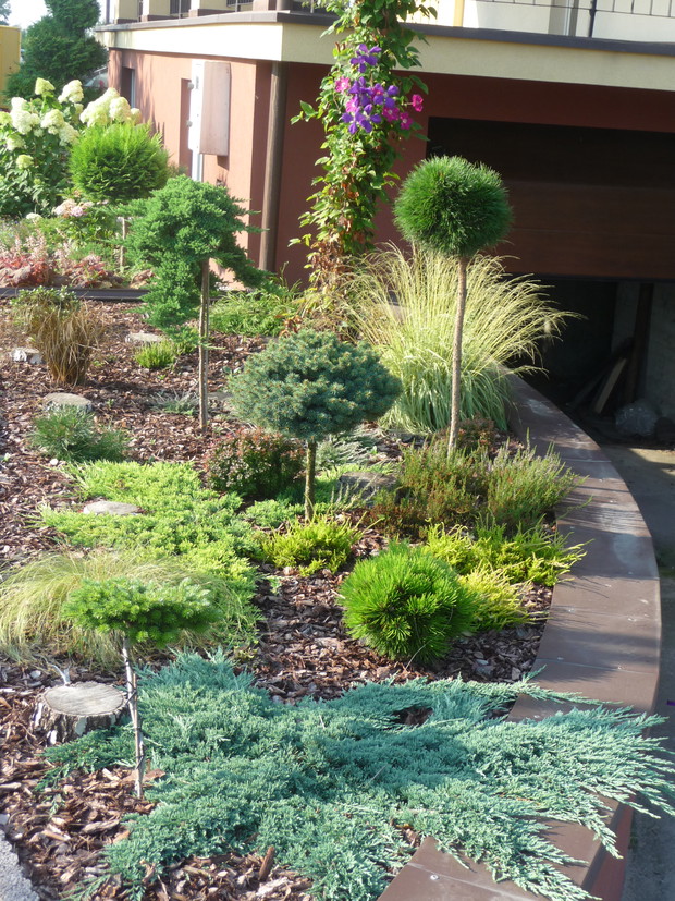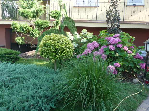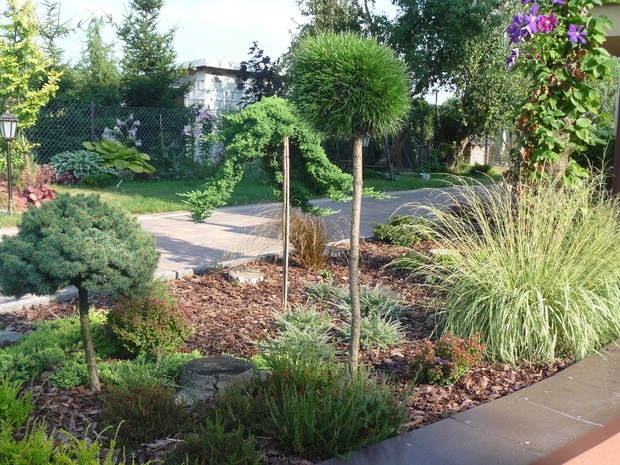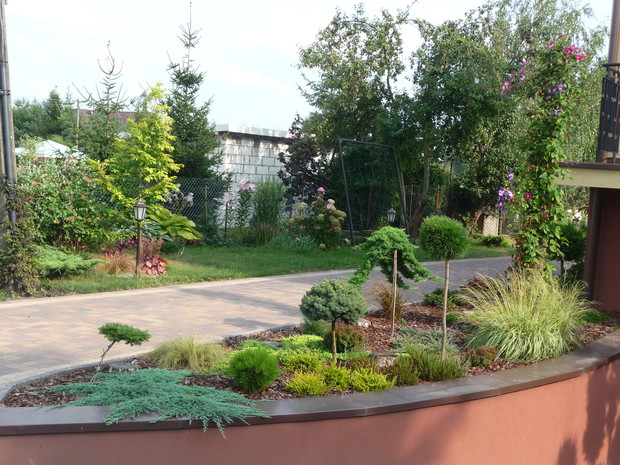Od kilku lat każdą wolną chwilę spędzam w swoim ogrodzie. Najstarsze okazy rosną tam od około 18 lat, chociaż większość z nich jest młodsza. W ciągu ostatnich kilku lat powstały skalniaki zbudowane z dużej ilości kamieni. Wraz z mężem zbieramy je na pobliskich polach i układamy z nich przepiękne rabaty. Są tam dwa wrzosowiska z różnokolorowymi wrzosami. Obok nich rosną trawy: kostrzewy, molinie, turzyce, ostnice oraz małe iglaki: płożące jałowce, szczepione sosny i jodły. Wokół dwóch strzyżonych sosen powstało duże wrzosowisko. Wiosną kwitną tu azalia i dwa różaneczniki. Moją miłością są przepiękne hortensje. Mam ich w swym ogrodzie kilka. Zarówno ogrodowe jak i bukietowe. Najpiękniejsza jest hortensja niebieska, która dzięki troskliwej pielęgnacji zachwyca wszystkich przepiękną barwą. Równie dekoracyjne są różnokolorowe żurawki. Znajduje się tu ich kilka odmian. Wiosną ogród zdobią liczne rośliny cebulowe. Pierwsze rozwijają się krokusy, później wiele hiacyntów i oczywiście mnóstwo tulipanów. Jesienią natomiast zakwitają trawy, wrzosy i jeżówki. Ogród ten nie jest urządzony w jakimś konkretnym stylu. Elementem powtarzającym się w ogrodzie są rabaty z kamieniami. Jednak przez swoją różnorodność jest bardzo dekoracyjny od wiosny do późnej jesieni. Zimą iglaki zasypane śniegiem i zaschnięte kwiatostany traw tworzą niepowtarzalny klimat. W moim ogrodzie rośnie wiele iglaków: jałowce, sosny, jodły, cyprysiki i przepiękny świerk inversa. Znajdują się tam również krzewy liściaste: czerwone i żółte berberysy, czerwony buk, zimozielona trzmielina, czerwony perukowiec i oczywiście krzewy hortensji. Rośnie tu również wiele bylin i roślin jednorocznych. Taki ogród to bardzo dużo pracy, która przynosi jednak wiele satysfakcji i cieszy oko każdego dnia.