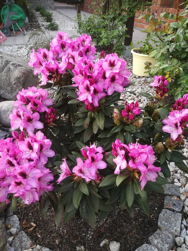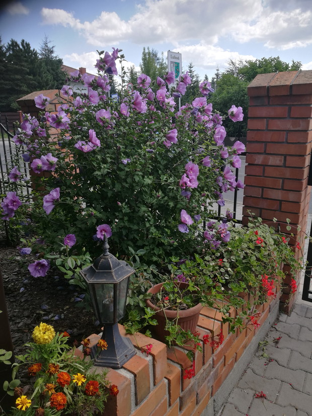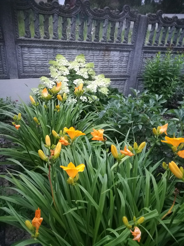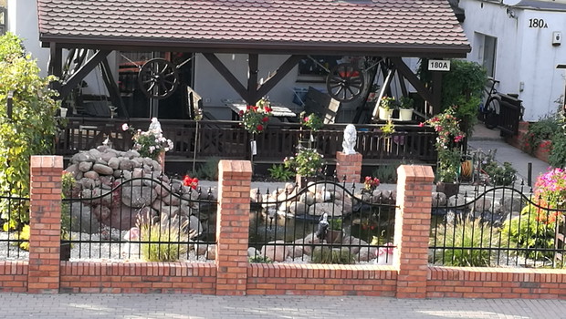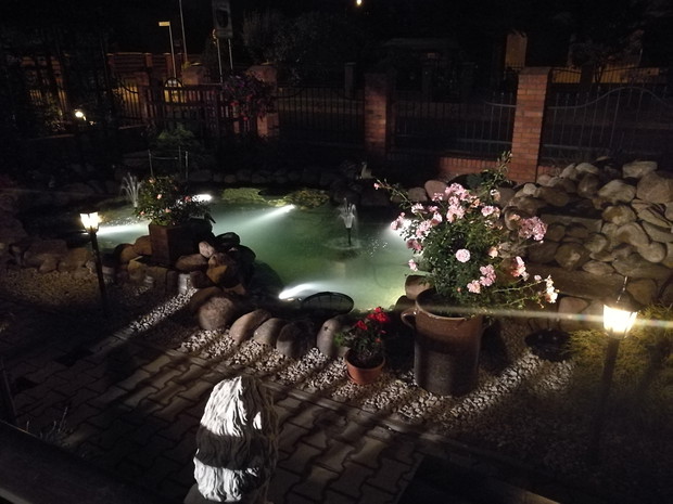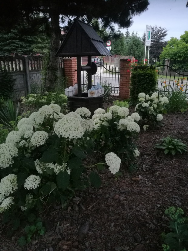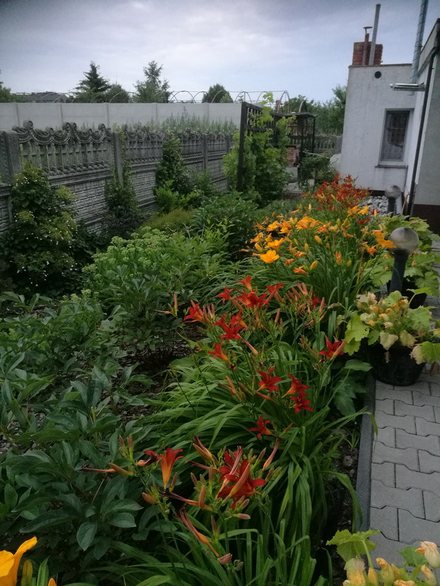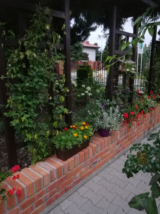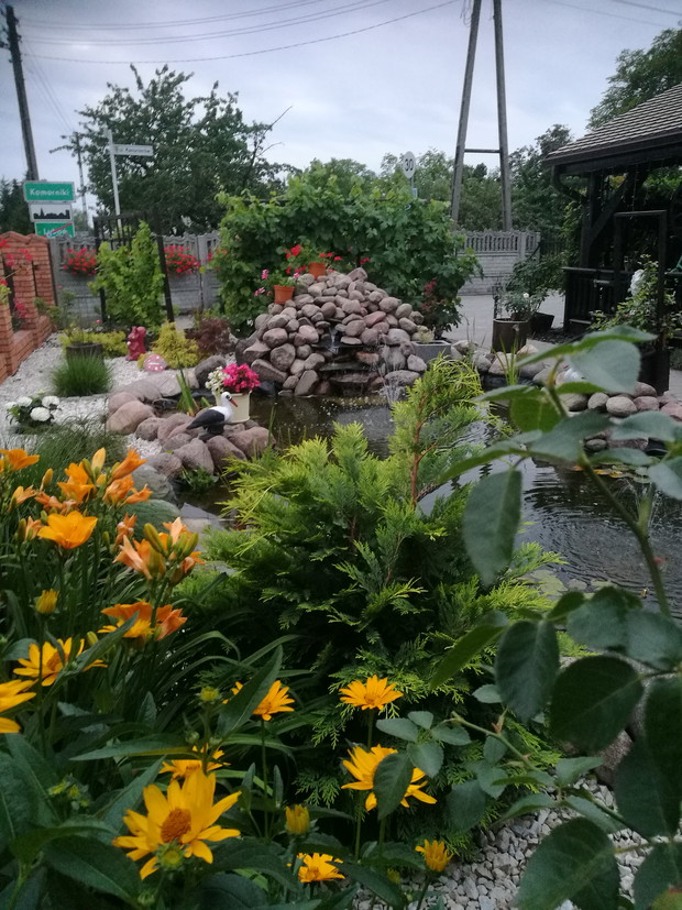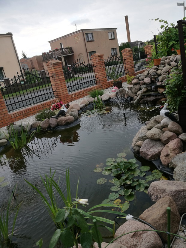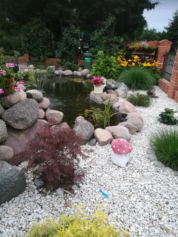 Nasz ogród powstaje od 2013 roku po skończnej budowie.W pierwszym roku jego założenie brzmiało ogród w stylu wiejskim.Po każdej wizycie w sklepach ogrodniczych nabywaliśmy rośliny dostosowane do ogrodów wiejskich....Były to rozchodniki,lawendy,róże,hortensje ogrodowe i bukietowe,miskanty,floksy,malwy,powojniki,żurawki i funkie liliowce w wielu odmianach..Następnie postanowiliśmy zrobić nasadzenie drzew zakupiliśmy różnego rodzaju iglaki i głóg Scarlet Nana.Jednak w ubiegłym roku doszliśmy do wniosku że zmienimy wygląd naszego ogrodu i postanowiliśmy wybudować oczko wodne.....Początkowo miało być ono małe jednak w trakcie prac nastąpiła zmiana decyzji i powstał staw.Znalazło się w nim miejsce do karpików Koi płoci,amurów,leszczy i karasi ozdobnych.Jednak całą ozdobą są żaby wygrzewające się na kamieniach.Również rośliny znalazły swoje miejsce są to lilie wodne,irysy,kaczeńce,trzciny oraz tatarak.W tym roku ozdobą naszego ogrodu stały się dwa klony ;palmowy i czerwony kolumnowy.Nasz ostatni zakup to dwa buki Tri Color.Cały ogród jest pięknie oświetlonyi coraz bardziej dostosowany do stylu japońskiego....Są w nim murki ,kamienie ,pergole i trejaże.Wiele gatunków roślin zakupiona została na targach Gardenia i w niemieckich szkółkach roślin...Jest to nasza oaza spokoju podziwiana przez wszystkich.....Dodadkową zaletą jest fakt że wszystkie prace wykonaliśmy rodzinnie miło spędzając czas.....