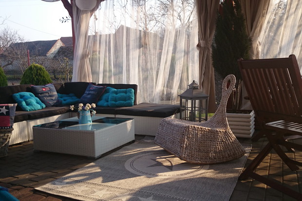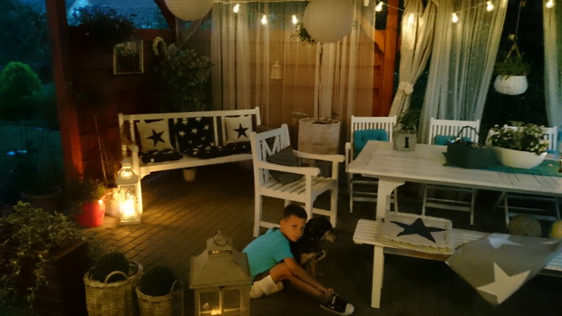Nuta egzotyki, szczypta dyskretnego luksusu, klimat pełnego relaksu i spokoju. Taras, który stanowi miejsce wypoczynku i rekreacji dla całej rodziny. Przebywamy w nim każdą wolną chwilę, a zdarzyły się też nocki. Super efekt dają solarne lampiony świecące prawie do świtu. W planach mamy jeszcze barierki krzyżowe i przemalowanie całej altany-tarasu na kolor biały i szary i położenie desek na podłodze.