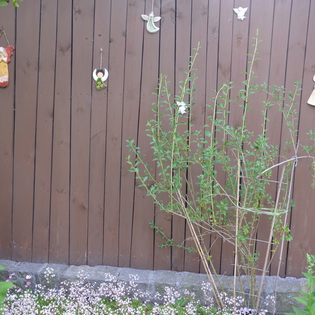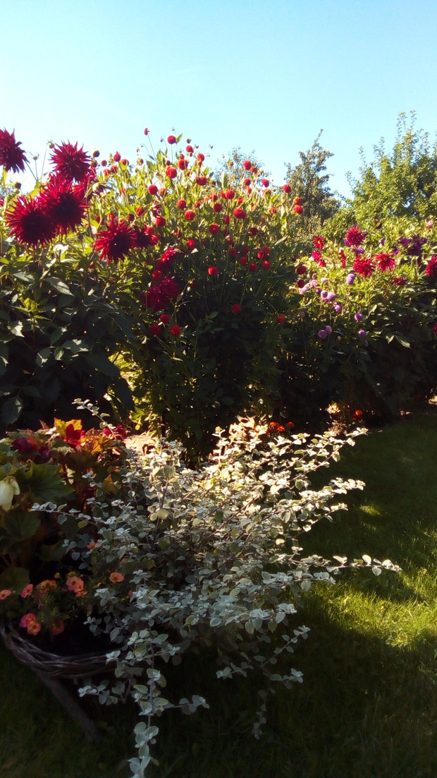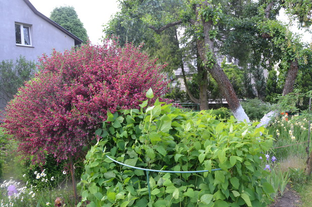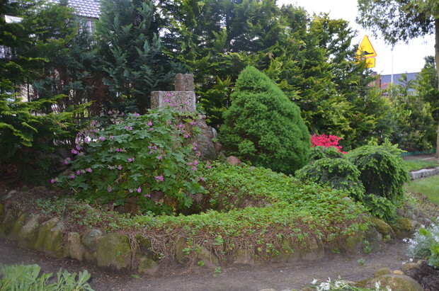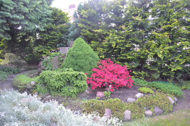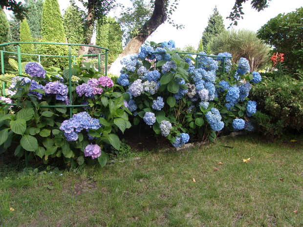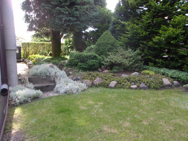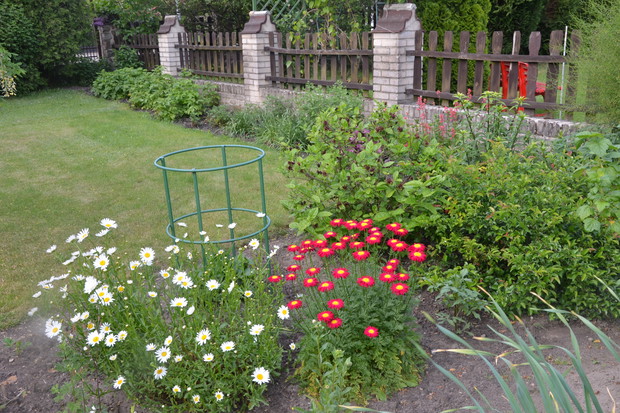 Mój ogród jest bardzo stary. Od wczesnej wiosny, do późnej jesieni, a nawet zimy, kwitną kwiaty. Wczesną wiosną witają rabaty z tulipanami, narczyzami, żonkilami. Kwitną krokusy, cebulice, hiacynty, nieco później podziw budzą piękne kwiaty porzeczki ozdobnej oraz zapachem przypominającym lipę - krzaczasta hortensja. Są też 2 czerwone azalie, złotokap, amarantowy szczodrzeniec i przepiękny o pełnych kwiatach (przypominających białe różyczki) jaśmin. W moim ogrodzie są też rzadko spotykane rośliny - kokorycz wielokwiatowa, lilie złotogłów i tygrysie. Na początku lata, w całej krasie prezentują się w całej krasie 2 krzewy parzydła leśnego, kwitną kremowe, niebieskie i różowe hortensje. W cienistej części ogrodu rosną funkje. Są też białe i amaranowe serduszka, okazałe pełniki i bergenie. Co roku wysadzam też rabatę mieczyków oraz dalii pomponowych. Wysiewam cynie wielkokwiatowe oraz astry. Ogród jest bardzo duży, a więc obok bardzo dużej ilości kwiatów, jest też kącik z ziołami. Uprawiam oregano,bazylię (wysiewam z zebranych w poprzednim roku nasion), miętę pieprzową, melisę, szałwię lekarską, majeranek. Jest też część przeznaczona na warzywa, a nawet poletko ziemniaków. Zebrane plony zaspokajają potrzeby rodziny na całą zimę. Są też drzewa owocowe i trawnik, gdzie przy dobrej pogodzie można napawać się pięknem ogordu i biesiadować. Nad "bezpieczeństwem" ogrodu czuwają anioły, które sfrunęły na ścianę szopy z narzędziami. Jest też niezwykłą budowla - zamek warowny z fosą.