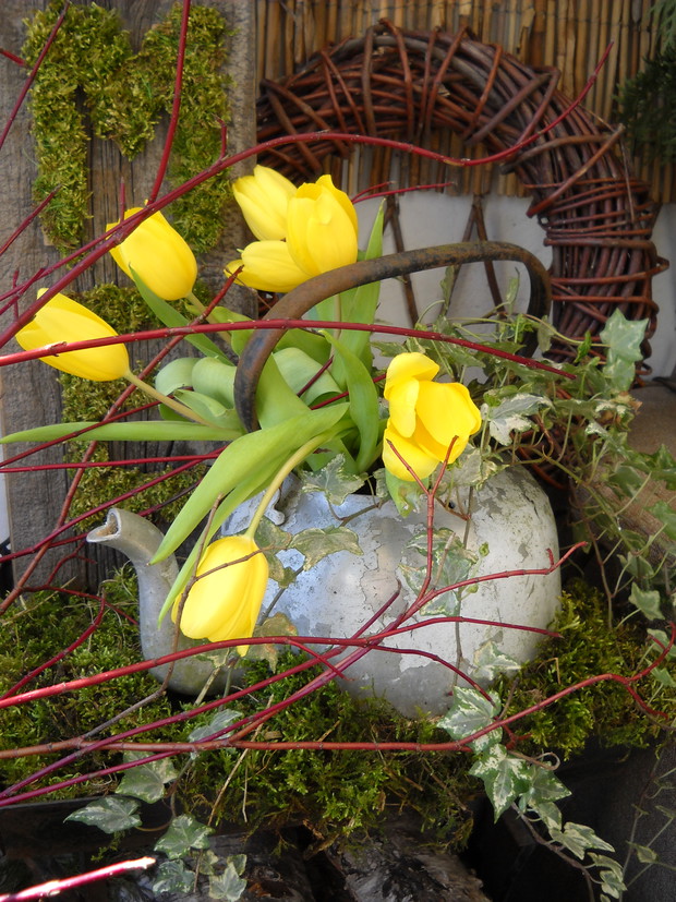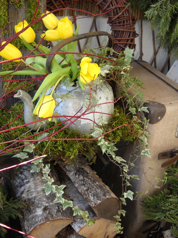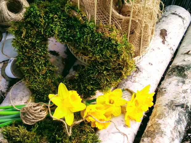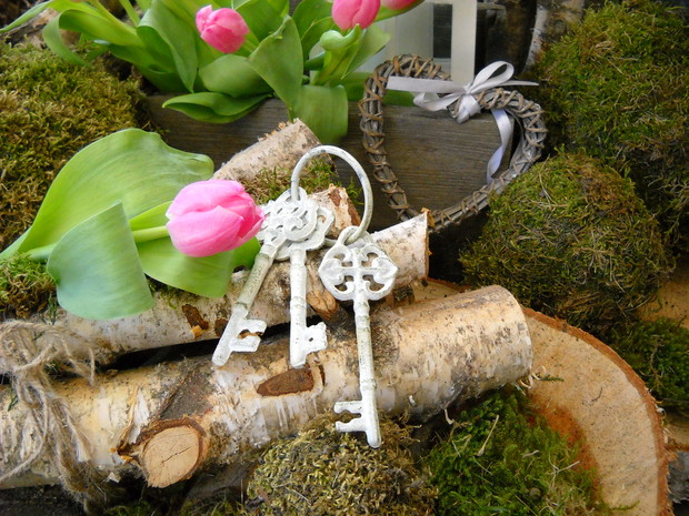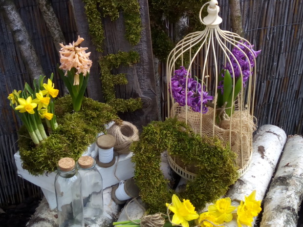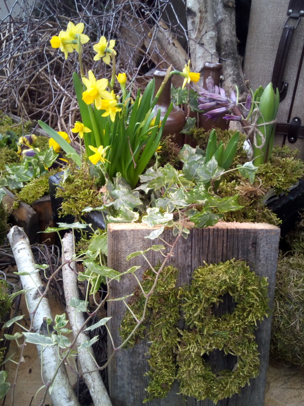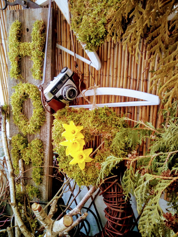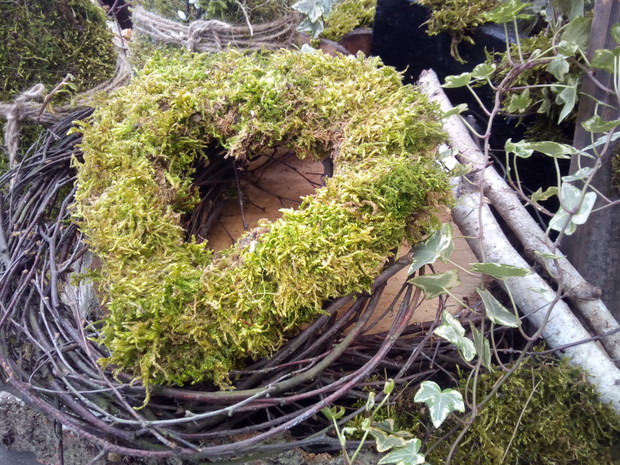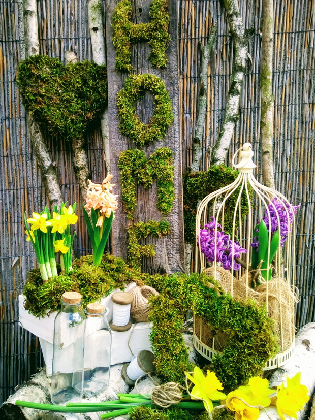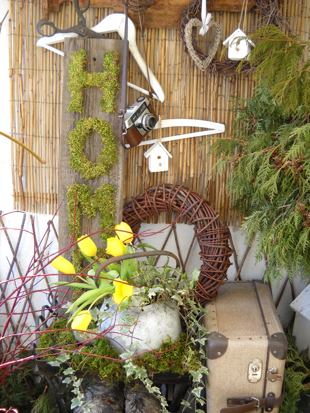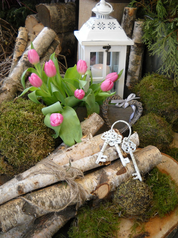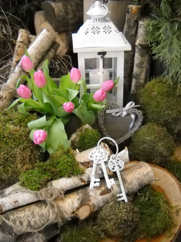 Wcześniej przygotowane ozdoby takie jak: serca, napis HOME,kule wszystko zrobione z mchu wykorzystałam do mych naturalnych aranżacji z dodatkiem brzozowych patyków i starych przedmiotów.Natura daje nam wiele więc warto ją wykorzystać i cieszyć się jej pięknem tym bardziej że mamy ją na wyciągnięcie ręki.